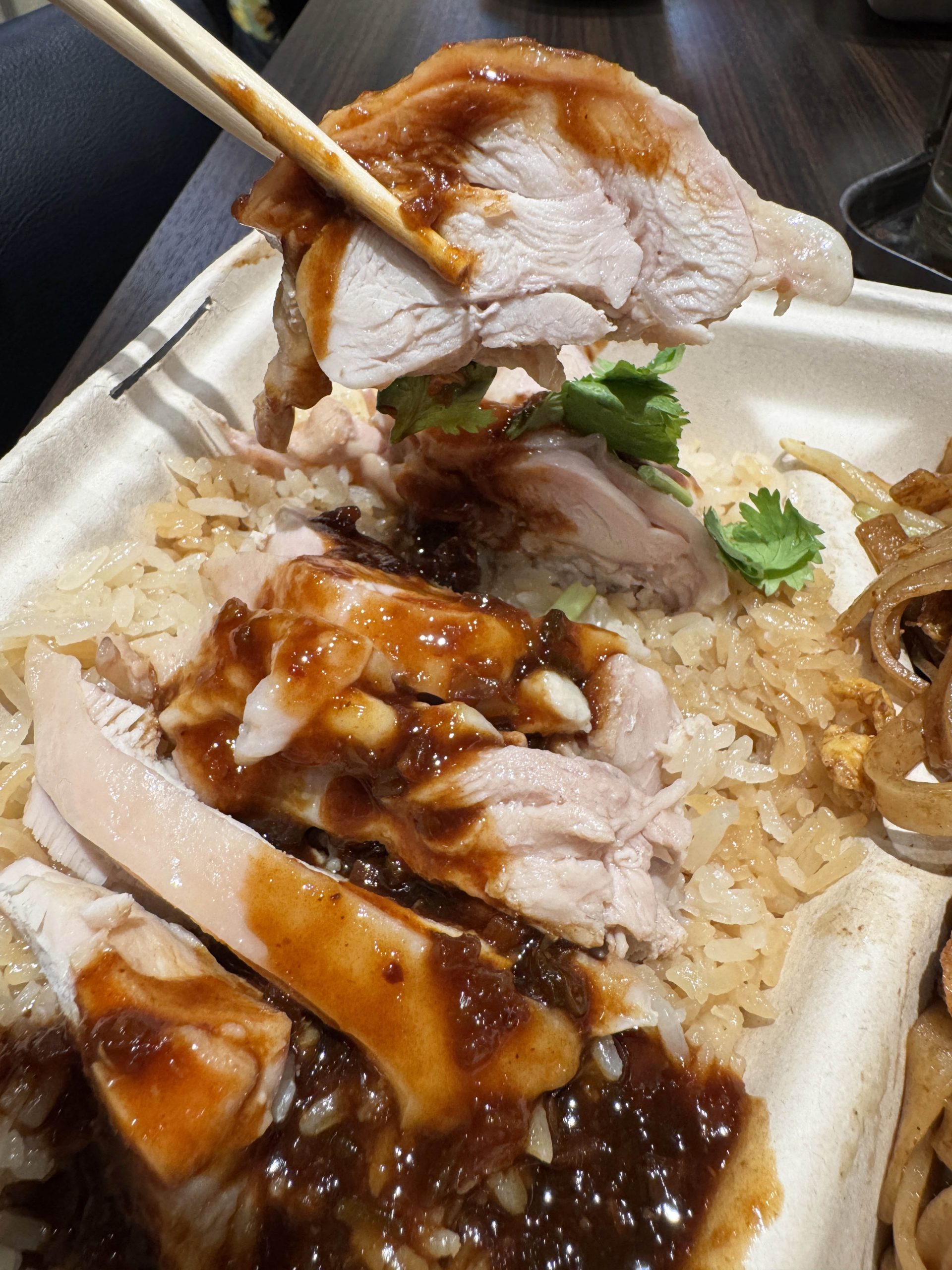 カオマンガイとパッタイ、実際に食べてみた! おおっ!! カオマンガイのチキン、けっこう弾力があるもの!! 最近は流行っているのかな!! 弾力があるカオマンガイ!! 弾力ある系のカオマンガイ屋さんが日本で増えている気がする。