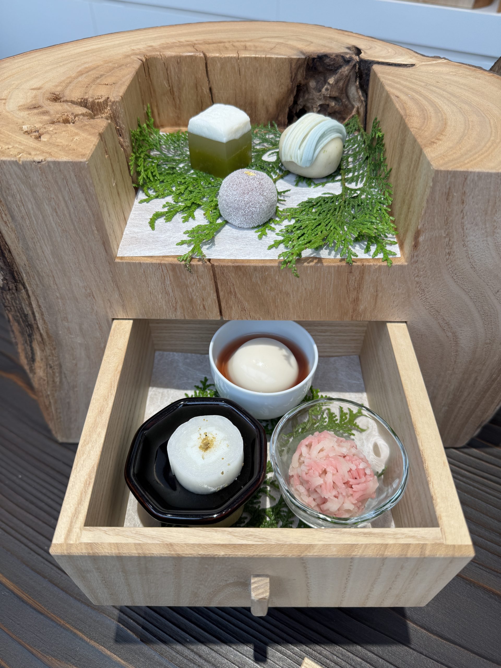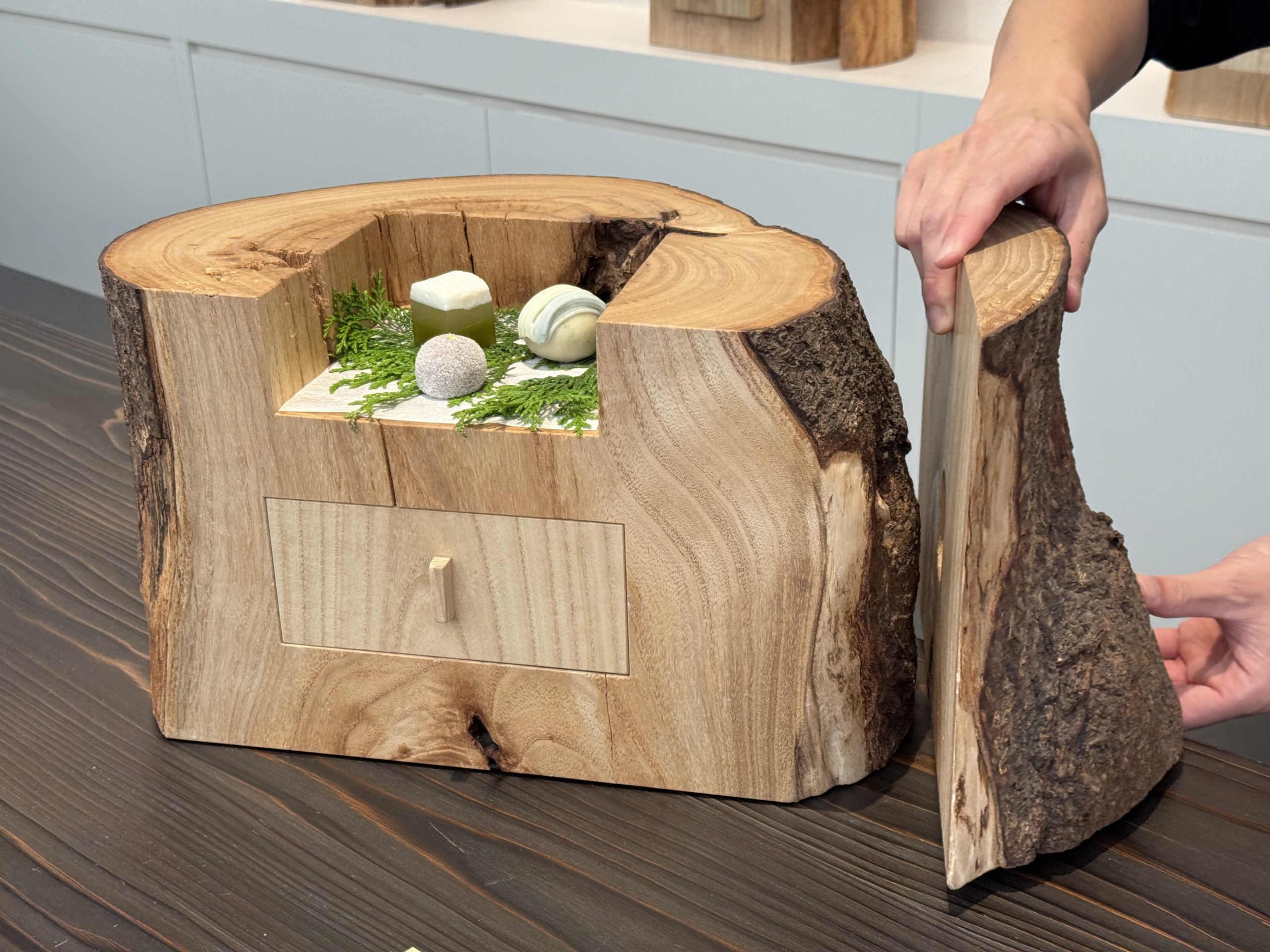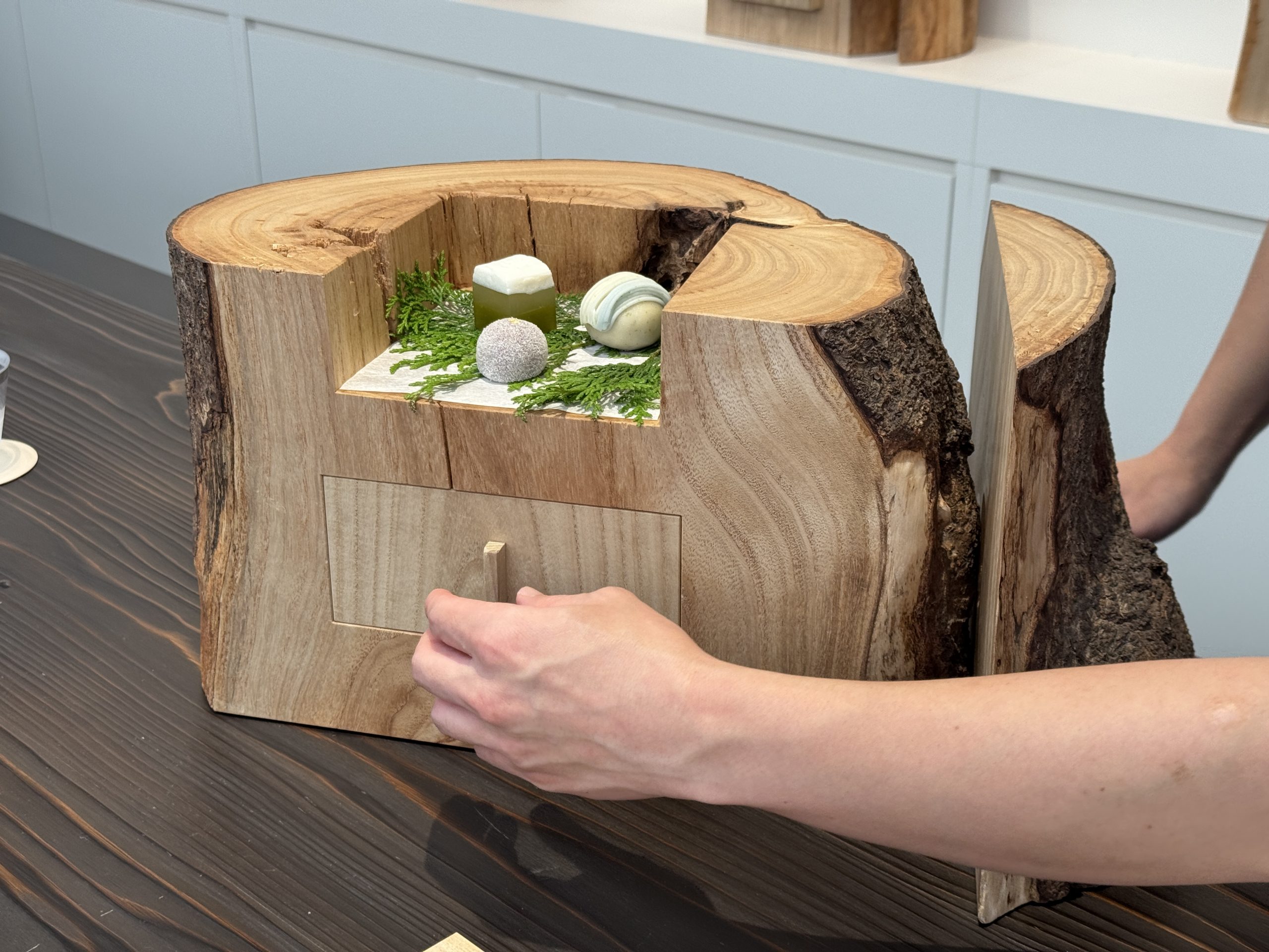 なにより、和スイーツの提供方法が驚きだ! 切株!? とにかく木の中から和スイーツの数々が現れるのだ! ちょっとこれは予想外の展開! まさに、もっともプリミティブな感じ!