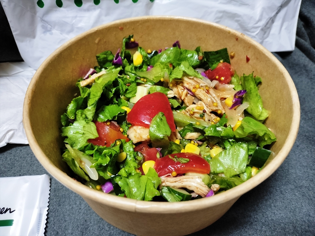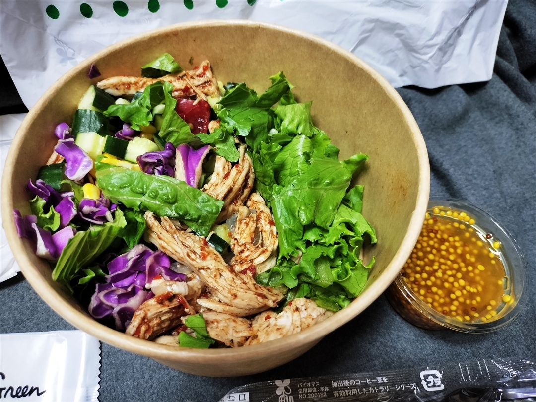 もうひとつ「BBQチキンとたっぷり夏野菜のサラダ」はテイクアウトとした。10種以上のスパイスで味付けしたスモーキーなBBQチキンと、太陽をたっぷり浴びた夏野菜が入ったボリュームサラダである。例によってお昼時に作ってもらい、35度近くまで上がった気温の中を取材して歩き回り、その間サラダは持ち歩き続けて夕食に食べるのである。