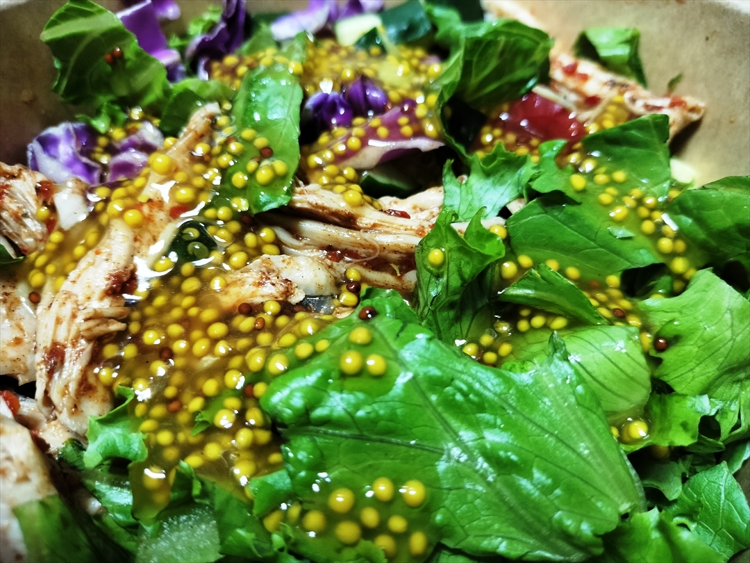 ここでも注目したのはドレッシングだ。ハニーマスタードという相反する味に思える組み合わせが食欲を増進させるから不思議だ。マスタードとはいえ、そこらの出来合いのものではなく、粒マスタードを使用した本物だ。いわゆる西洋マスタードのうち米国由来のイエローマスタードよりは辛くなく酸味も少なく風味が高い。それにはちみつを加えるのだから、「甘辛い」ドレッシングでBBQチキンを含めて全部に混ざって美味しいのだ。Mサイスにして失敗した、Lサイズにしておけばよかったと思ったくらいだ。