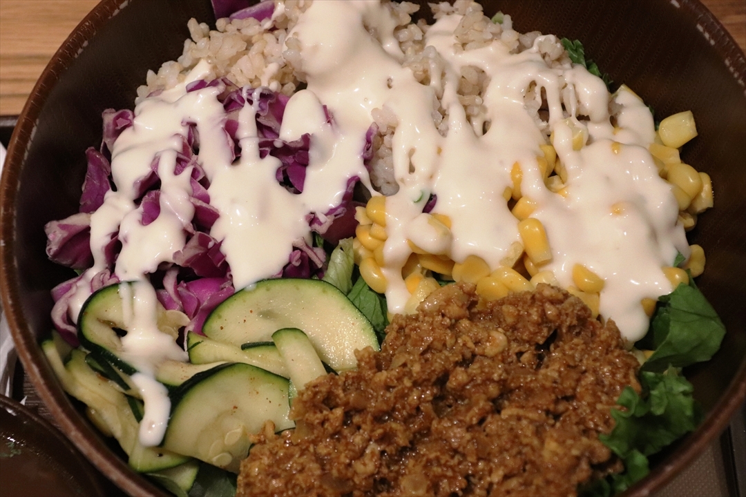 玄米とキーマカレーですでにカレーライス調になっているのだが、そもそもサラダなので冷製というところに注目したい。熱いものをモリモリ食べられるのであれば苦労はしない。そこで冷たくてちょっぴり辛いキーマカレーを食べながら、同時にサラダをいただく「同時性」がしっくりと合うから不思議だ。