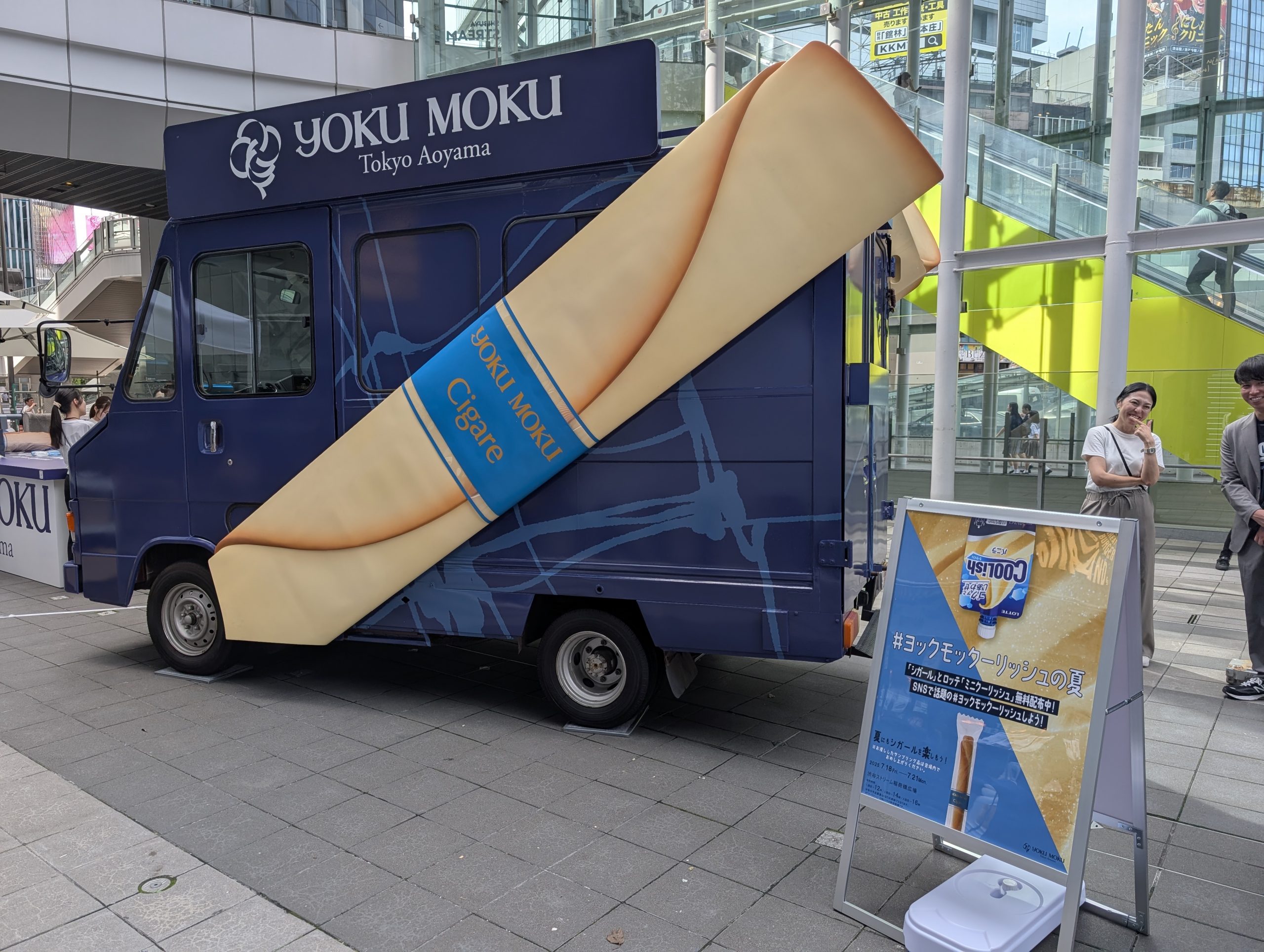 そこで“#ヨックモックーリッシュ”を楽しめる無料サンプリングを実施。ヨックモックの代表商品「シガール」2本を無料配布するほか、特別コラボ企画「#ヨックモックーリッシュの夏」として、ロッテの「ミニクーリッシュ バニラ」を併せて配布。会場には昨年好評だったというサンプリングトラック「BLUE GIFT TRUCK」が今年も登場。 SNSでも話題となった夢の共演を、リアルな体験としてお届けする初の試みとなった。