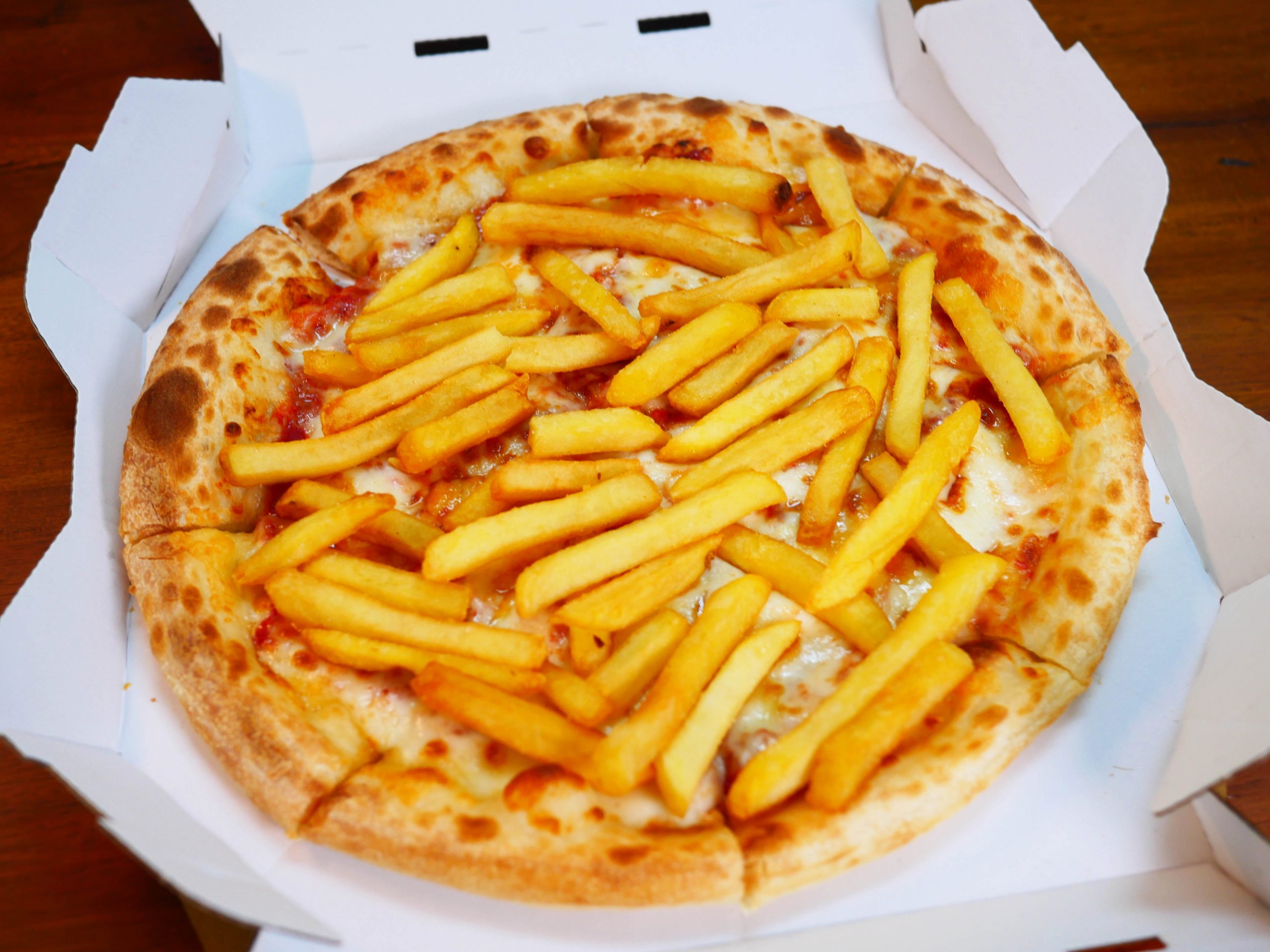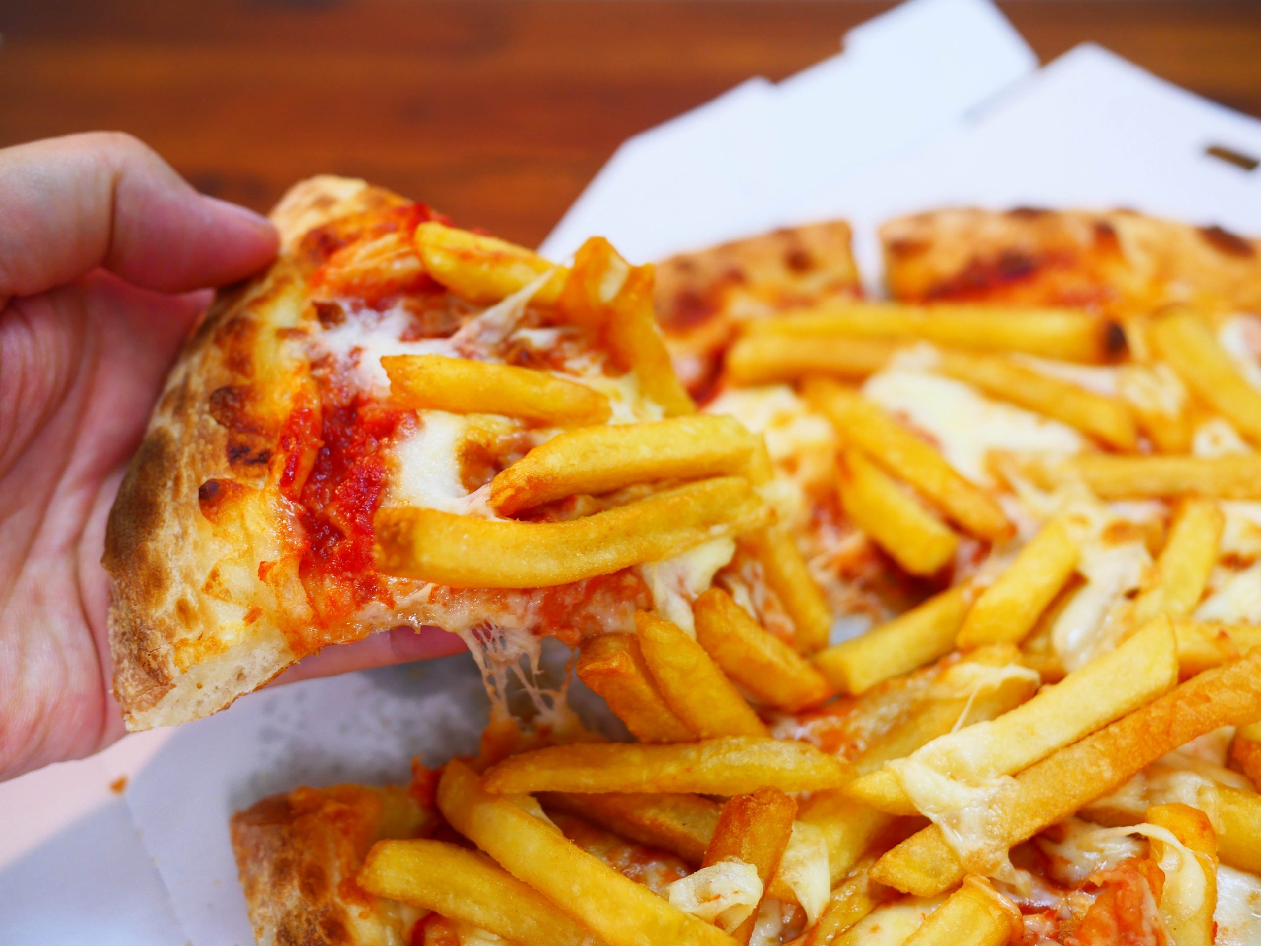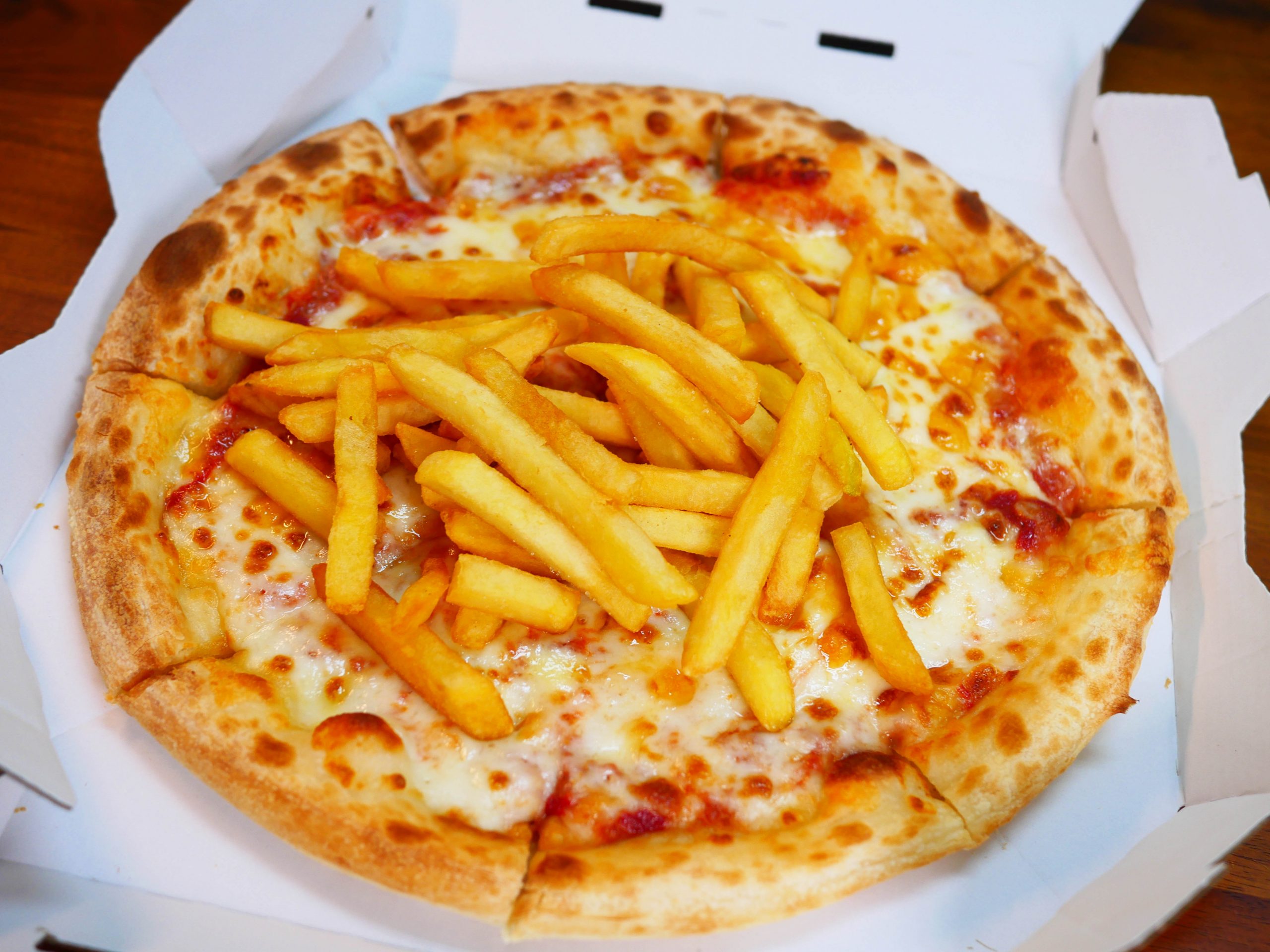 マッシさんのコメントを読んでから、すぐに試してみた。フライドポテトのせピザを食べてみた。