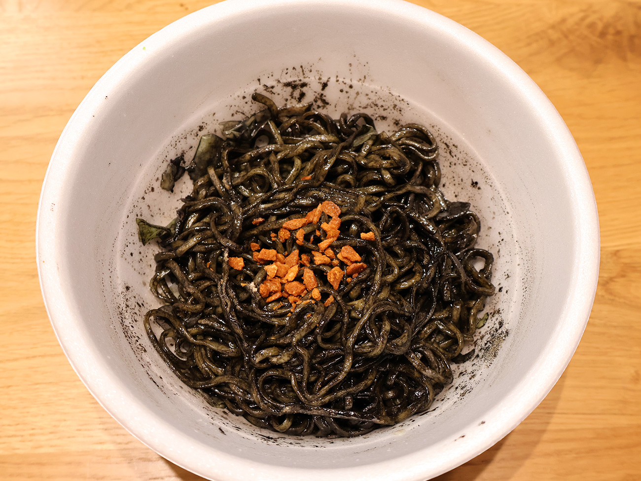 イカ墨のまぜそばなので、見た目は見事に真っ黒。かやくにイカとかキャベツが入っているのにまったく判別できなくなっています。しかもトリプルガーリックだっていうし、味も強烈そうだな〜なんて思っちゃうんですけど、これが以外にも繊細な味。ニンニクマシマシというか“イタリアンのガーリック”っていう感じにまとまっていて、ものすごく美味しい!