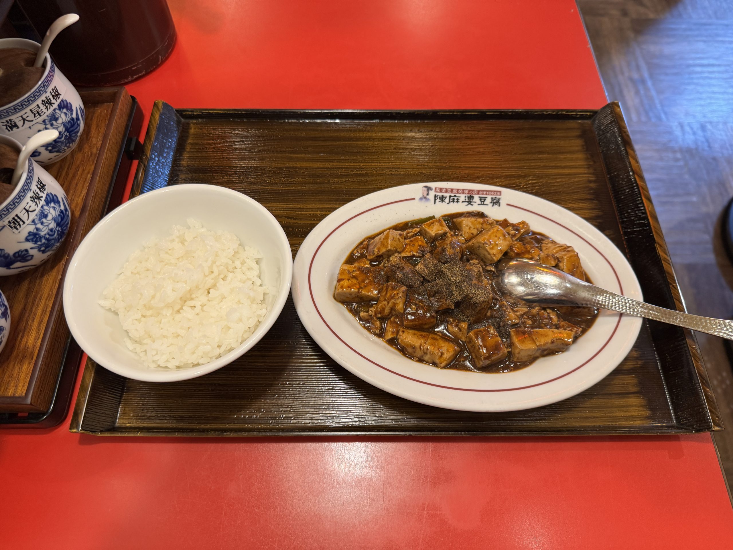 メニューを見てみると、あった「正宗陳麻婆豆腐」。それをライス小とともにオーダー。テーブル席に着席して待つ。水はセルフサービス。