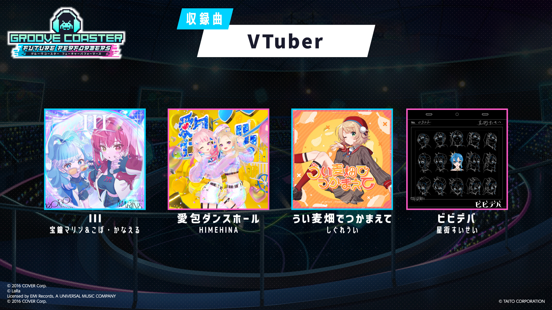 最新作である『グルーヴコースター フューチャーパフォーマーズ』はゲームシステムが進化するだけでなく、シリーズ初のストーリーモードも搭載。発売時点での本体収録楽曲は全50曲で、今後無料アップデートによる楽曲追加や、有料ダウンロードコンテンツでの展開も予定されている。詳しい収録楽曲は以下の通り。