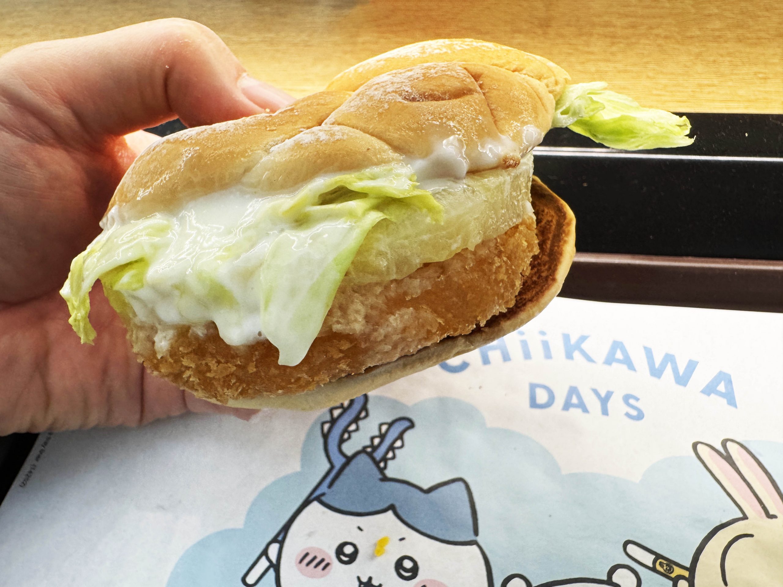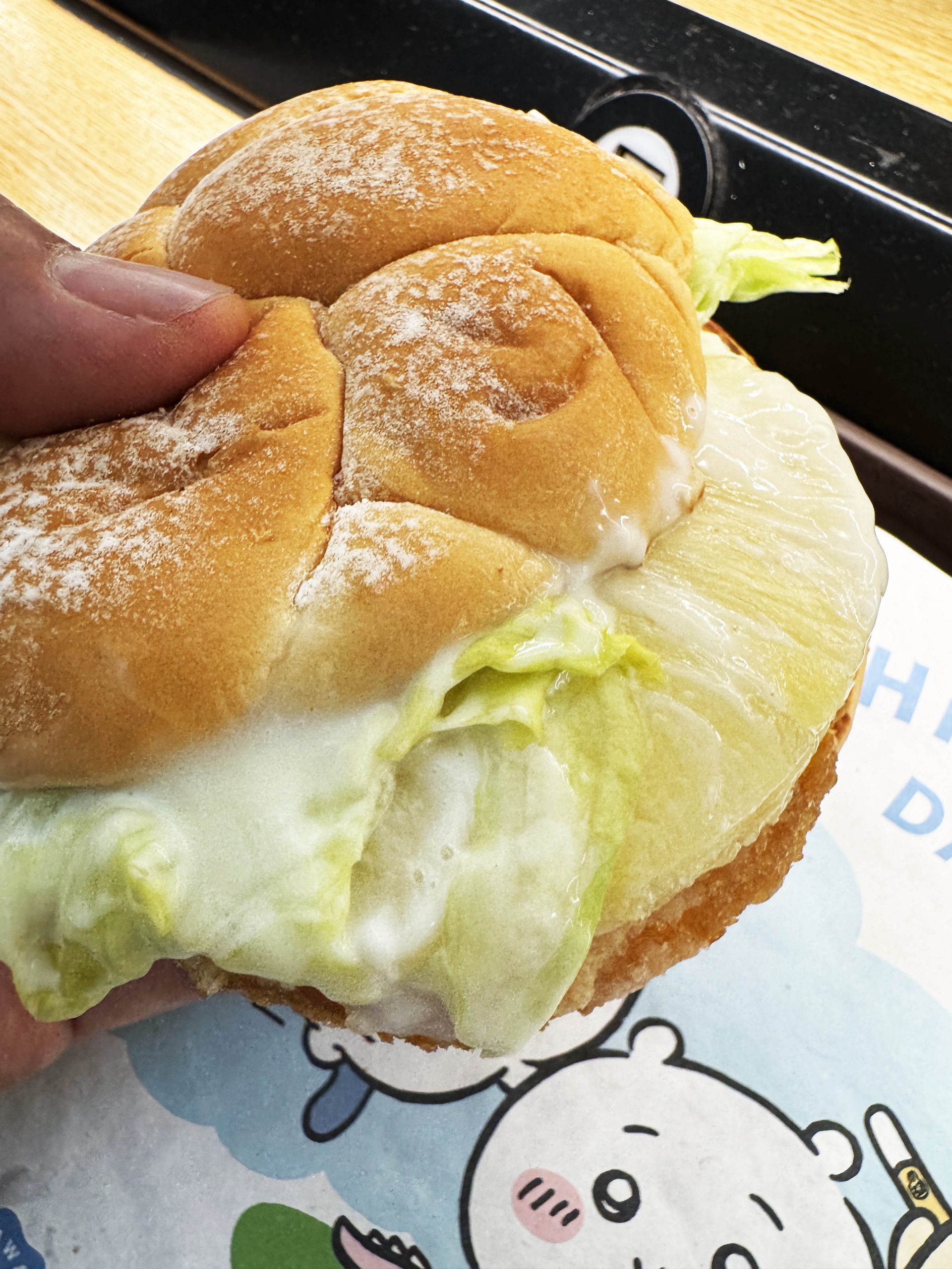 パイナップルえびフィレオですが、これ、正直言って、むちゃうまです。ちいかわが好きだから、ひいきしているわけじゃあありません。マクドナルドのバーガーの歴史の中で、トップクラスのウマさです!