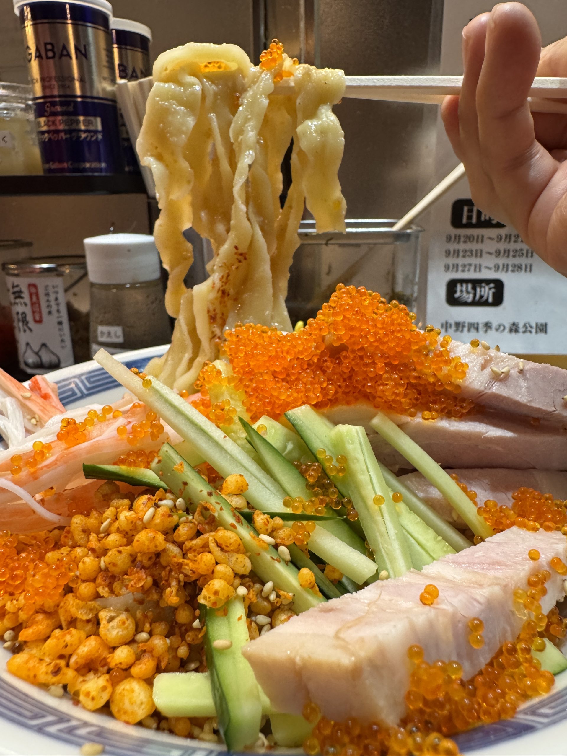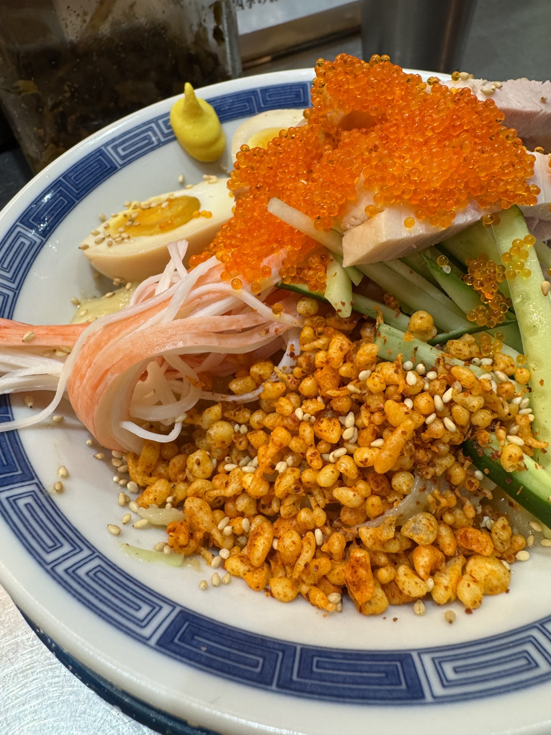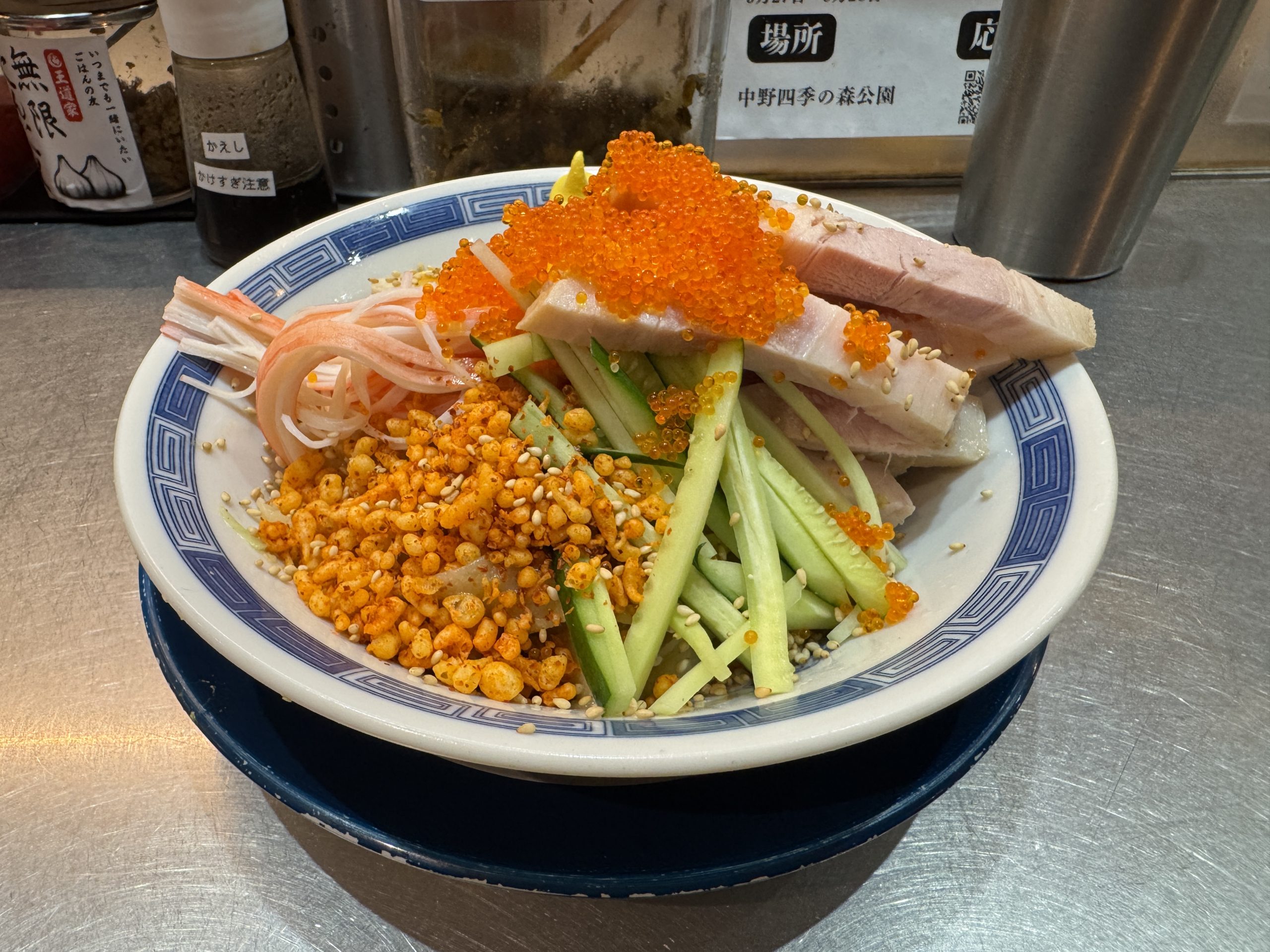 ワクワクしながら待つこと数分、目の前にやってきた冷やし中華はメチャクチャ具だくさんだった! カニカマ、とびっこ、キュウリに玉子、そして深紅の揚げ玉! 具、具、具! チャーシューがガッツリが嬉しい!!