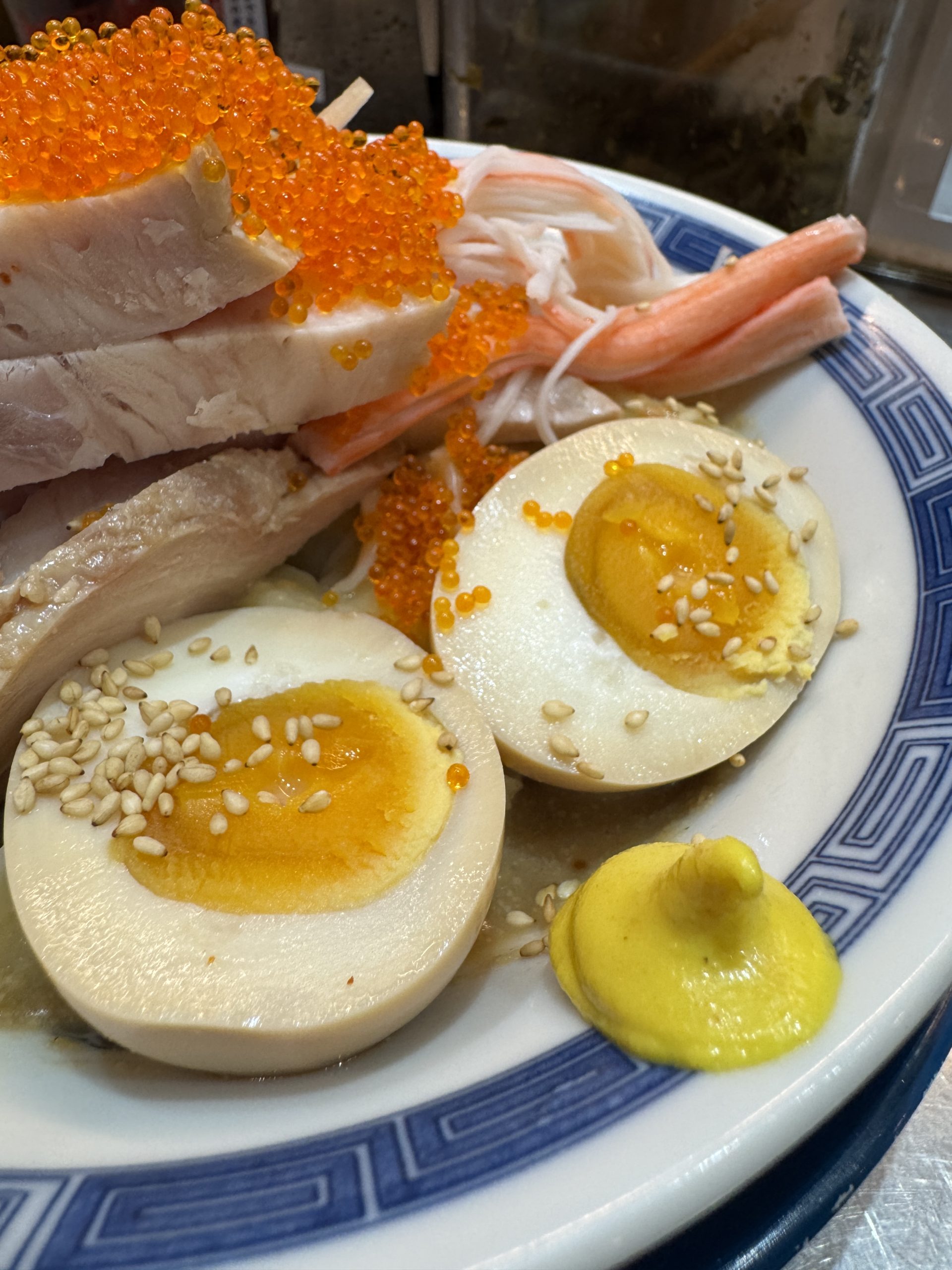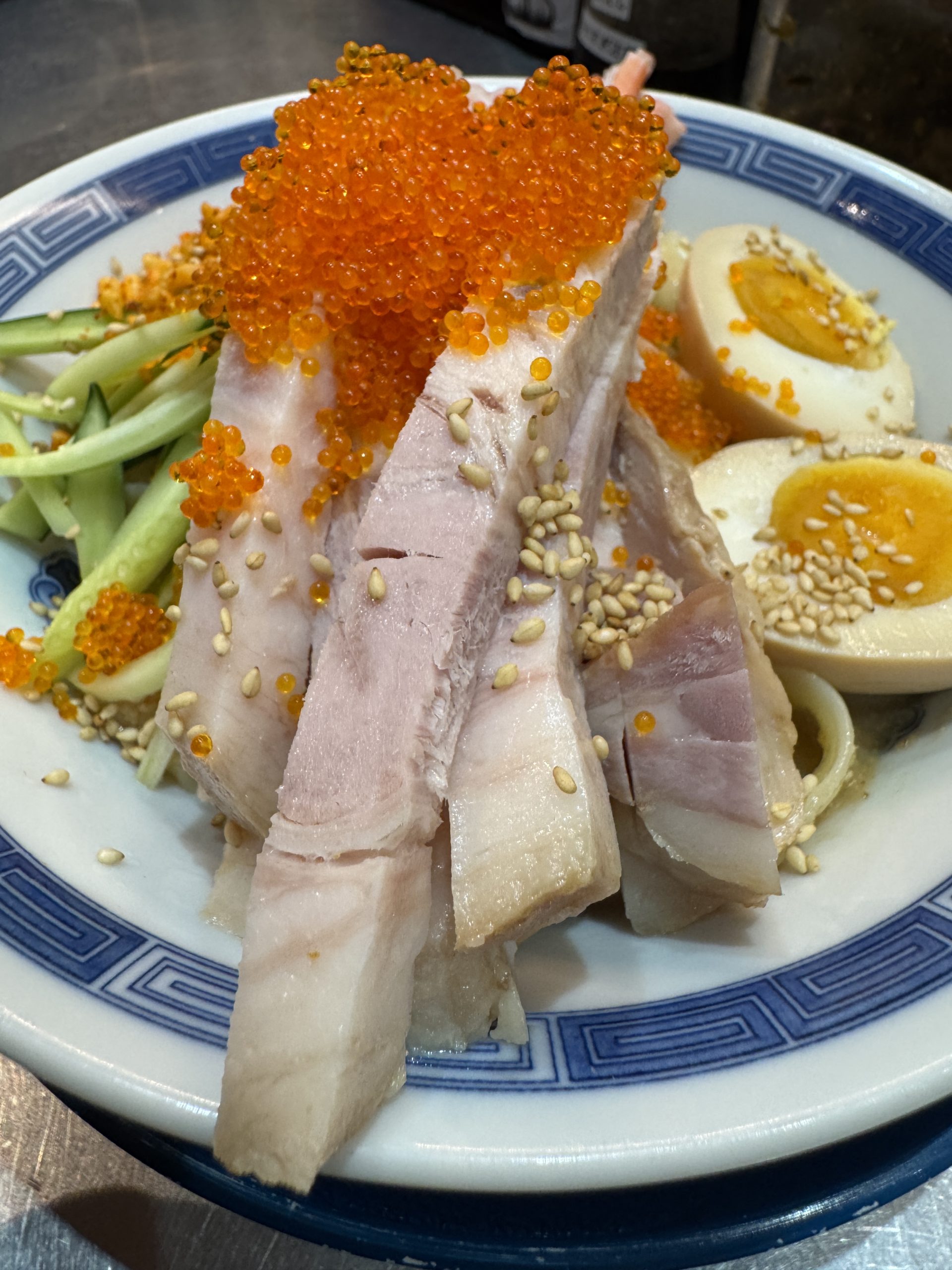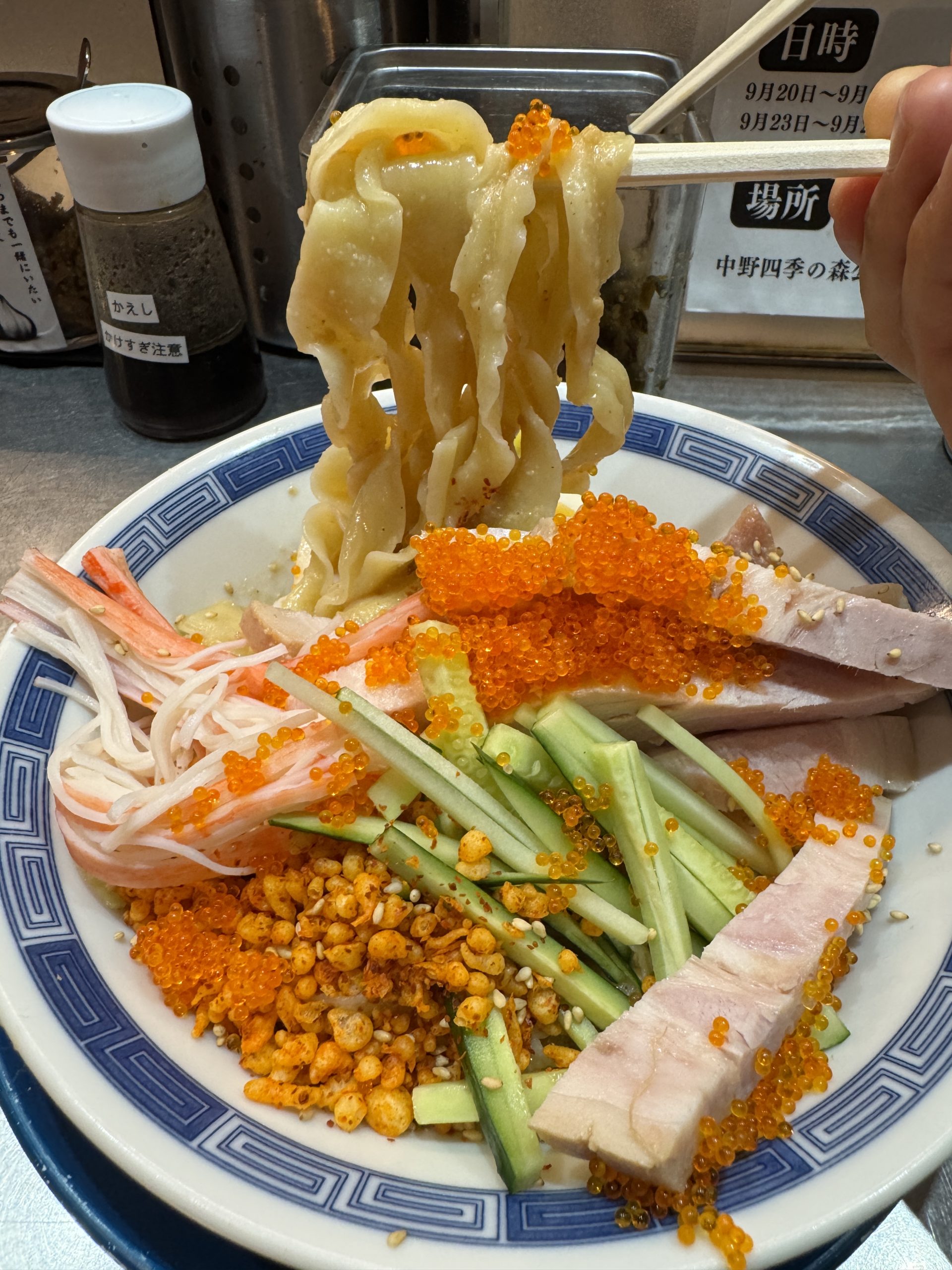 ワクワクしながら待つこと数分、目の前にやってきた冷やし中華はメチャクチャ具だくさんだった! カニカマ、とびっこ、キュウリに玉子、そして深紅の揚げ玉! 具、具、具! チャーシューがガッツリが嬉しい!!