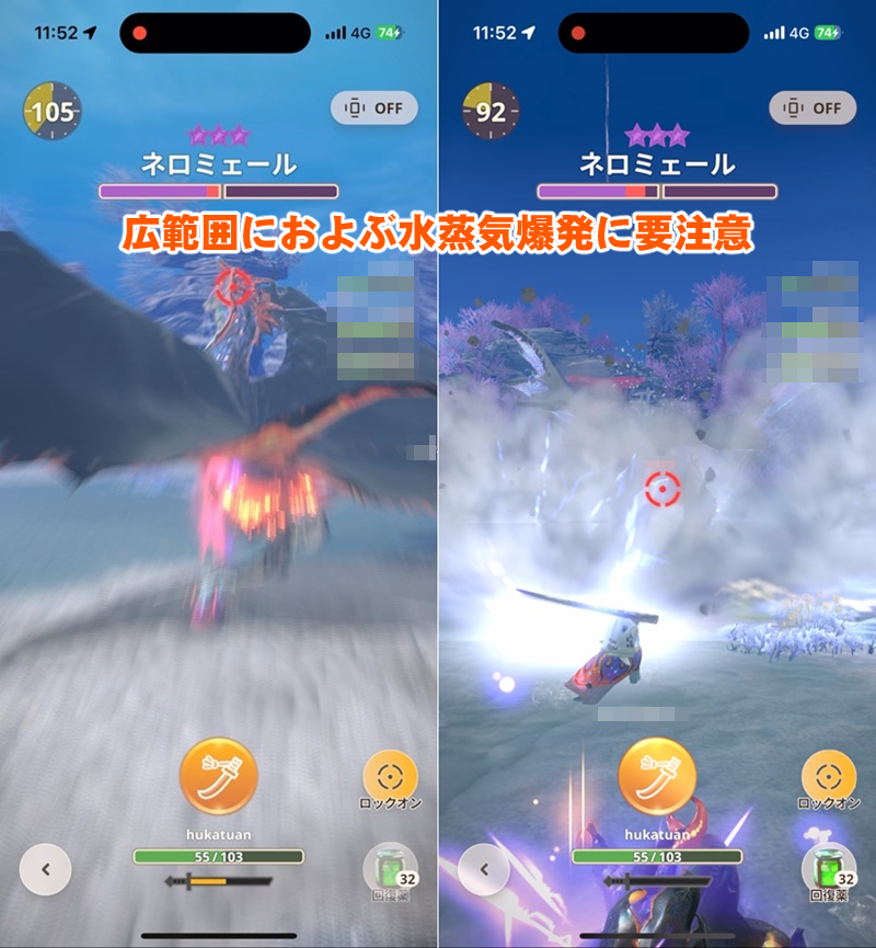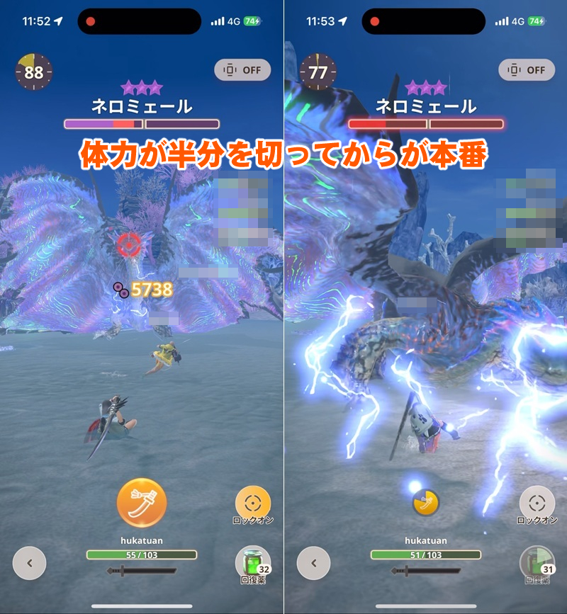 ネロミェールは水をまとっている状態から始まり、龍属性の武器で一定のダメージを与えることで解除(渇き状態)。