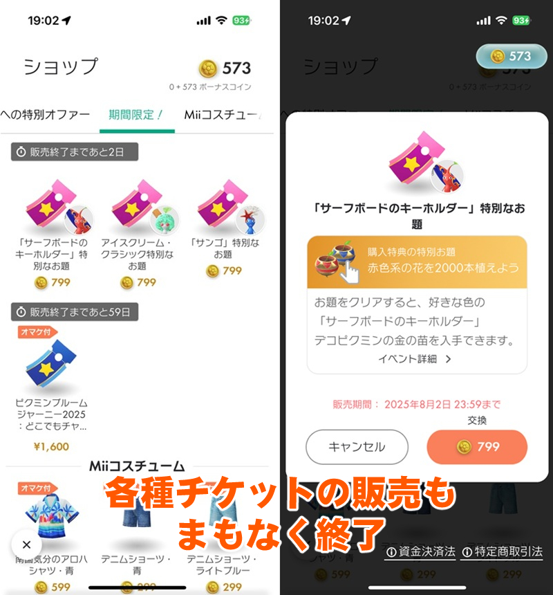 いずれもストアに“好きな色の苗を選べるお題”のチケットが2025年8月2日(土)終日まで販売中なので、どうしても揃えておきたい場合は購入も検討しておこう。