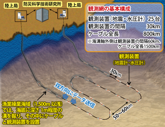 「1つの観測システム(サブシステム)は、平均約25の観測点(観測装置)を概ね30km間隔で網の目状に設置しています。ケーブル全長は約800kmです。 水深1,500m以浅の漁業操業海域では、海底に深さ1m程度の溝を掘り、その中にケーブルと観測装置を設置します。沿岸や浅部ではケーブル保護のため外装ケーブルを使用しています」