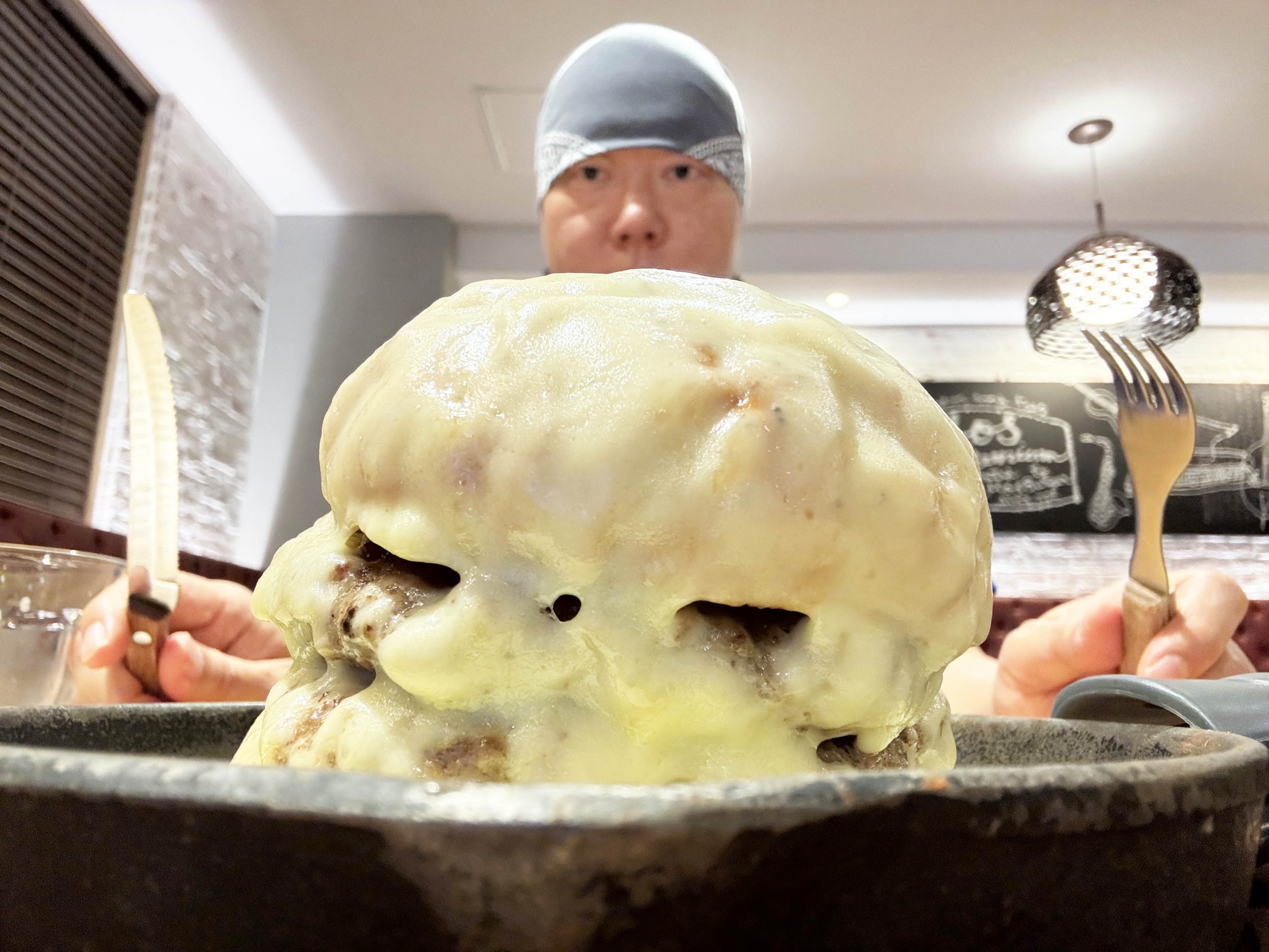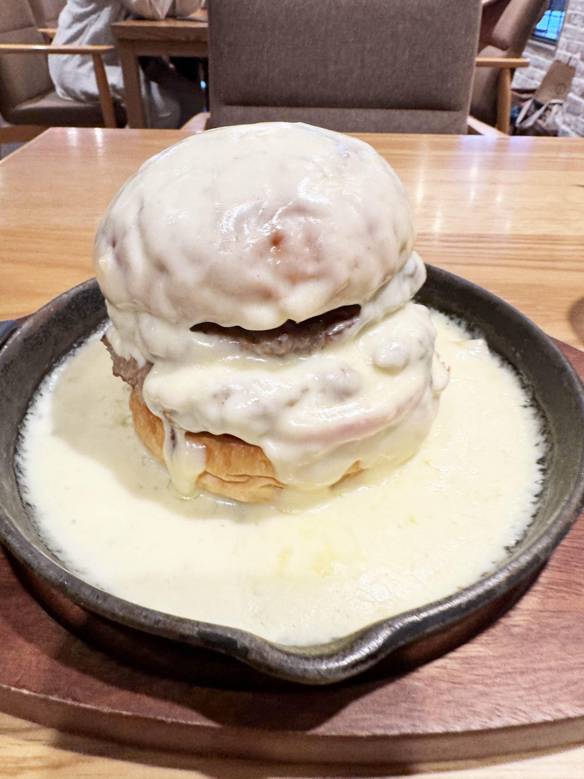 さらにこのバーガー、ただでさえ肉厚なパティが2枚もサンドされています。ダブルバーガーです! 何から何まで豪快。鉄板にもトロトロのチーズが流れ込んで湖面のようになっています。