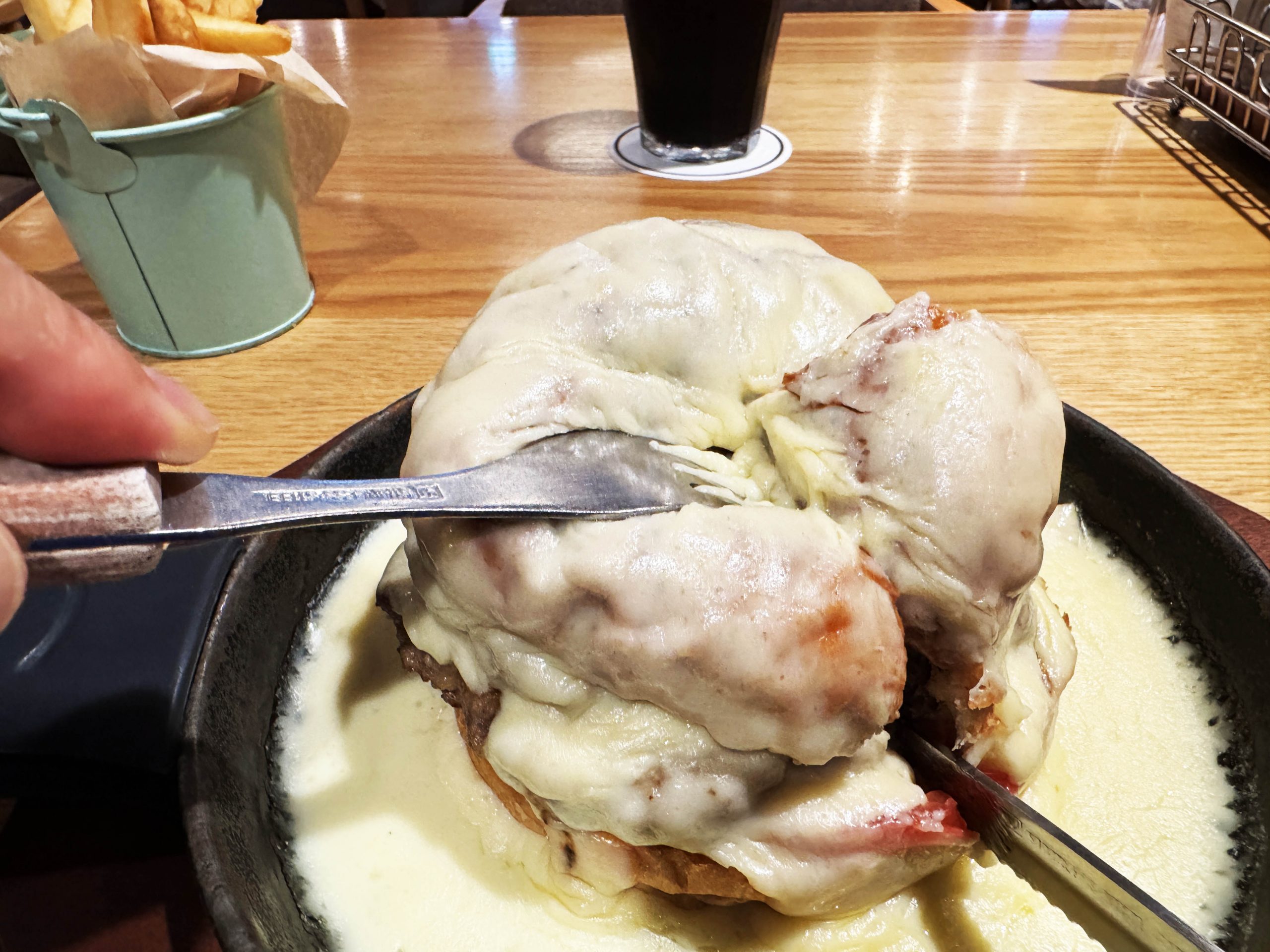 手づかみで食べるのは至難の業。ということで、ナイフとフォークで食べることを店員さんにオススメされました。バンズが限りなくフカフカでモチモチ。頑張ってカットし、チーズをたっぷりとバンズにまとわせて、ジューシーな肉厚パティとともに食べます。