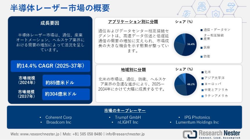 日本 – 2025年7月23日 – Research Nesterの最近の市場調査分析 「半導体レーザー市場:世界的な需要分析と機会展望2034年」 では、アプリケーション、レーザータイプ、材料、出力クラス、地域別の市場区分の観点から、詳細な競合他社の分析と世界の半導体レーザー市場の概要が示されています。