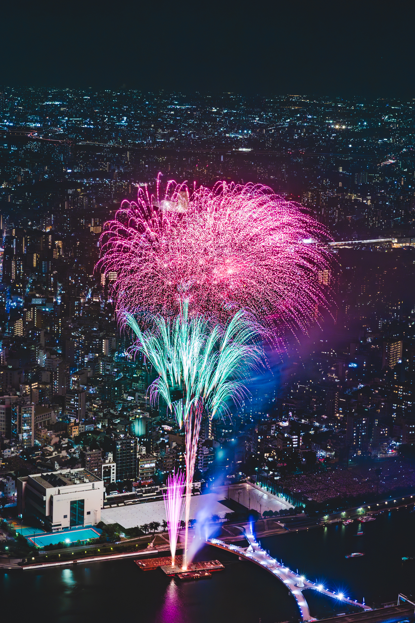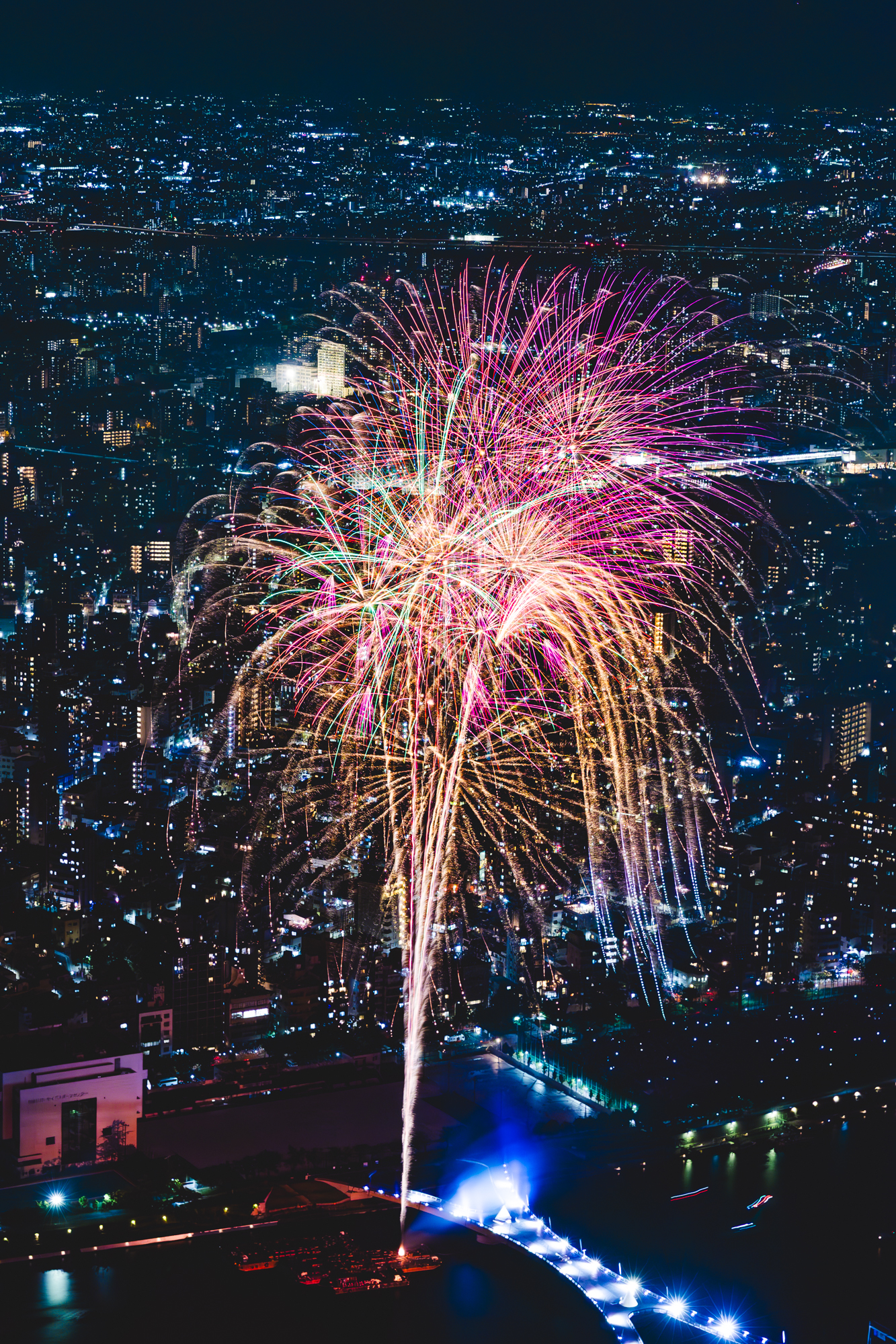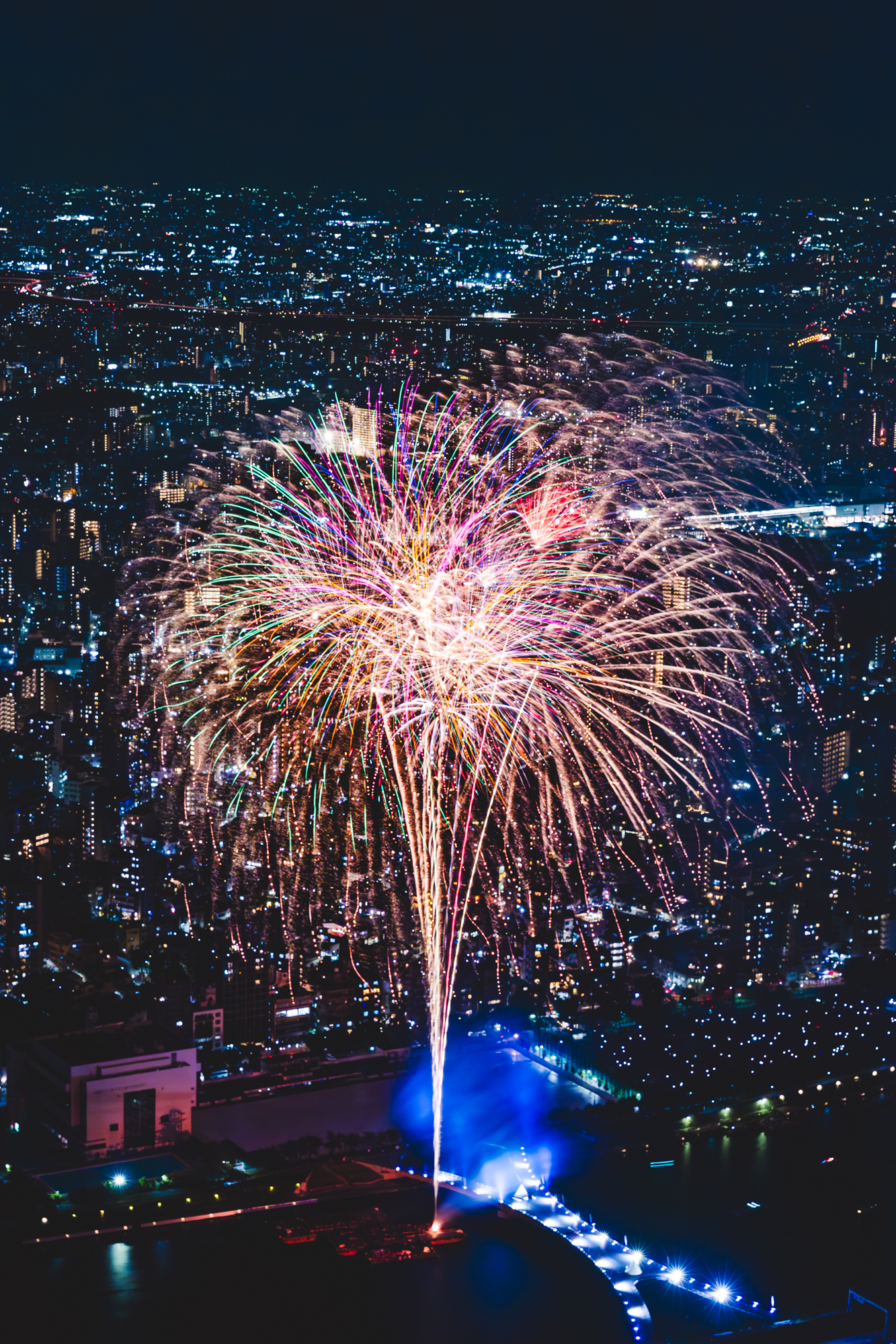 続々と打ち上がる花火。墨田区の夜景も美しく映えていました。