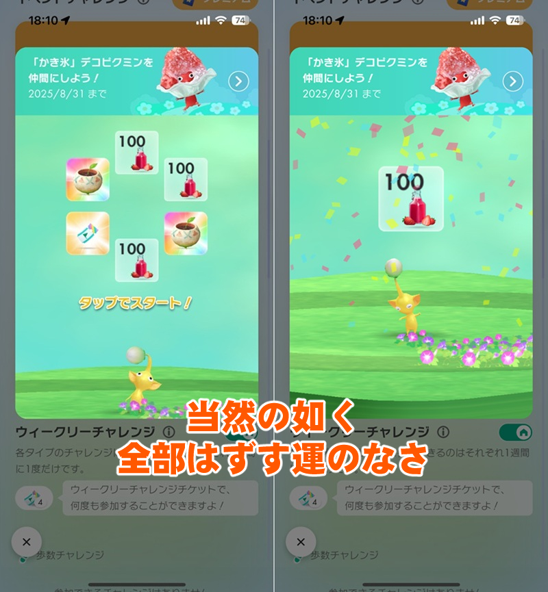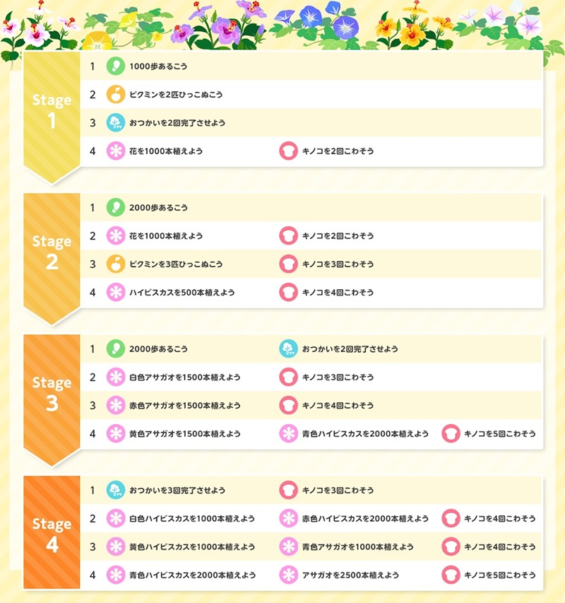 歩数やキノコの破壊、花植えなどステージ毎のお題に挑みルーレットから限定デコピクミンの苗や季節の花びらなど報酬を狙って奮闘するのが恒例行事になっている。