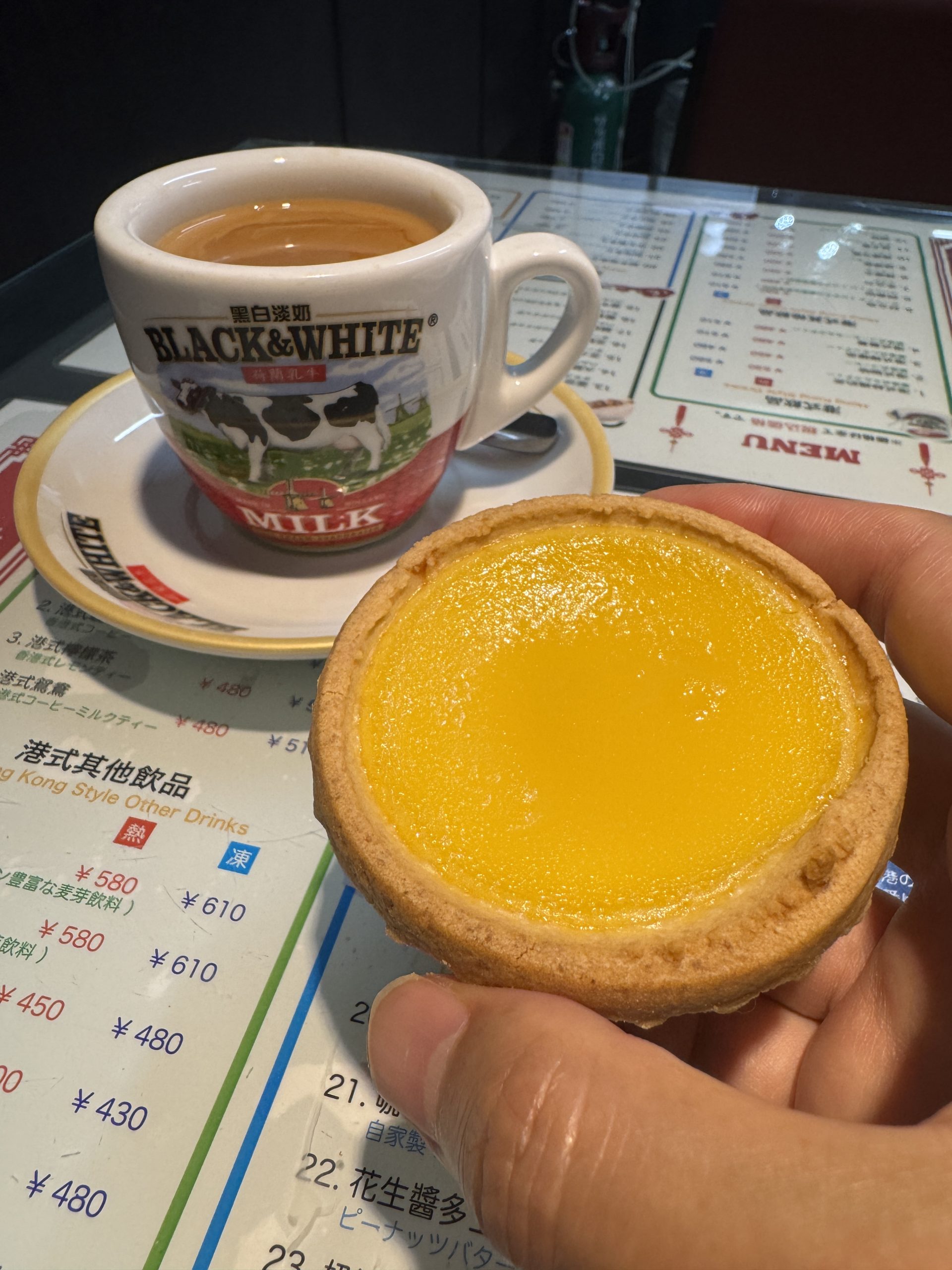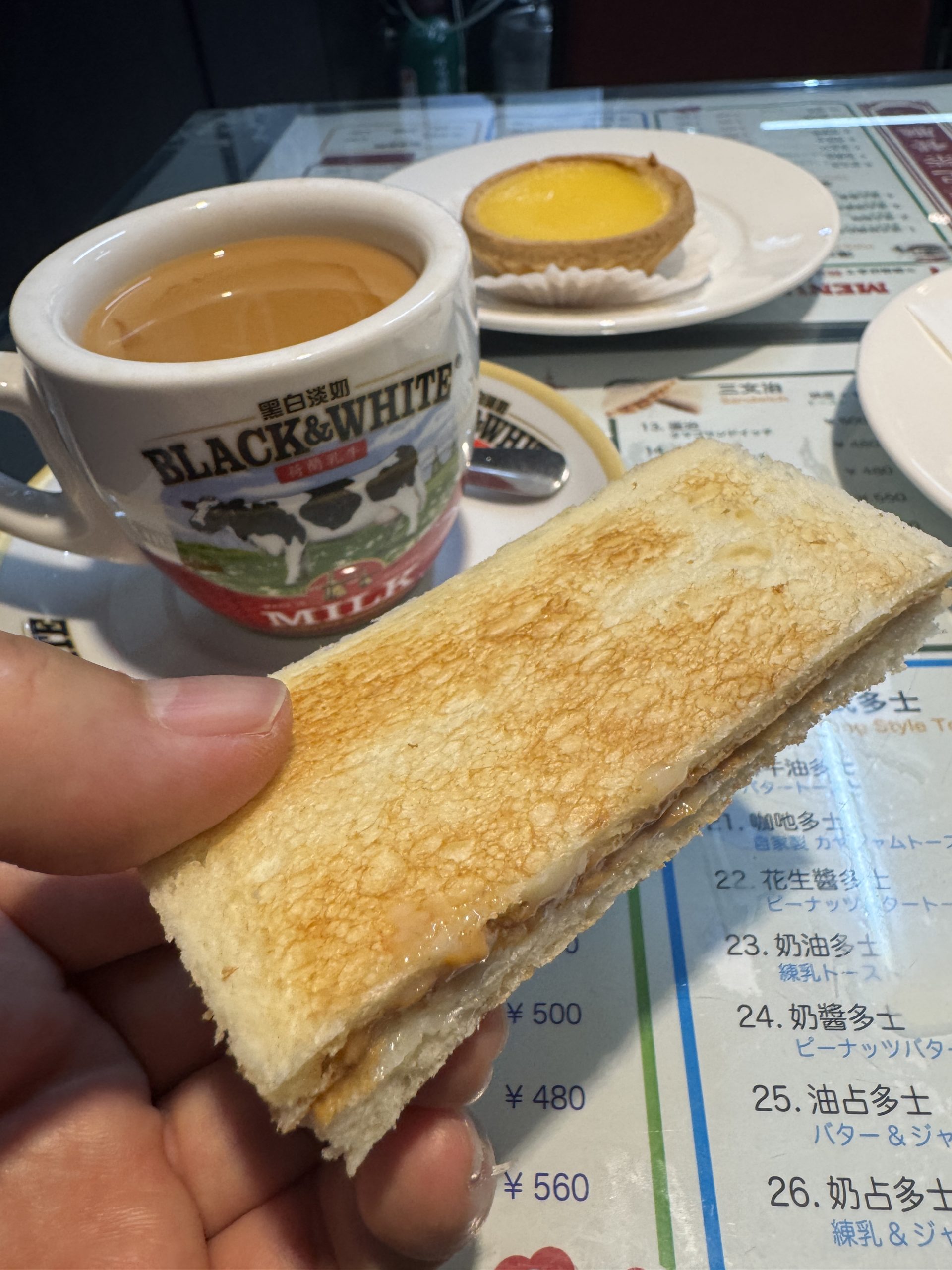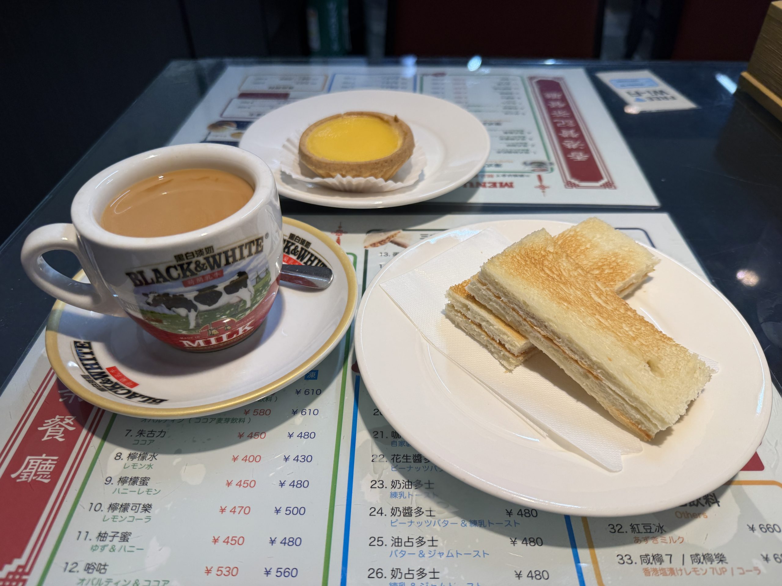 あったかい香港式ミルクティーと、ピーナッツバタートースト、エッグタルトをオーダー。