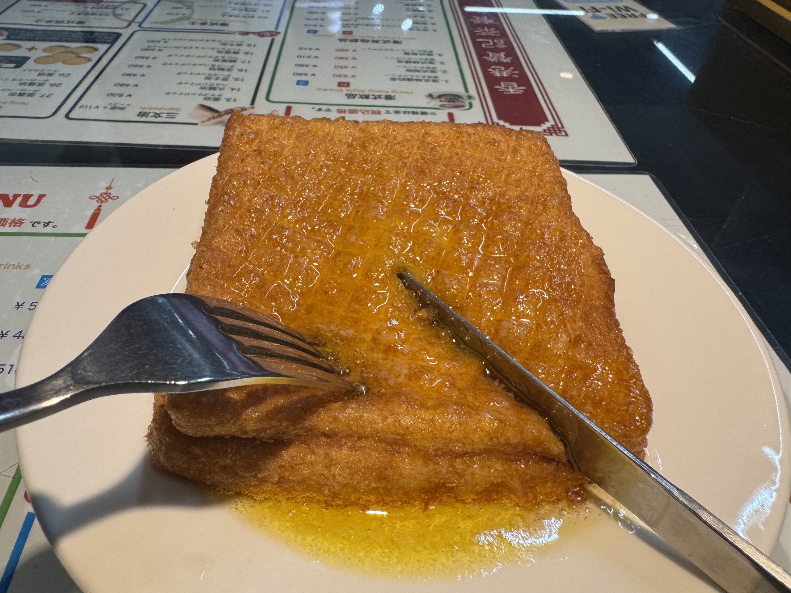 ここの香港式ピーナッツバターフレンチトーストは、揚げ焼きされていて、極めて独特で甘美。