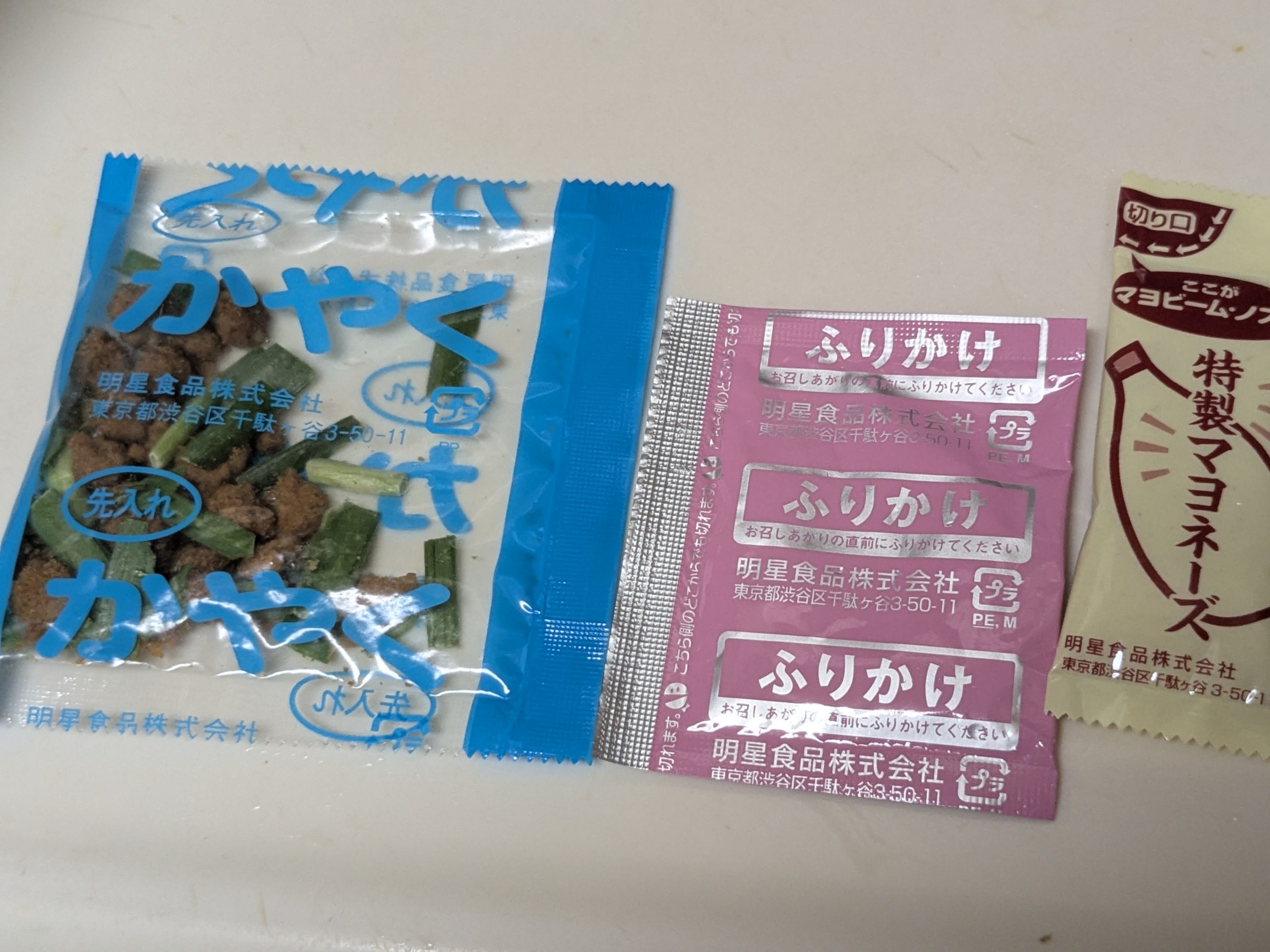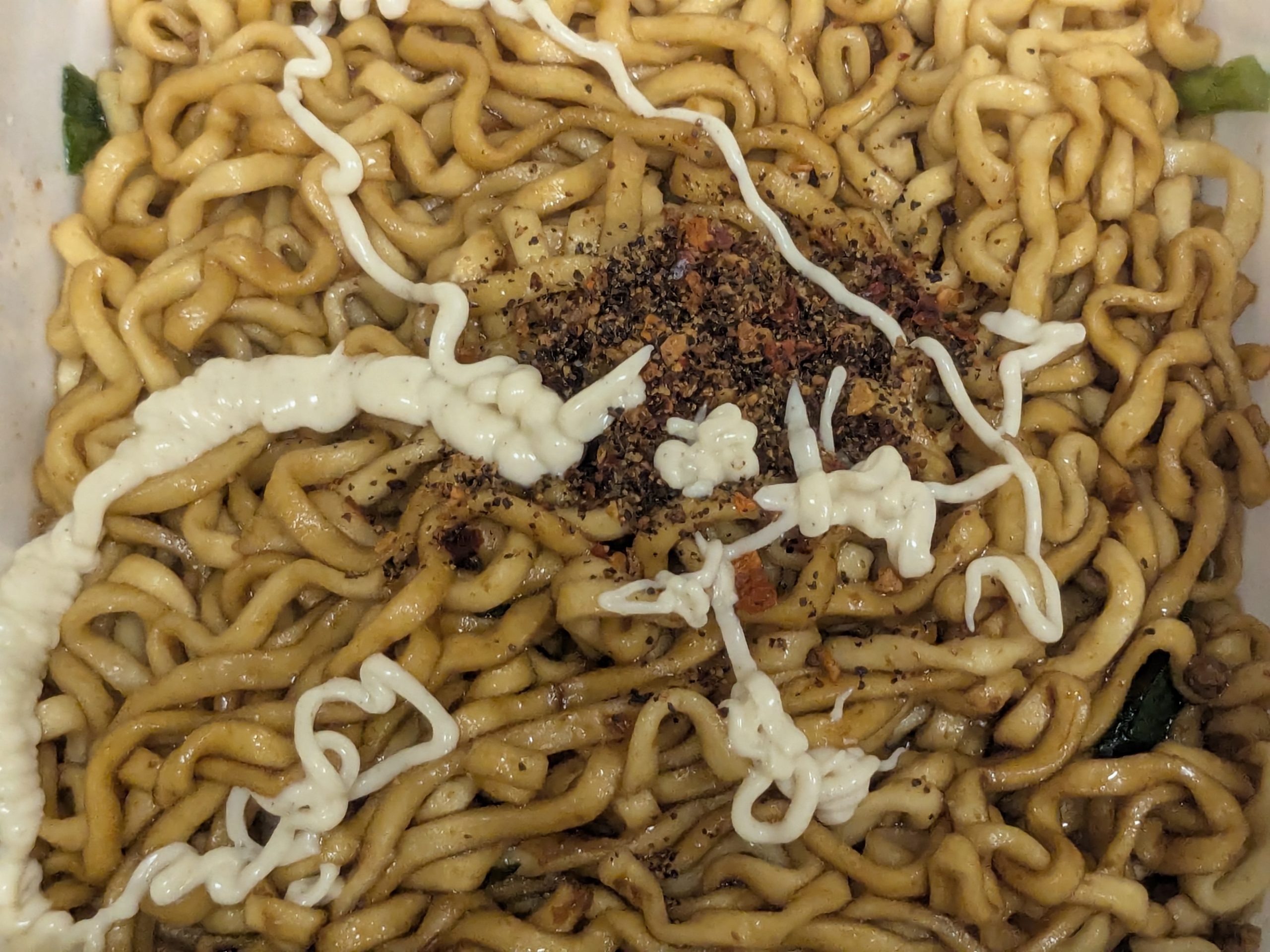かやくやふりかけ、ガーリックマヨとソースが入っている。パンチの効いたガッツリ味を演出してくれることを楽しみにしながら…