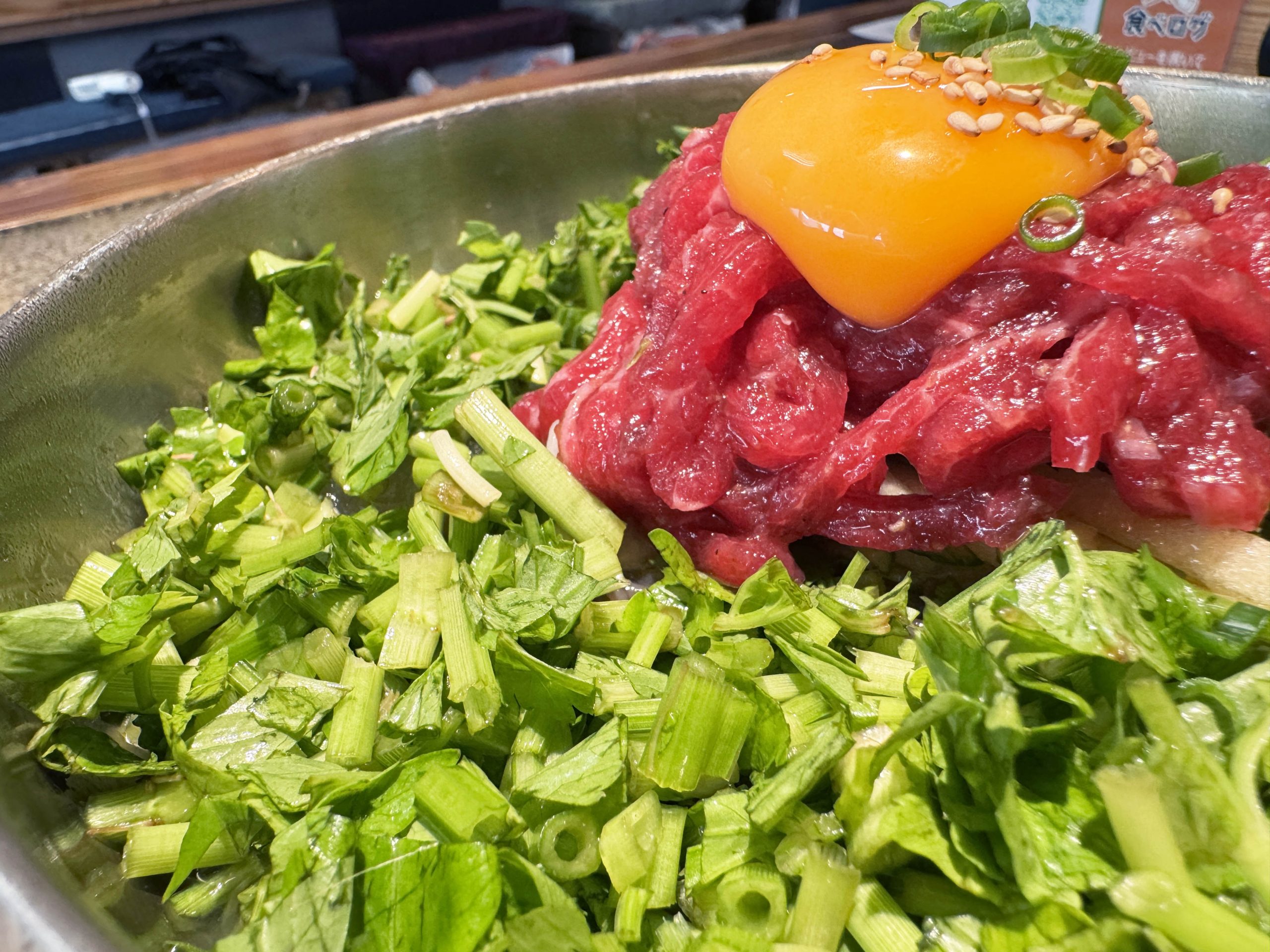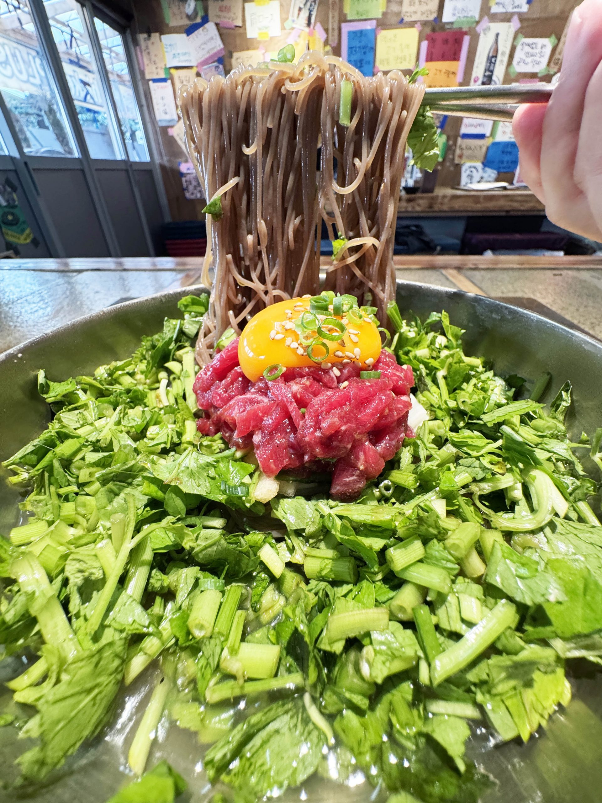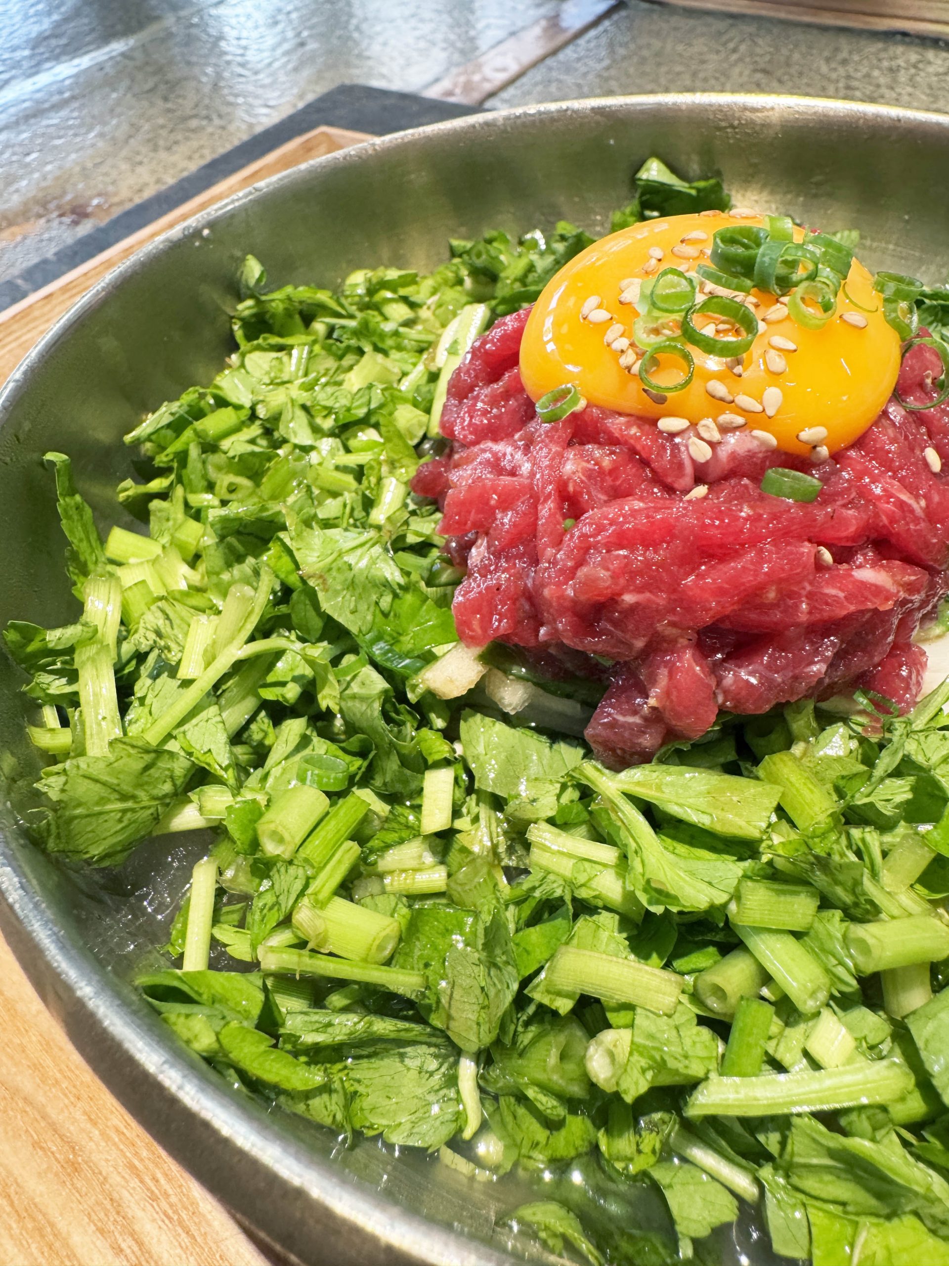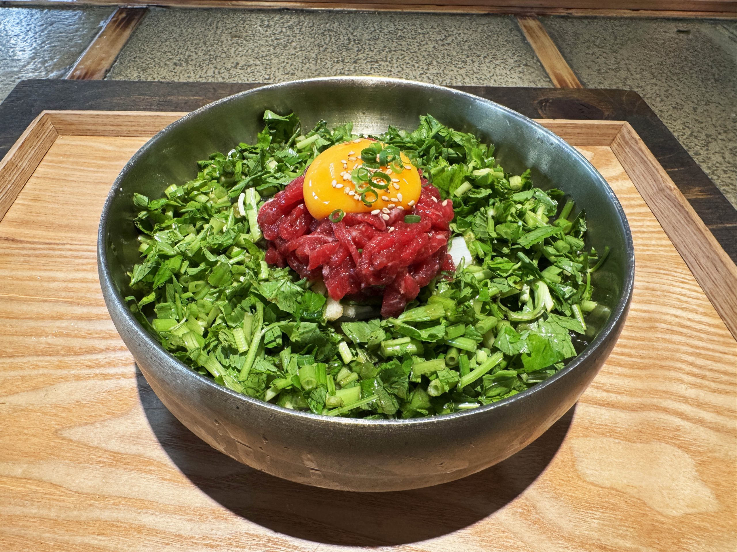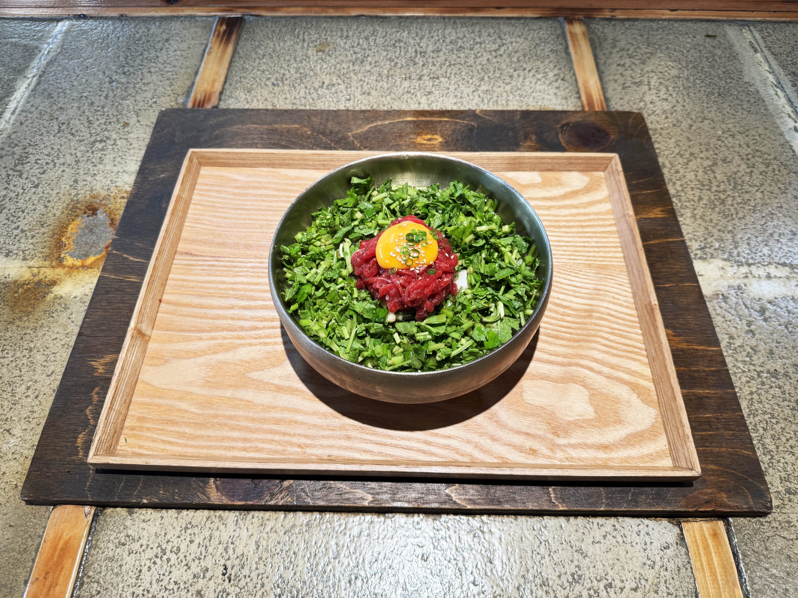 このスープの完成度、とても高いです。冷麺をサルベージするとスープをしっかりまとっていて、心地良い食感とともに、弾けるるように切れる麺、そして広がる旨味。たまりません。ユッケもスープに浸して食べます。芹とともにユッケを食べると絶品です。