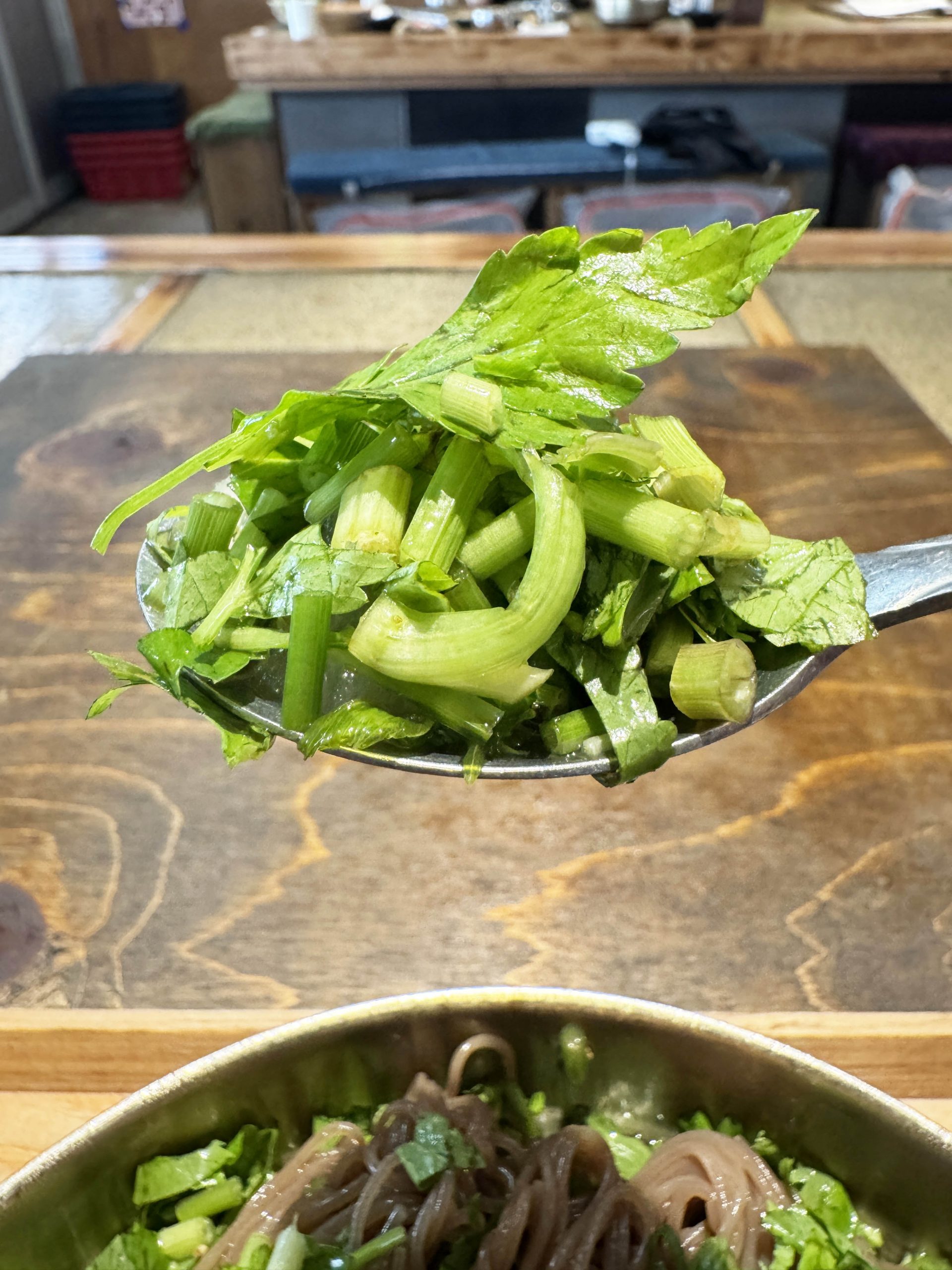 ラスト、スープに浮いている芹をスプーンですくい、スープとともにシャリシャリ食べます。たまりません。最初から最後までシャリシャリな芹、最高ですよ。