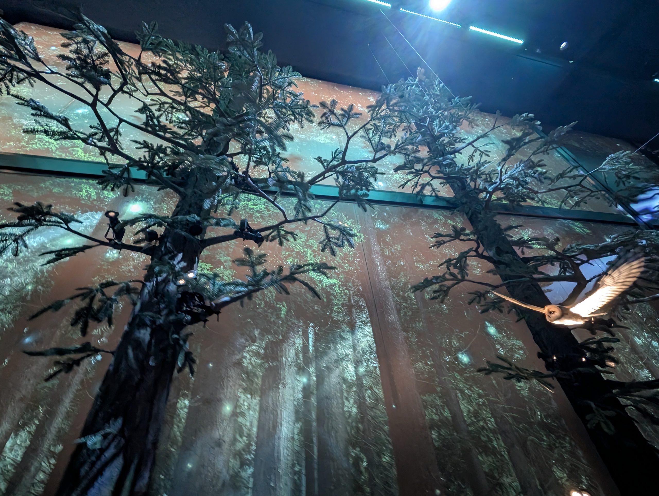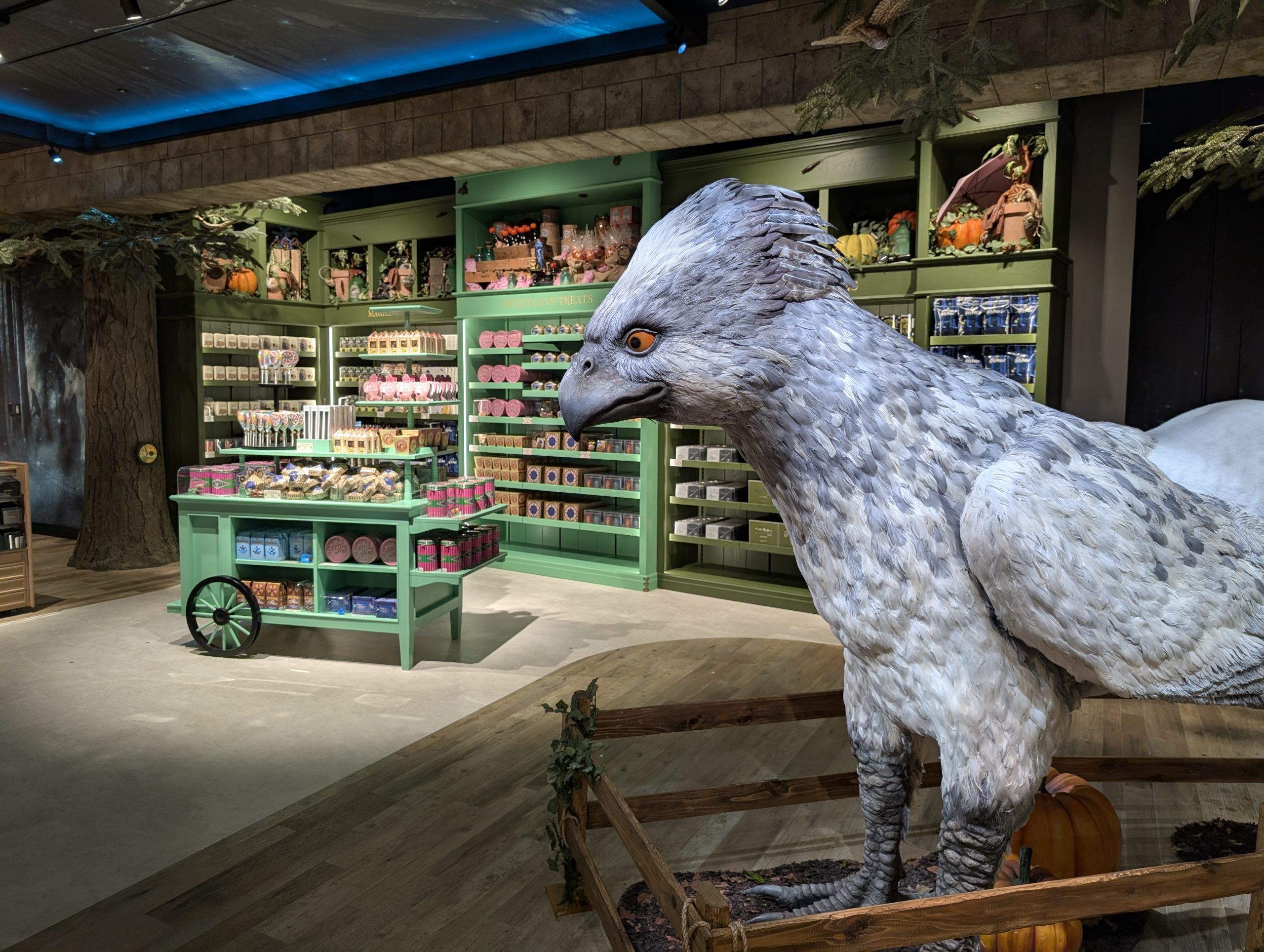 ■1階:原宿限定グッズ&4つの寮のアイテムのフロア 禁じられた森をテーマにした内装 魔法動物のバックビークやフクロウたちがお出迎え
