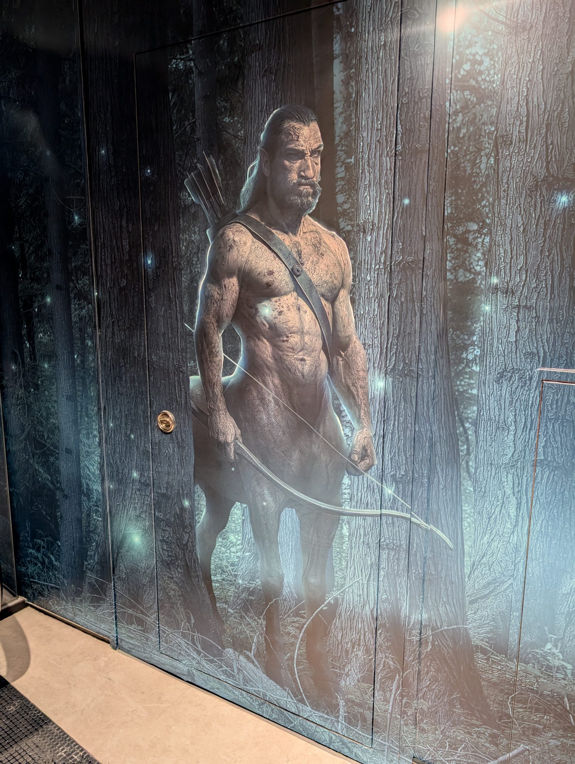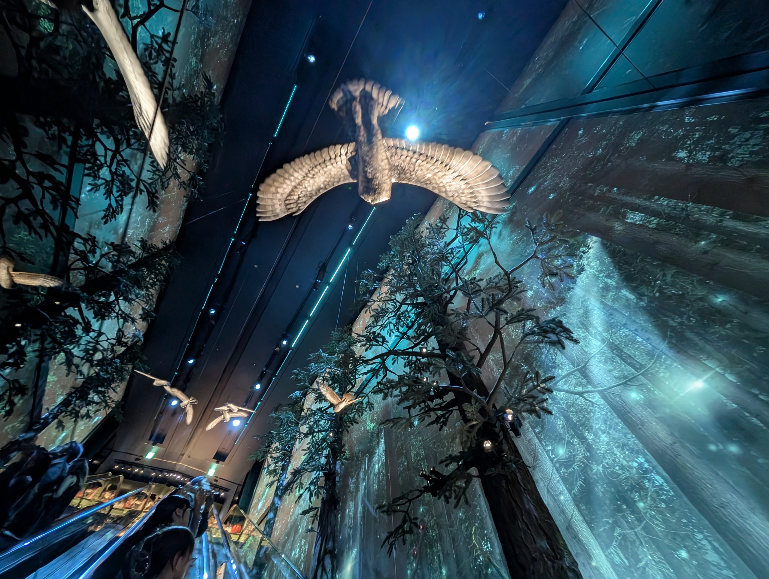 1階から2階へと続くエスカレーターでは、頭上にはフクロウたちが舞い、壁にはケンタウルスの姿が描かれるなど、まるで深い森の奥へ分け入っていくかのような遊びごころあふれる仕掛けが施されており、作品の世界観が散りばめられた店内の演出がショッピング体験を楽しく彩ります!