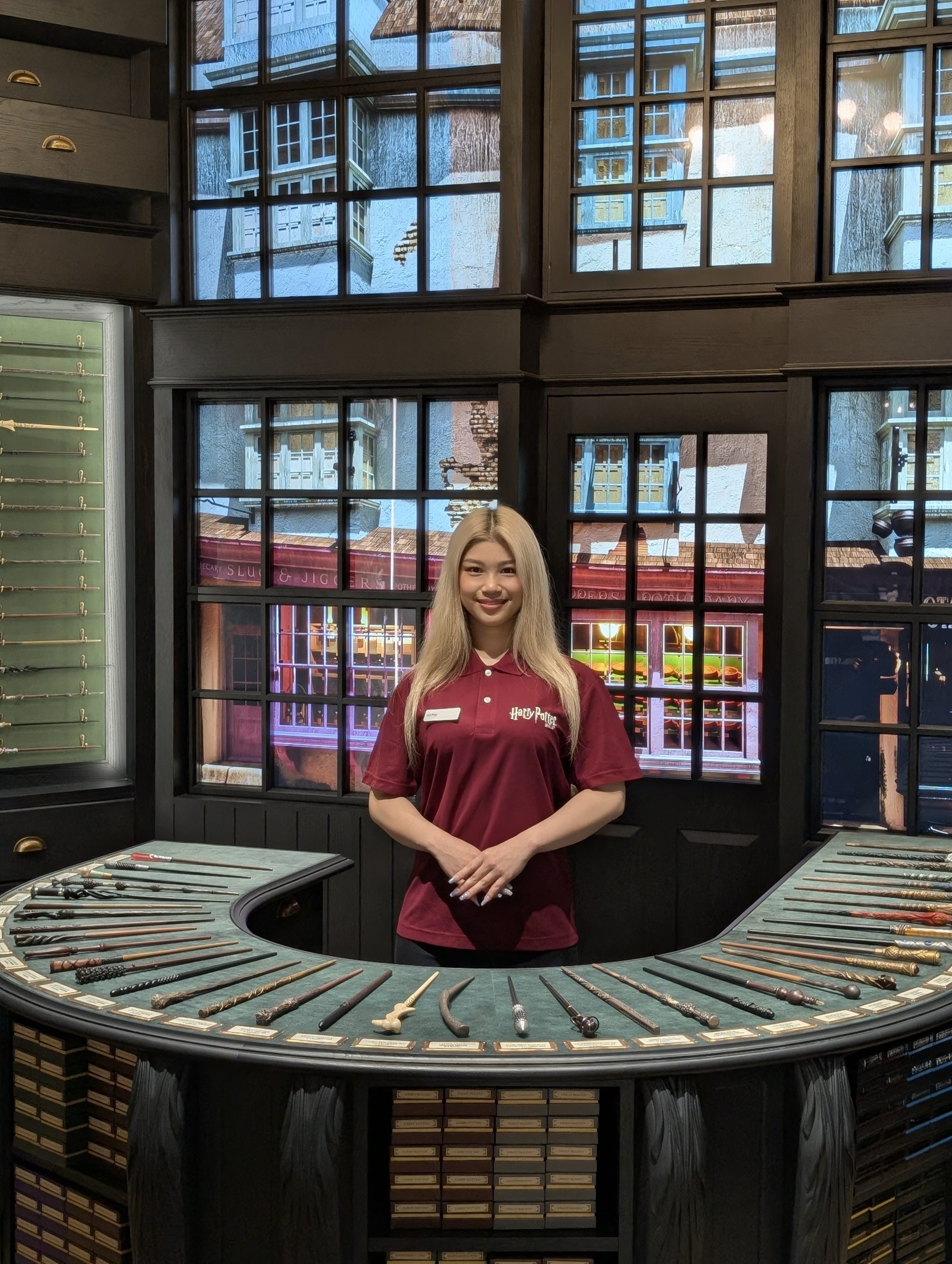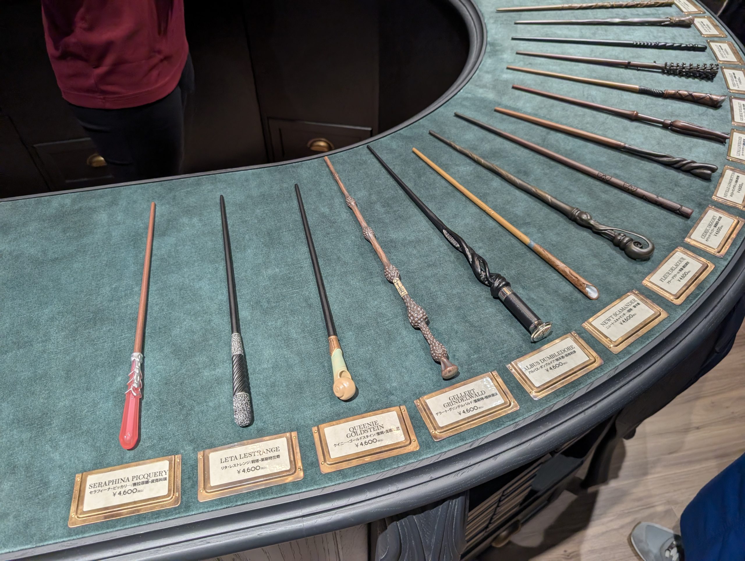 ファンには欠かせない魔法の杖を選べるカウンターもあり、魔法の世界に浸りながら、特別なアイテムとの出会いを楽しめます。さらには、ホグワーツの生徒の必需品、ローブに名前を刺繍できるサービスや、4つの寮別のエンボスノートのパーソナライズも可能です。