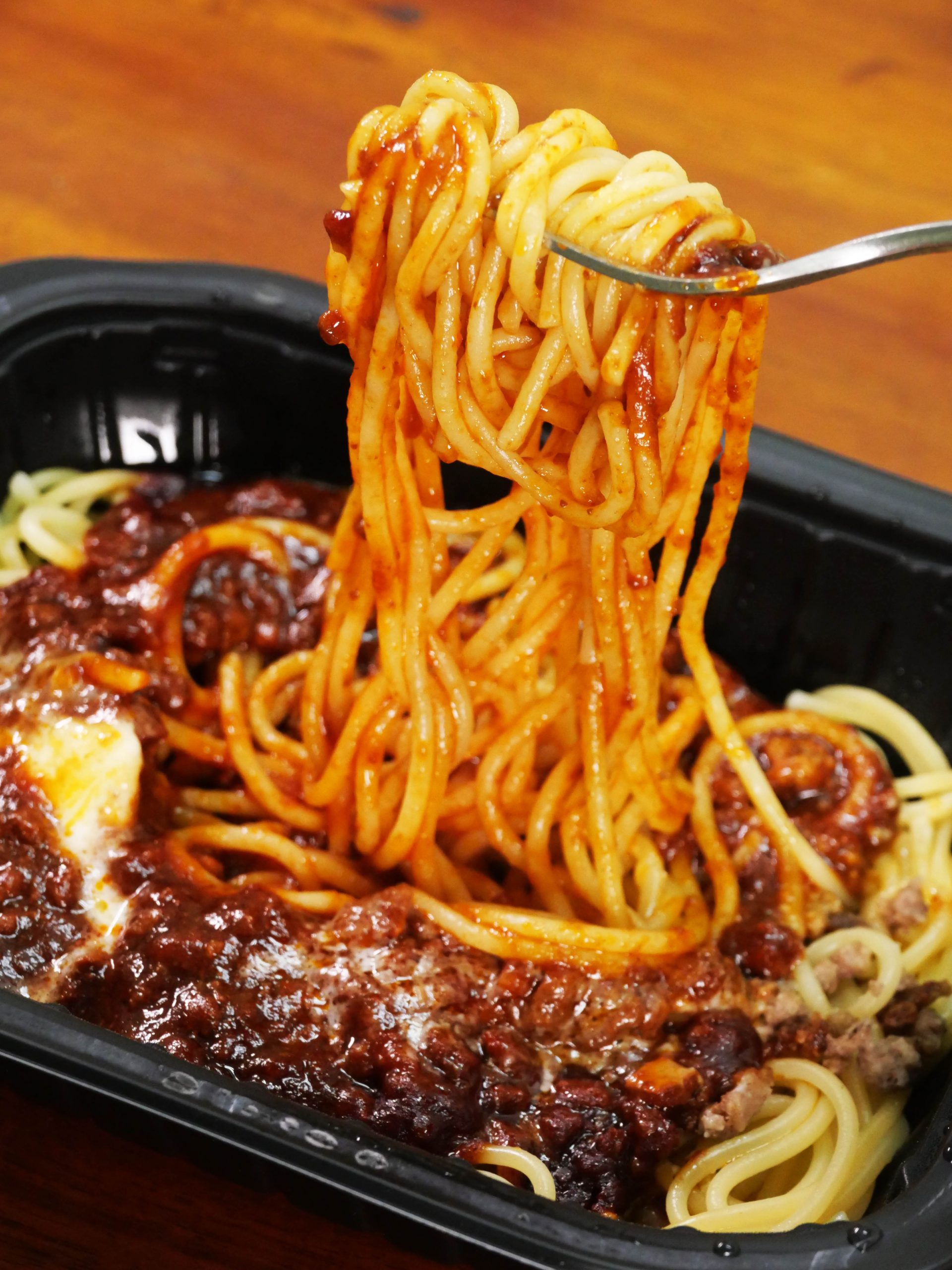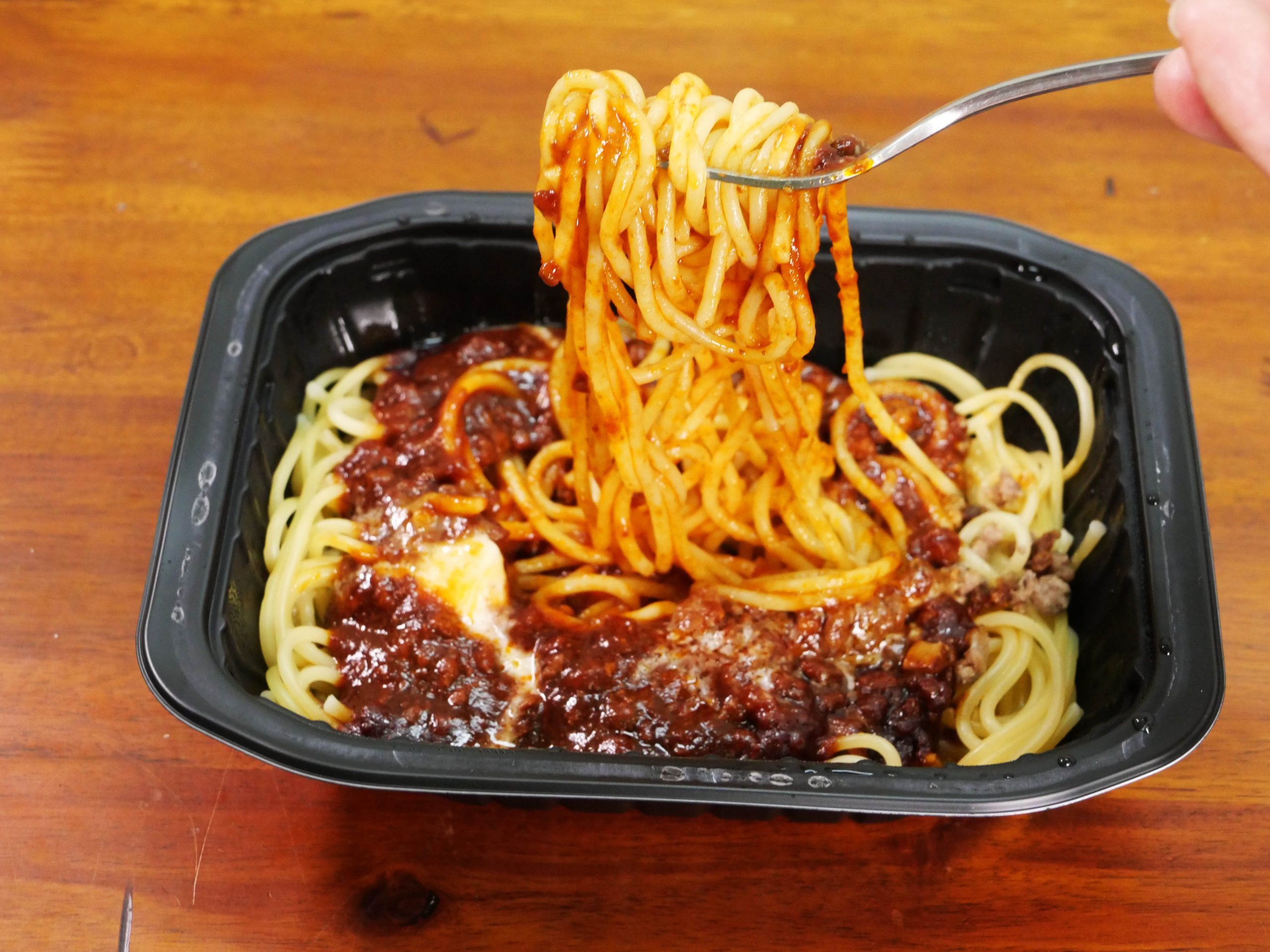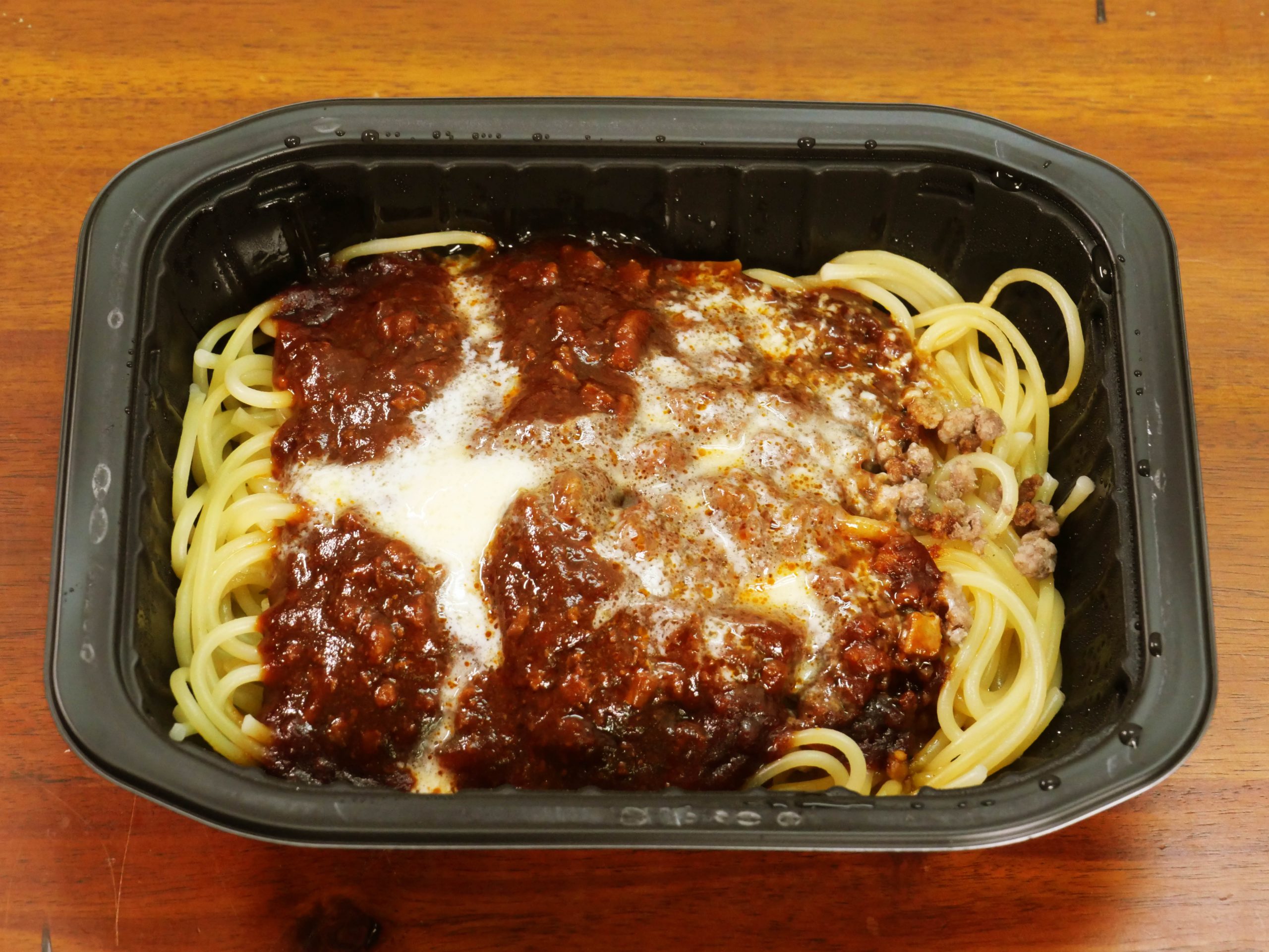 まず、開封してビックリ。贅沢すぎる量のボロネーゼソースがパスタに盛られています。まるで、シェフが厨房で、底が深いおたまでソースをたっぷりとパスタにかけたかのよう。ケチケチしていない、たっぷりガッツリ。この時点で心が躍ります。