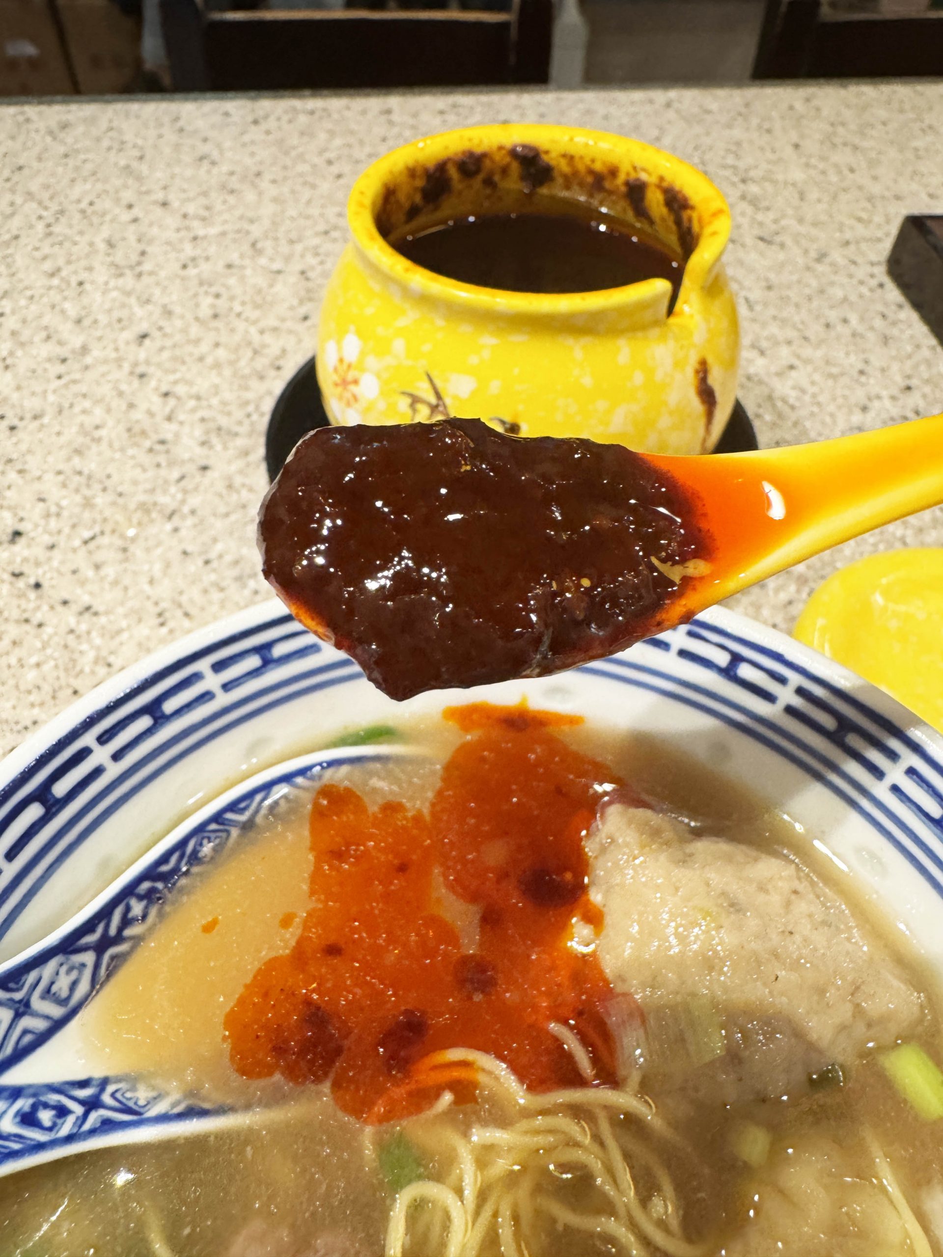 食べ進めて終盤、辛味調味料を入れて麺をすすります。