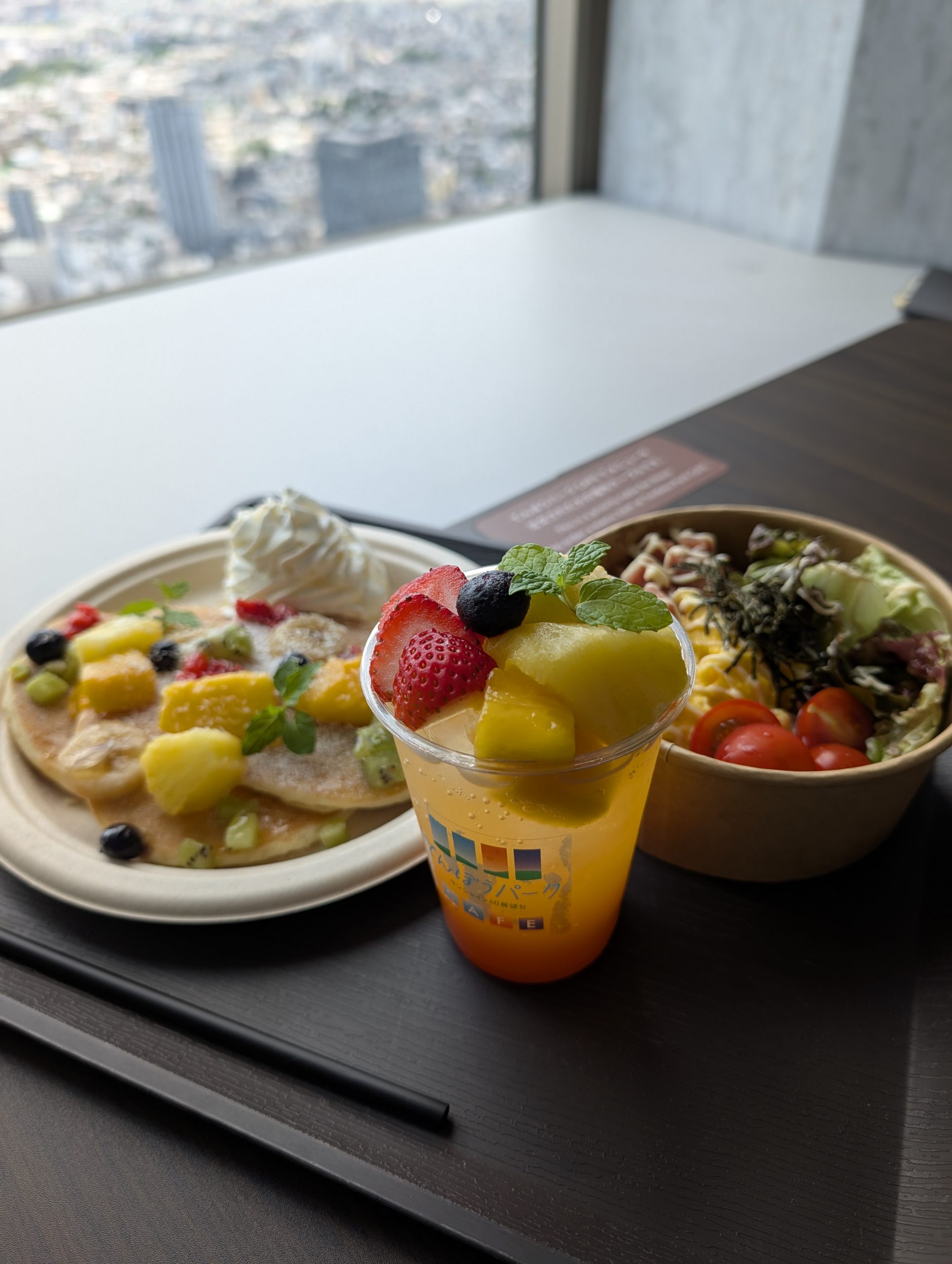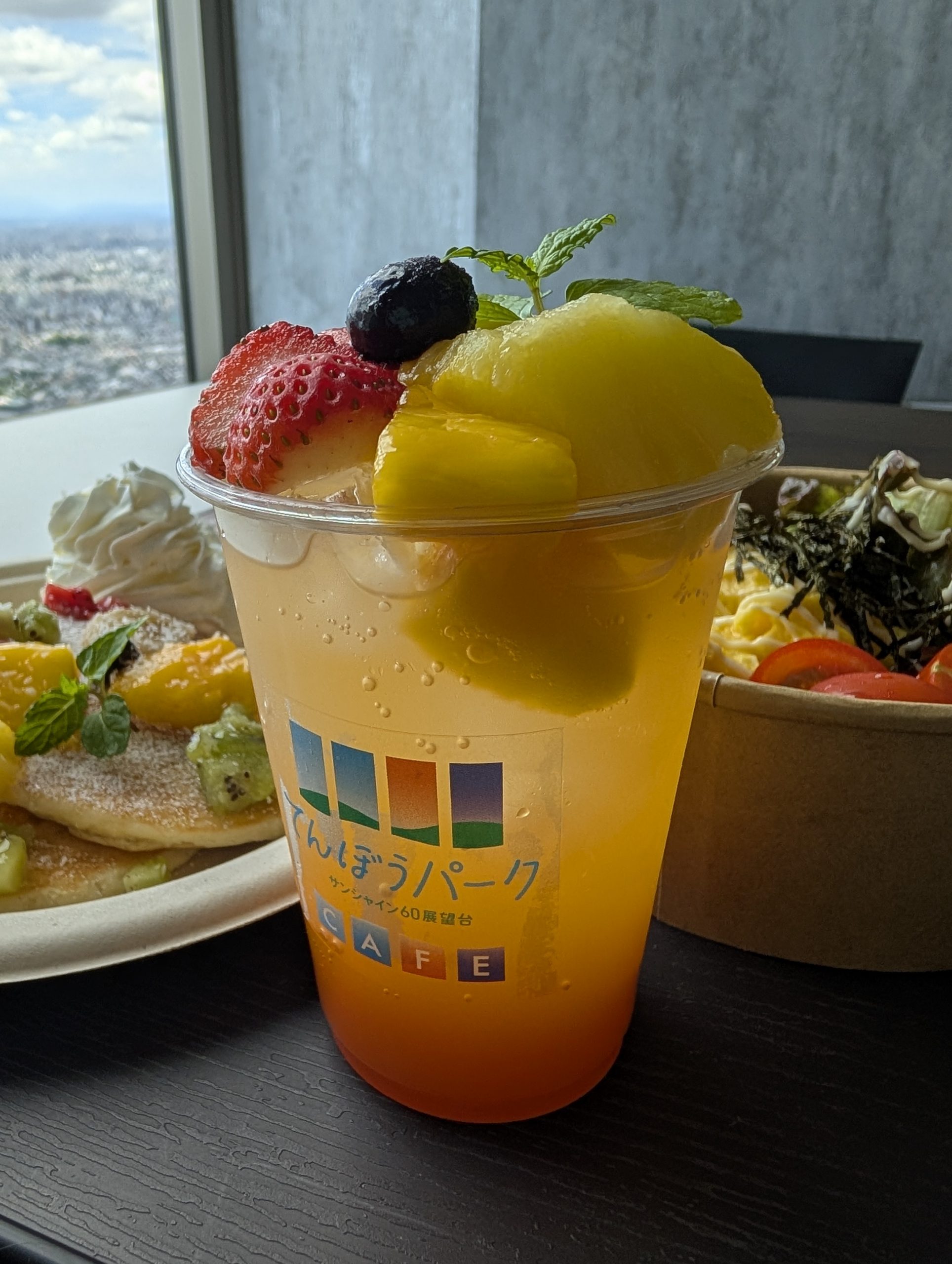前述のパンケーキに合うドリンク「トロピカルソーダフロート」750円も試飲。これもフルーツたっぷりで大満足のトロピカルソーダで、炭酸と合わせていただきましょう。絶景を眺めながらいただく至高の一杯です。