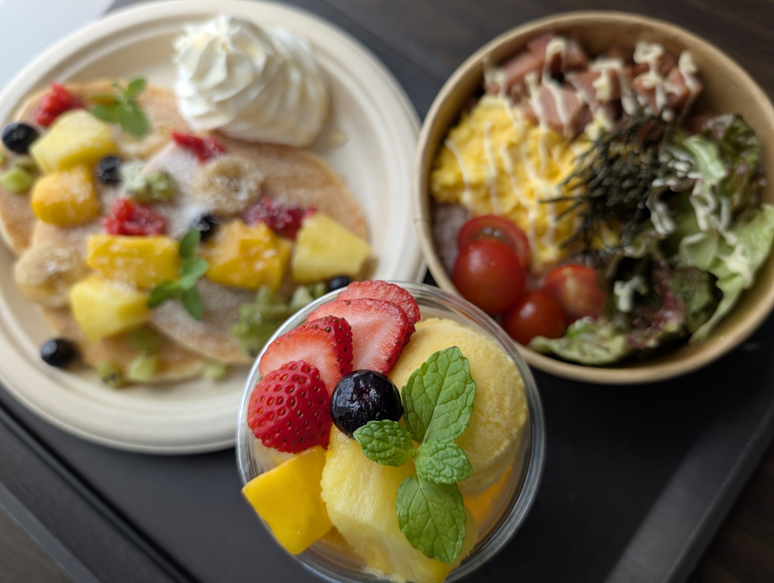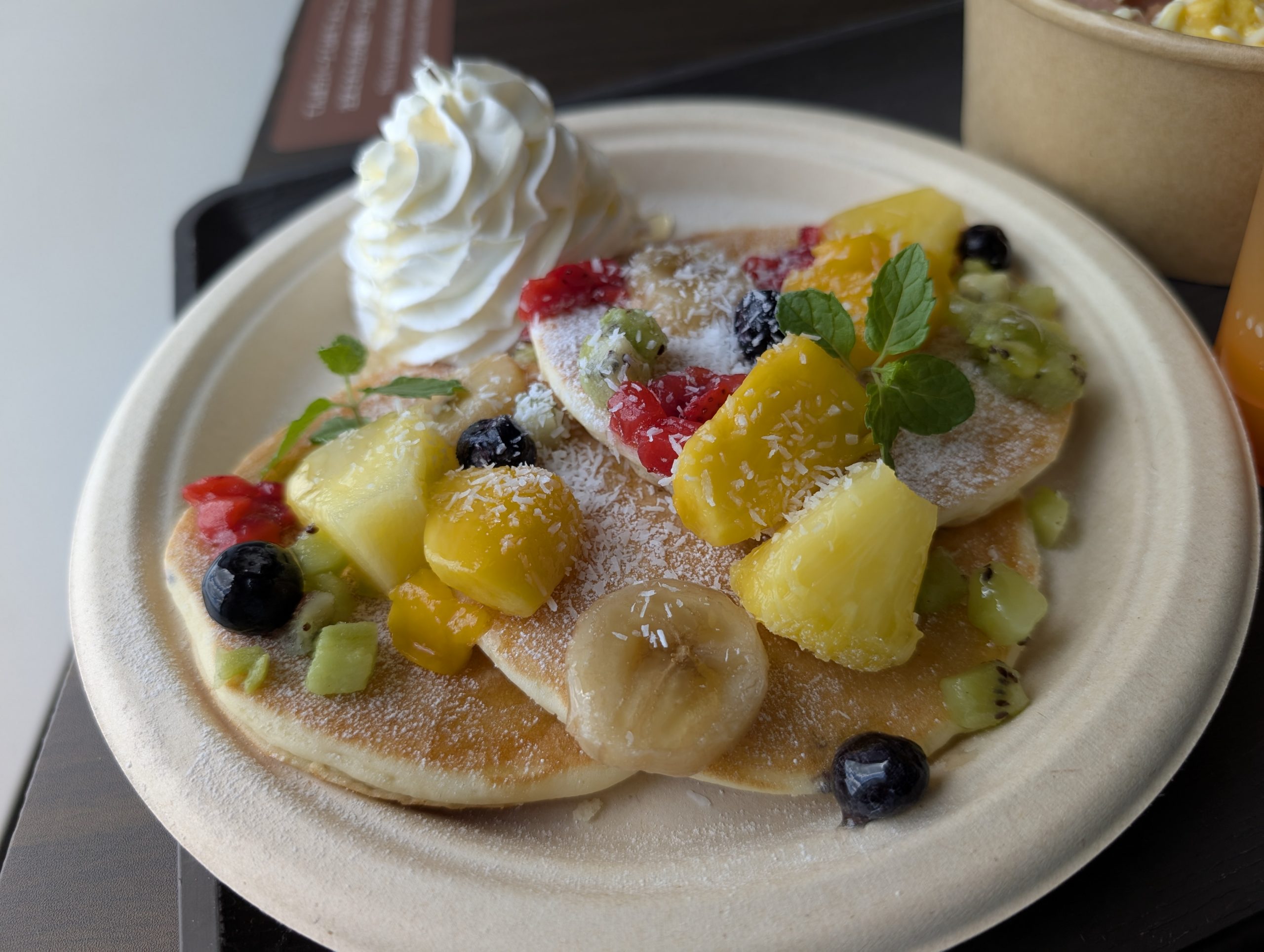 こちらは「空夏パンケーキ」950円。フルーツとクリームがたっぷりのパンケーキですが、フロマージュがさっぱりとしてくれるので最後まで食べやすい一皿となっています。たくさんのフルーツとココナッツが南国気分を演出してくれます。甘いけれど爽やかな風味で満足度が高いです。