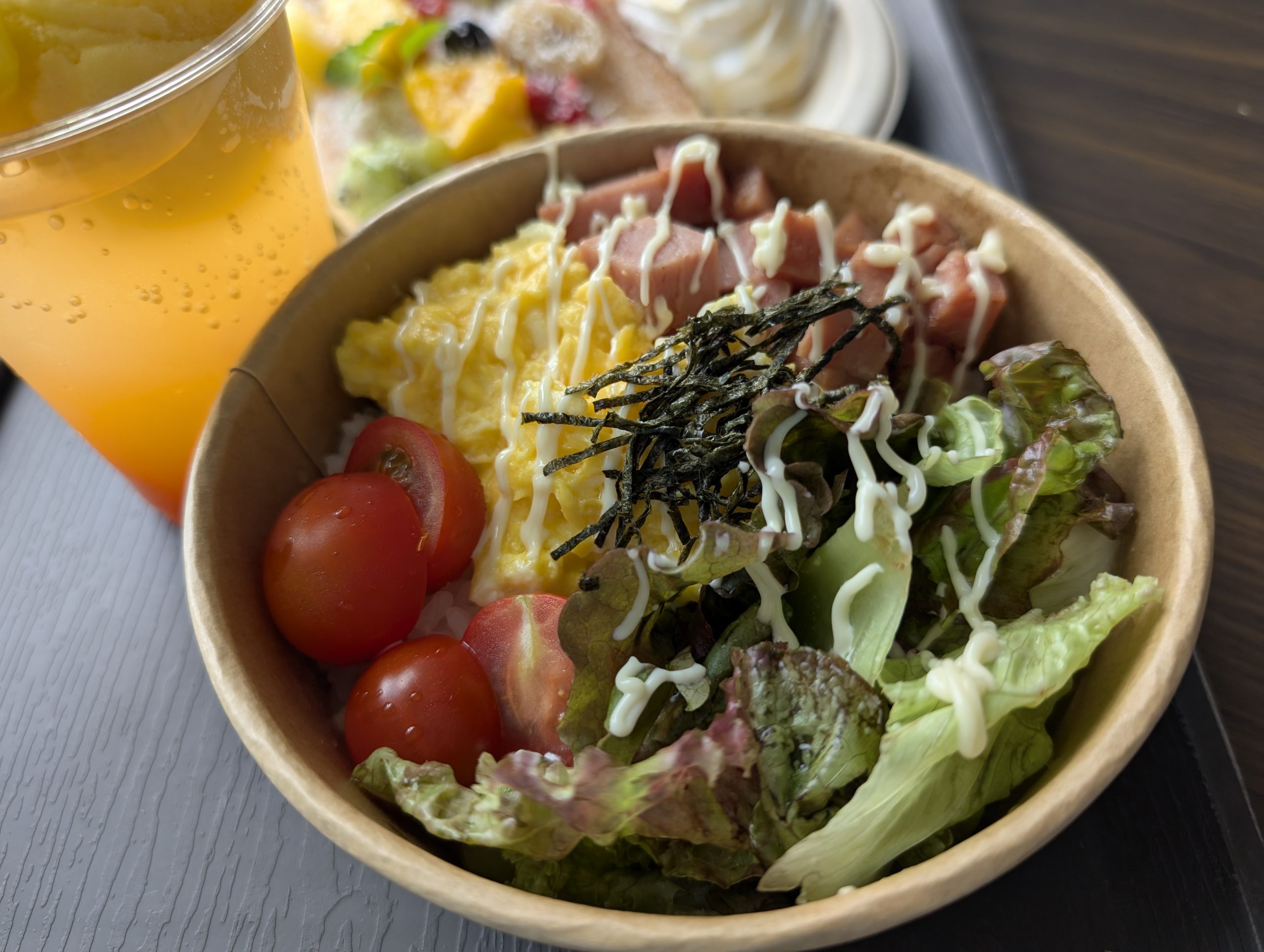 そしてガッツリ食事系「てりやきスパム丼」950円。人気のスパムをどんぶりにしたもので、スパムはサイコロ状に食べやすくカットされているほか、てりやきソースと卵との相性もバッチリ! 間違いないウマさ!