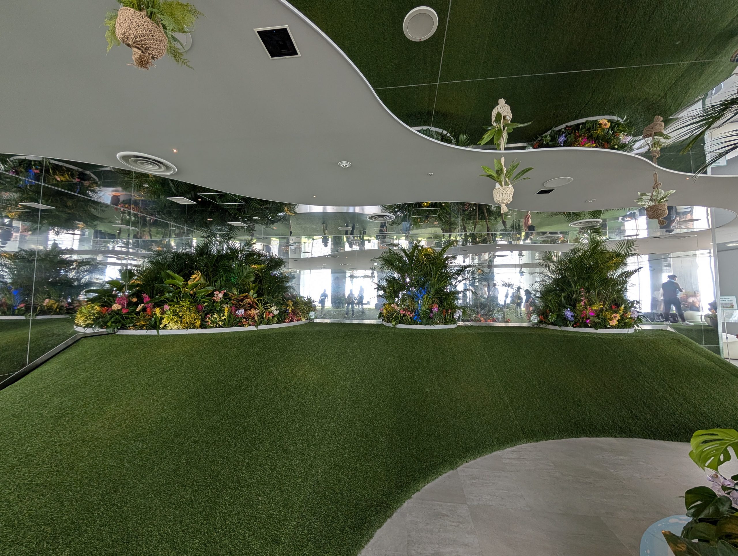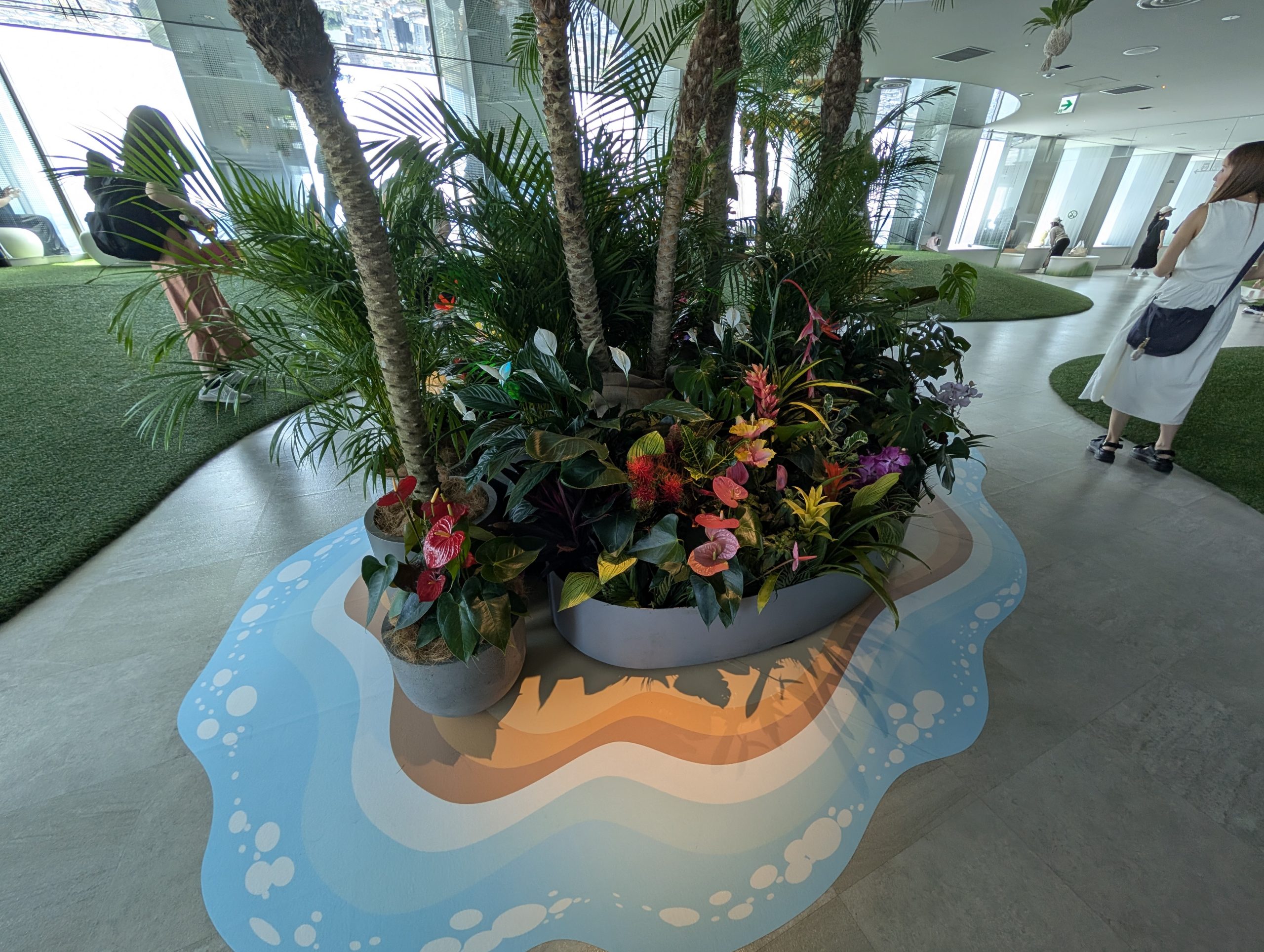 到着すると、おなじみのエントランスもハワイアン仕様に! ハワイをイメージしたカラフルな南国の花々とヤシの木々に囲まれた館内に様変わいて、暑さを気にせず夏らしい“映える”写真撮影が楽しめます。ハワイの伝統的な首飾り「レイ」を着けて写真が撮れるフォトスポットも設置。