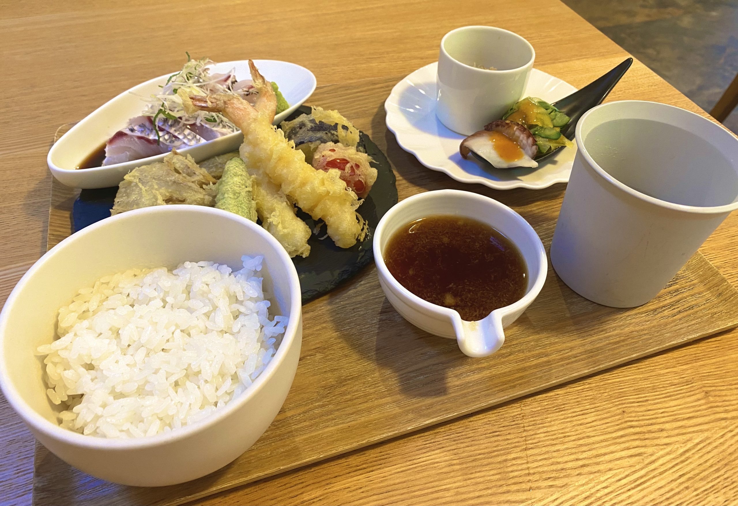 ▲天ぷらと刺身(鯛)。 天ぷらでかーっ!これひとつでも定食になるような豪華さ。
