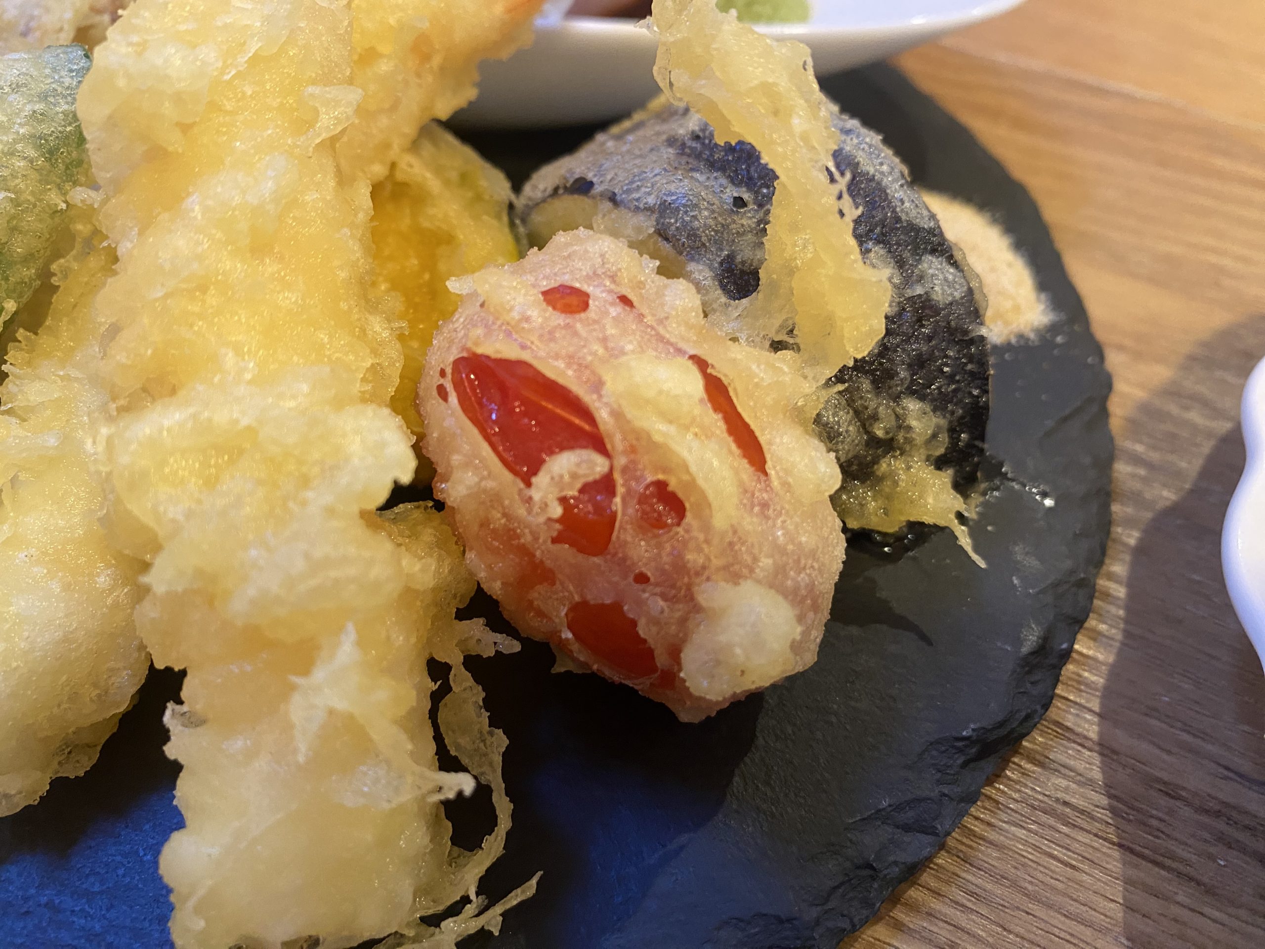 トマトの天ぷらは珍しく、サクッとした衣から旨みがジュワッと。