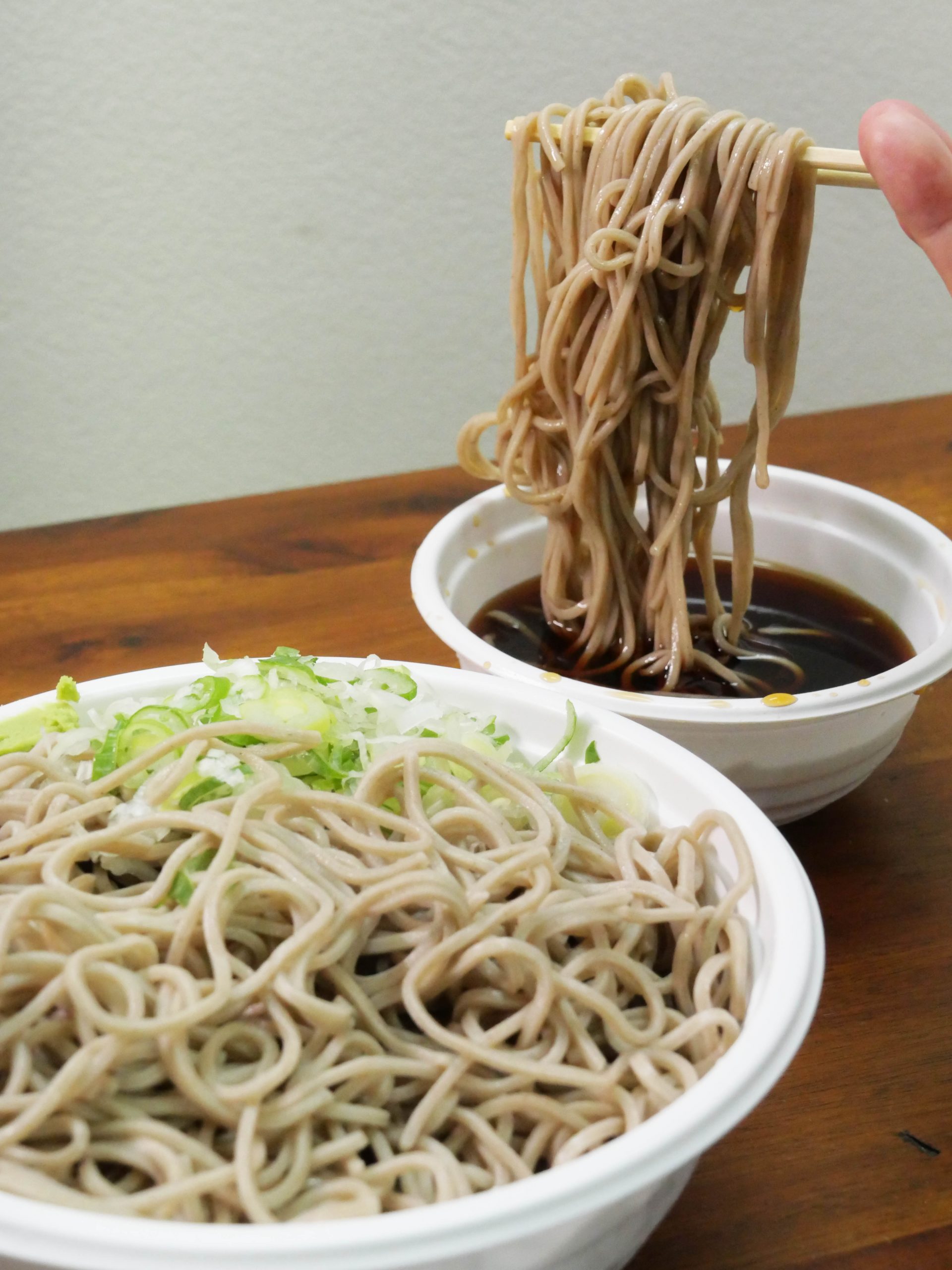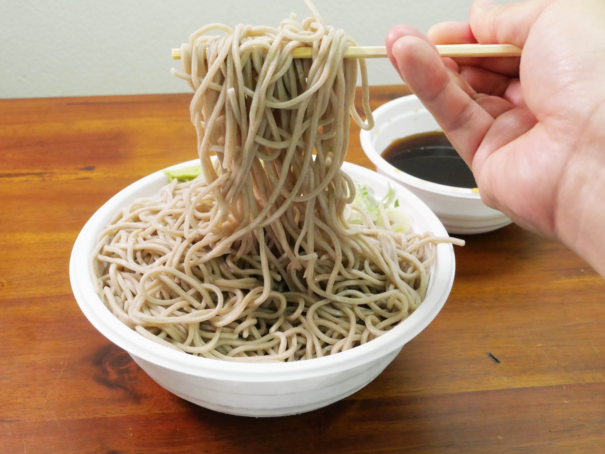 ネギも多めに入っているように見えます。しっかりとワサビもついています。さっそくそばをサルベージして、汁に浸して食べたのですが、これが最高オブ最高。富士そばクオリティの食感と旨味と薫りが楽しめるそば、おいしいです!