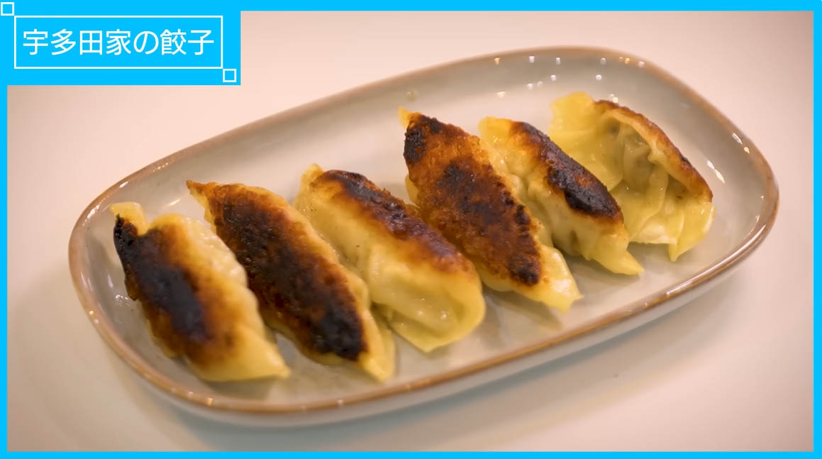 「宇多田家の餃子」のレシピの詳細は動画で確認してほしいが、生姜、醤油、紹興酒、ごま油、鶏がらスープの素、甜菜糖、豚ひき肉、塩、胡椒、キャベツ、ニラ、ねぎ、菜種油、ゴマ油、ピザ用チーズを使用するようである。