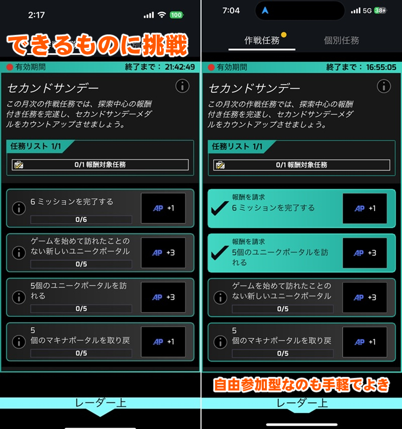 毎月第2土曜日に開催されるセカンドサンデーには、“5個のマキナポータルを取り戻す”や“5個のユニークポータルを訪れる”など4つのタスクがあり、そのなかからひとつ以上を達成するとセカンドサンデーの実績メダルがカウントされる。