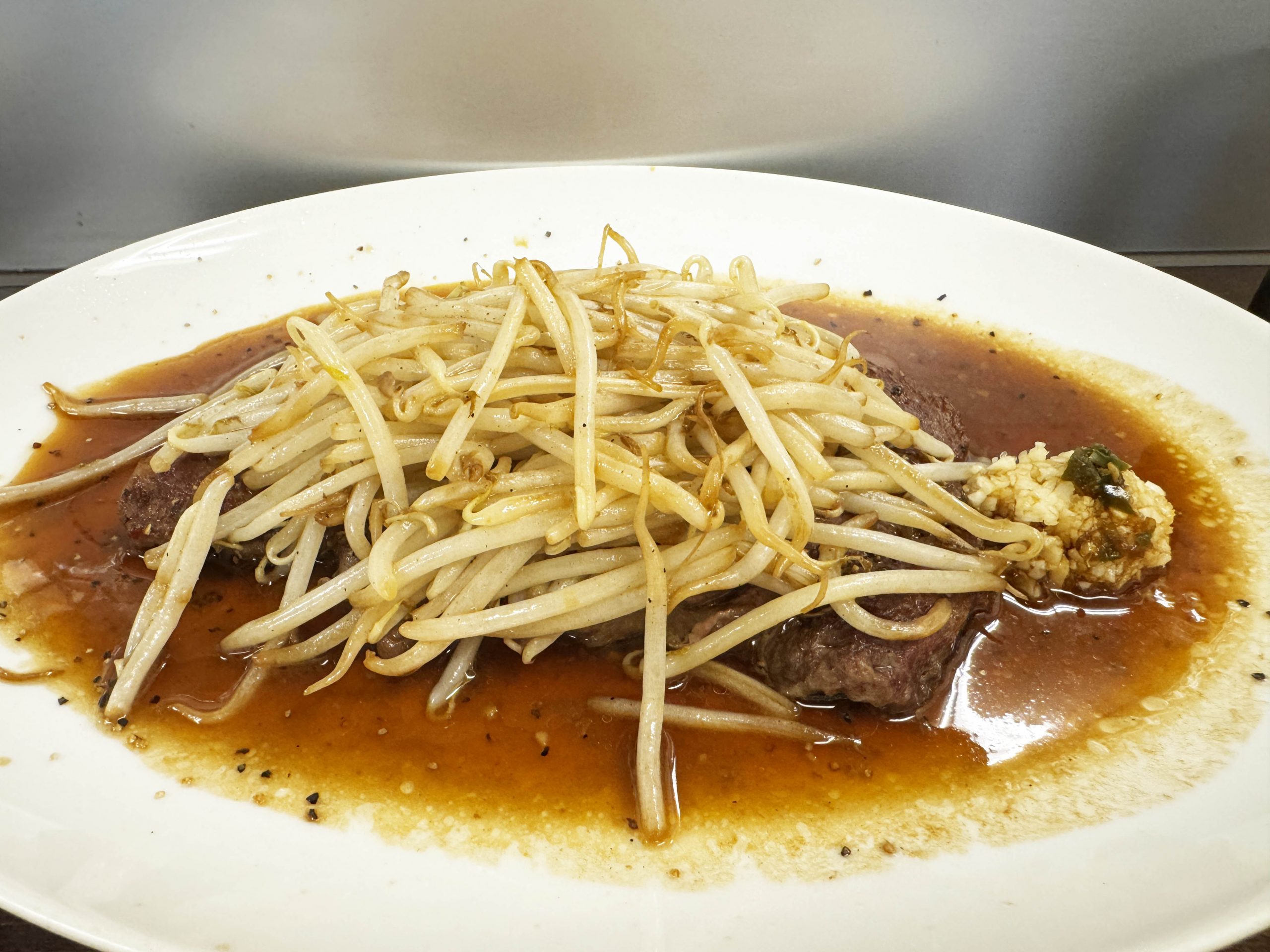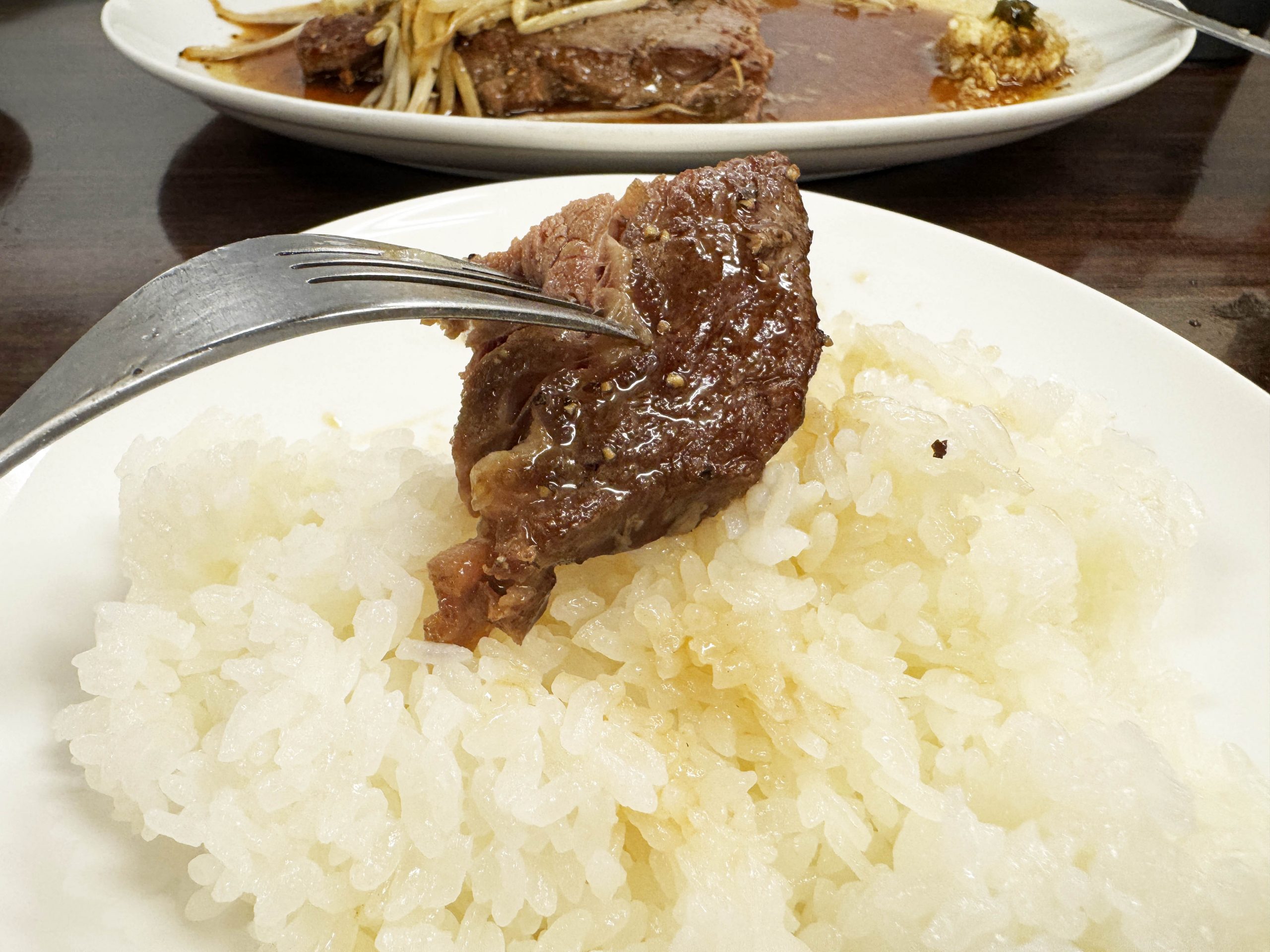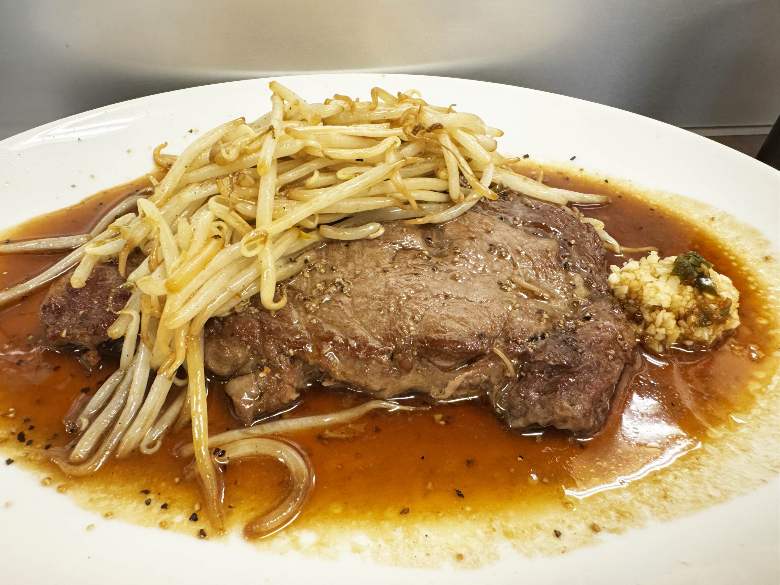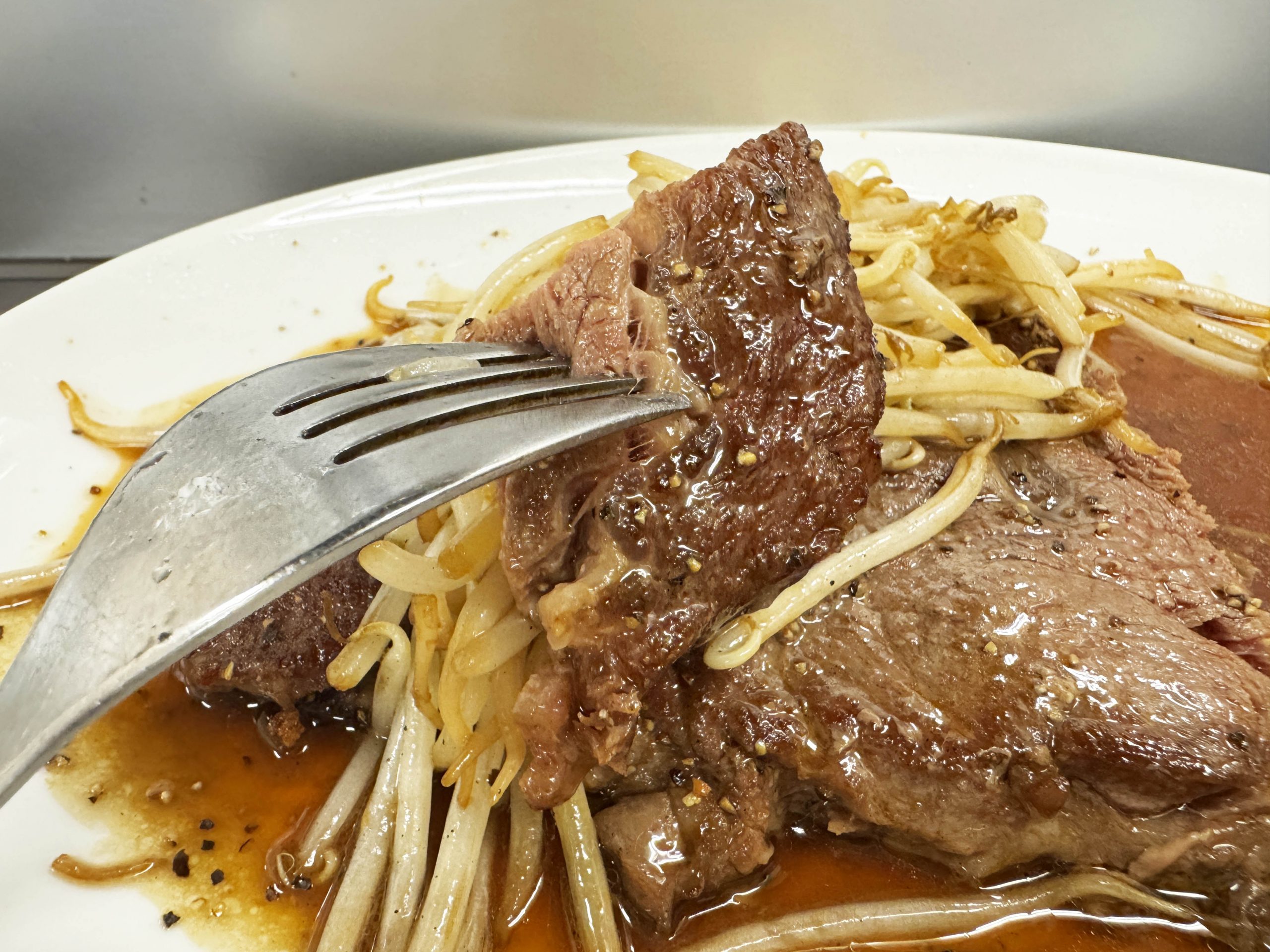 ナイフで切ろうとすると、確かに、けっこう硬い。力を強くこめて「ギリギリッ!」と切っていく。勢い余ってステーキやモヤシをフッ飛ばさないように気をつけたい。いつもなら、硬めのステーキでも、やや大きめにカットして、よく噛んで食べることが多いのだが、「これは気をつけたほうがいいよ!」と脳内にシグナルが流れてきたので、慎重に、いつも以上に小さくカット。