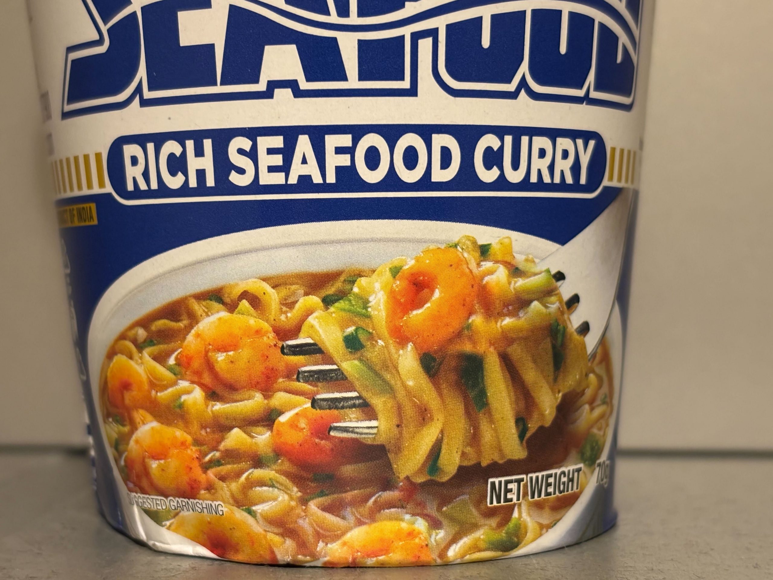 しかし、よく写真を見てみるとスープが白くなく茶色い。「シーフードヌードル」といえば白湯スープがおなじみだが、どう考えても茶色になっている。その上の文字をよく見ると「RICH SEAFOOD CURRY」とある。そう、カレー味なのである。