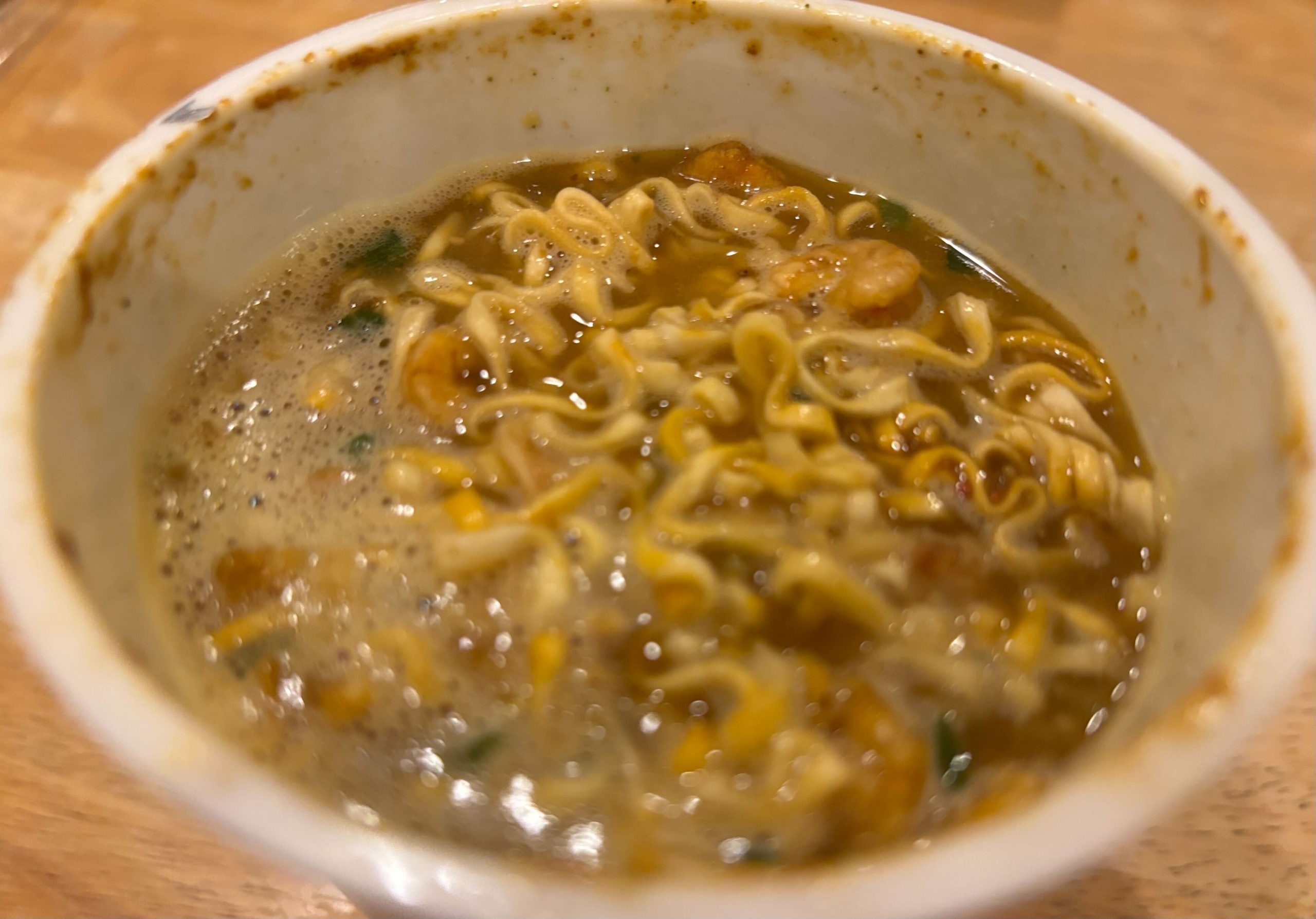 日本の「カップヌードル」同様、フタを開けてお湯を注いで3分待てば完成だ。結構なカレー粉の量で、白湯の雰囲気は全くなく、見た目は完全にカレーだ。そこにトッピングでエビがたくさん入っている。
