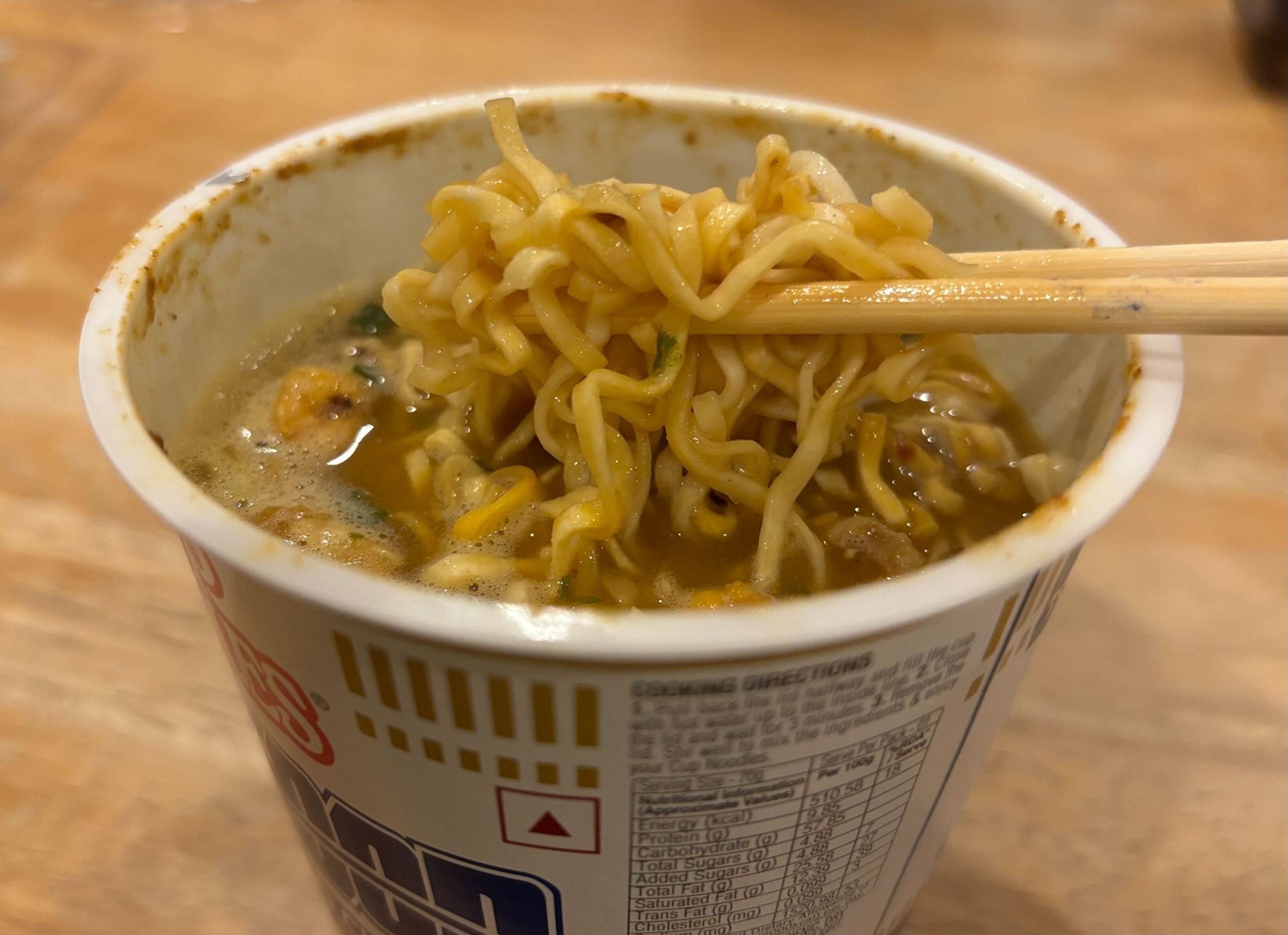 味わいとしては少しライトめな「カレーヌードル」味。そこにたっぷりのエビとネギ、そして日本よりはちょっとかためで縮れの強い麺が絡む。日本よりも麺の主張が強めで、なかなか伸びないのも特徴だ。