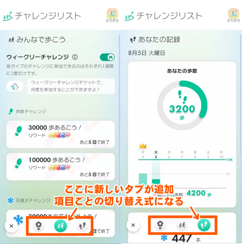 これまで縦スクロールで上から順にたどっていたチャレンジリストの項目が3つに分割され、それぞれを下記に追加されるタブで切り替えられるという仕組みだ。