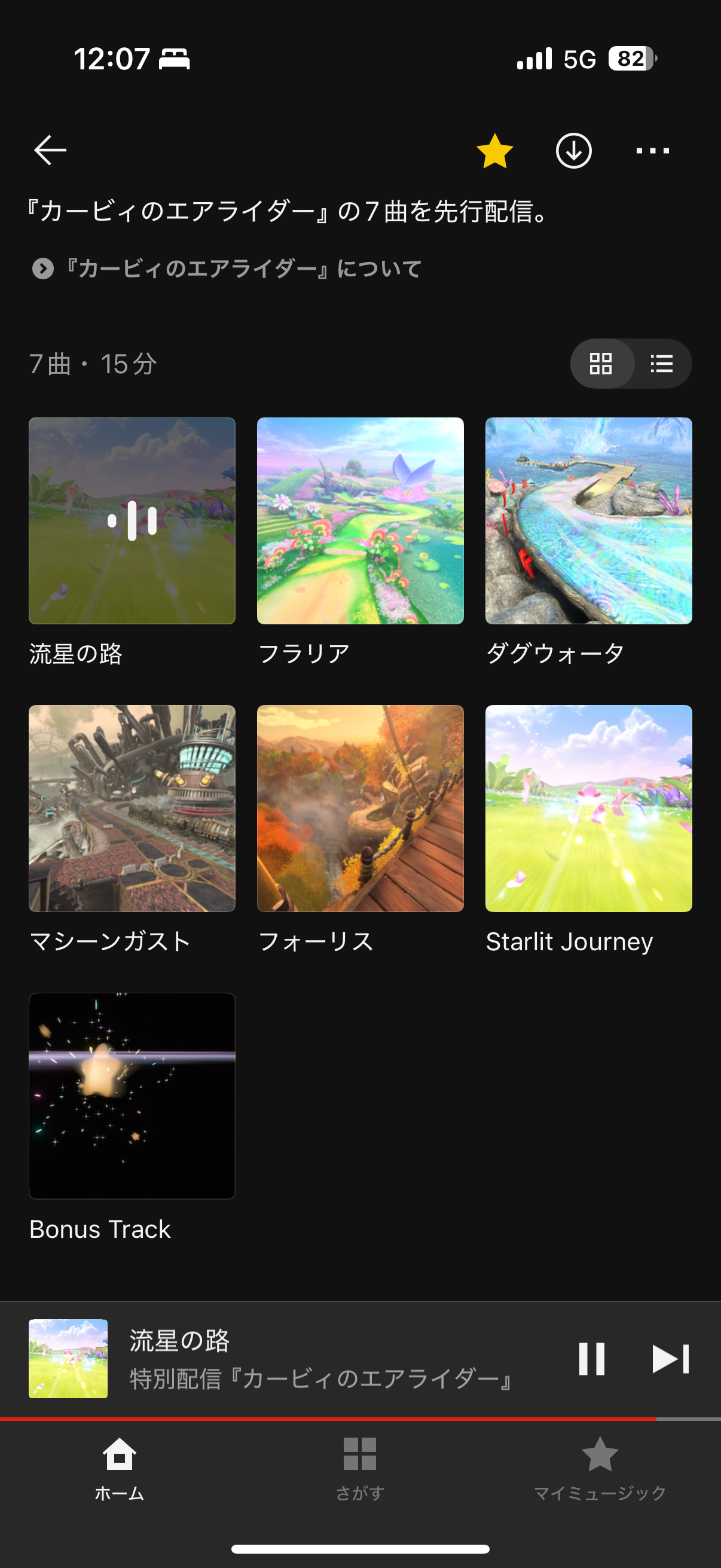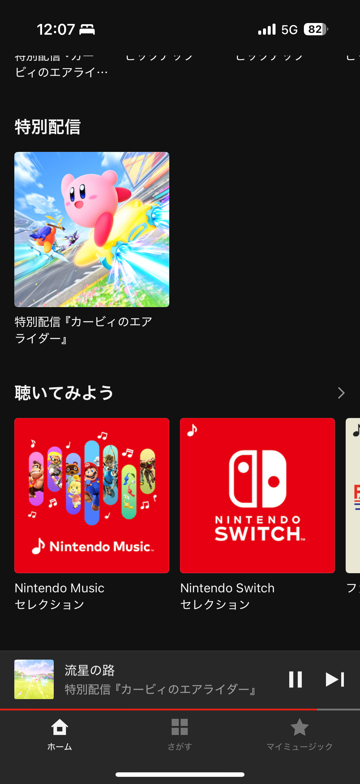カービィのエアライダー楽曲は、Nintendo Musicアプリ内のホーム部分に表示されています。