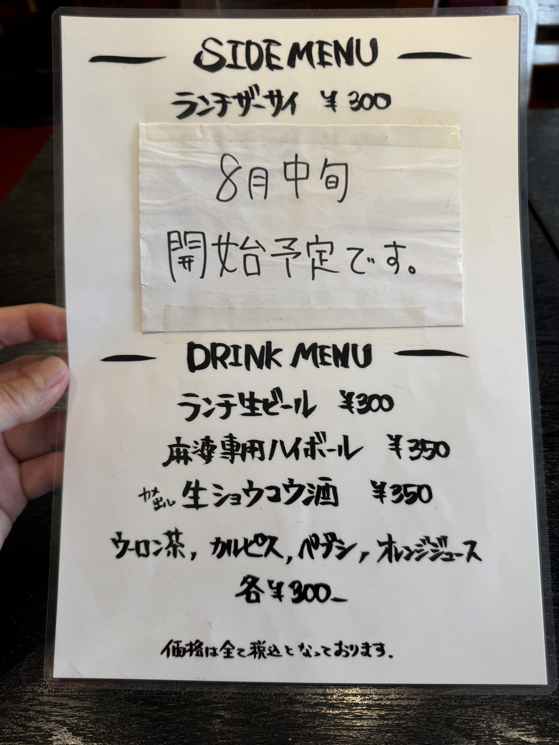 店内に入ると、とても親切な店員さんが出迎えてくれました。椅子がフカフカで座り心地が良いです。お冷とメニューが出されるので、さっそく麻婆豆腐をチェック。ランチタイムとディナータイムでメニューが違うようです。
