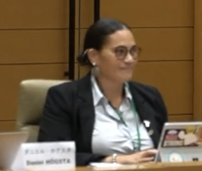 「私は6年前の辛い出来事をきっかけに活動家になった。家族のがんや病気に加え、自分が白血病と診断された時、私は24歳の若い母親だったが、それは単なる不運ではなかった。フランスが1966年から96年にかけて行なった193発の核実験の結果だった。核被害者への正義を求めるため、私は反核活動家になった。真の変革には政治的な行動が必要だと思い、現在私は活動家であり政治家でもある。仏領ポリネシアの国会議員を約2年務めている。」と自己紹介した。その上で「私の最初の立法活動は核兵器禁止条約を支持する決議案の提出だった。決議は57名の議員の全会一致で採択された。私の国にとって歴史的で象徴的な瞬間だった。世界に対して明確なメッサージを発信したのだ。フランスがこの条約を拒否しても、ポリネシアの人々は核軍縮真実と正義のために立ち上がる。