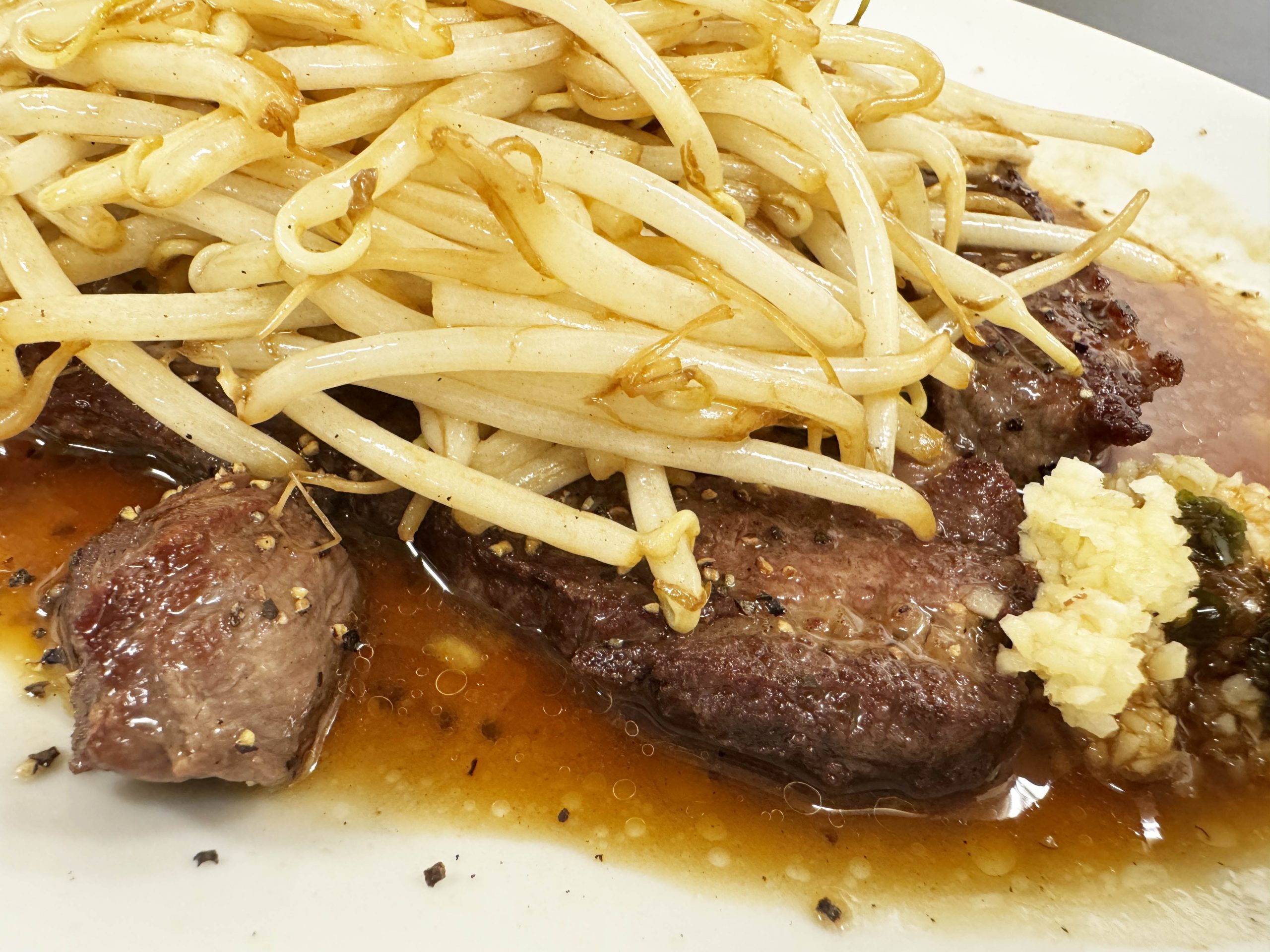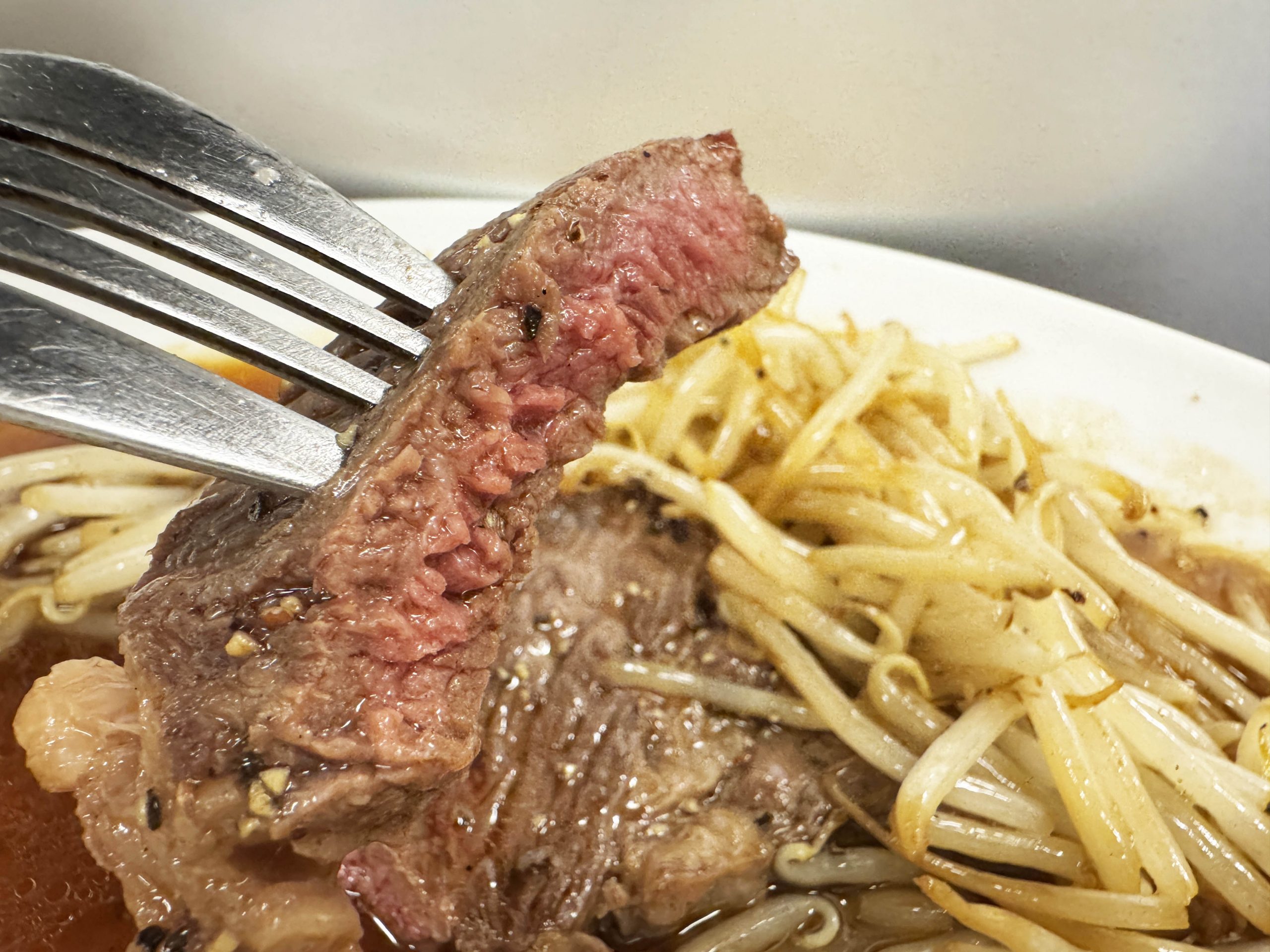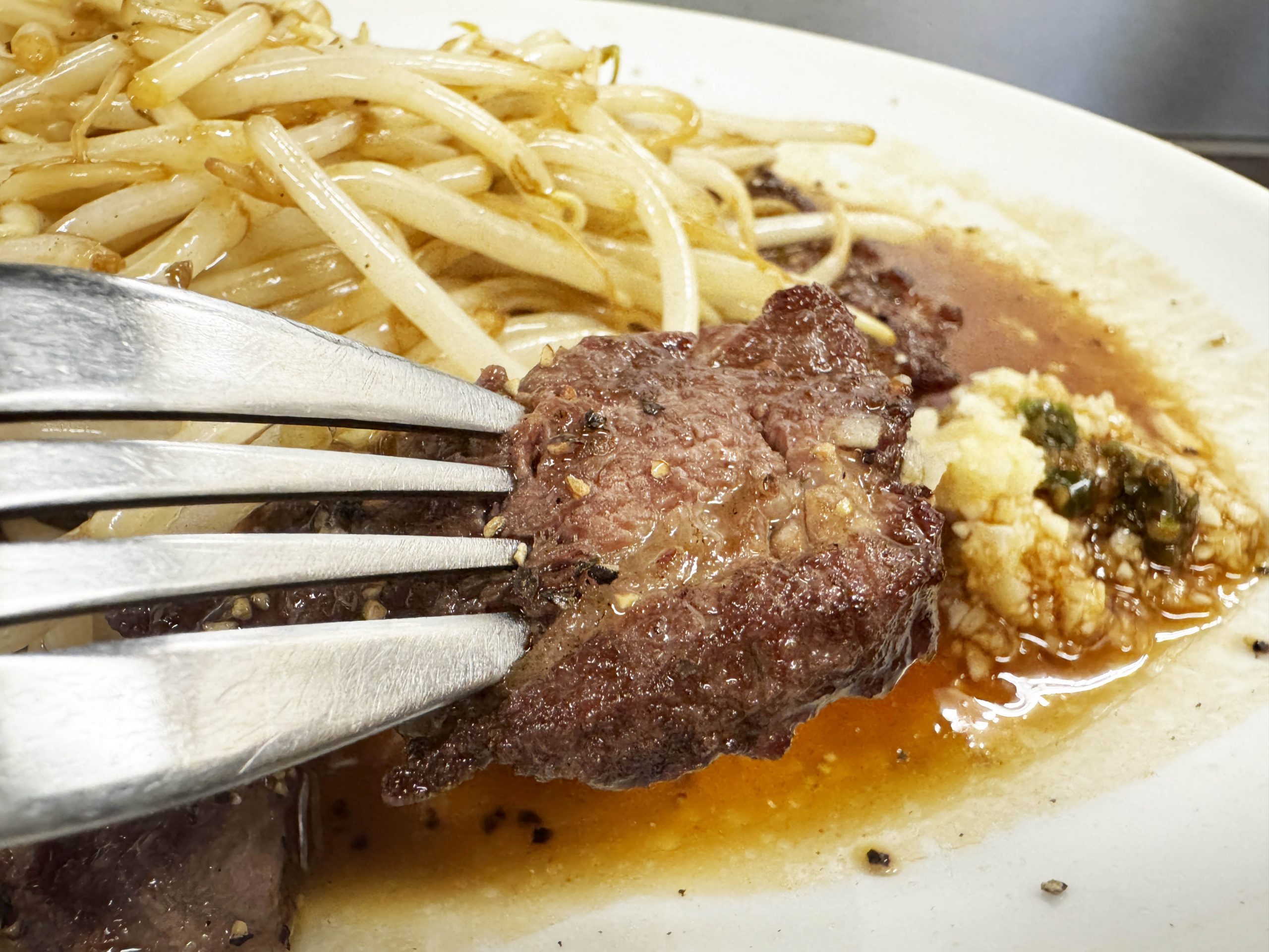 目の前にやってきたアメリカ産リブアイステーキは、ビジュアル的に、通常のステーキと同じ。モヤシが盛られていてステーキが見えないから! モヤシをのけてみると、通常のステーキよりも薄めに切られている気がしました(物足りないという意味ではありません。通常のステーキが極厚すぎるのです)。ナイフを入れると、硬めではありますが、切っていて疲れないレベルの硬さでした。