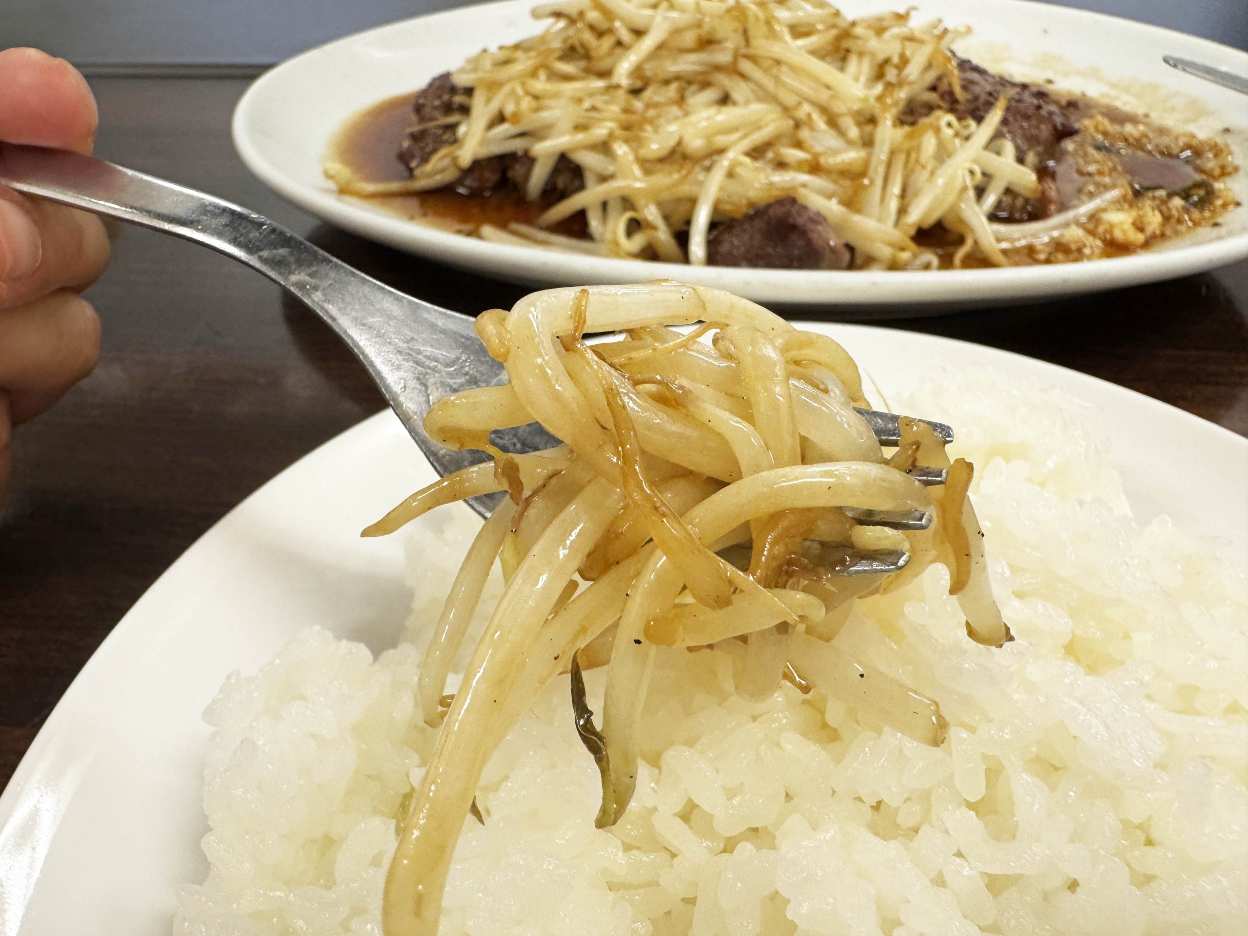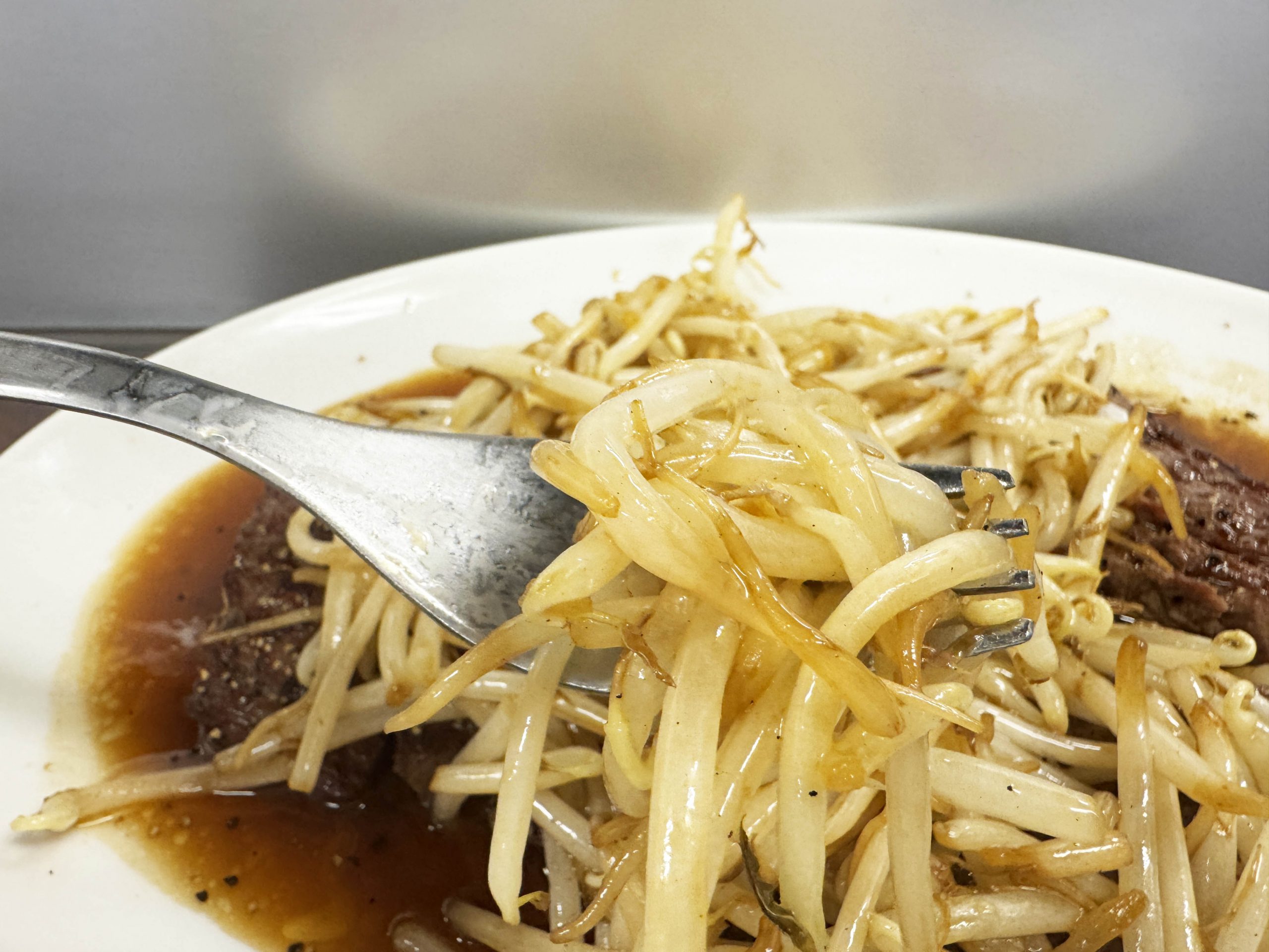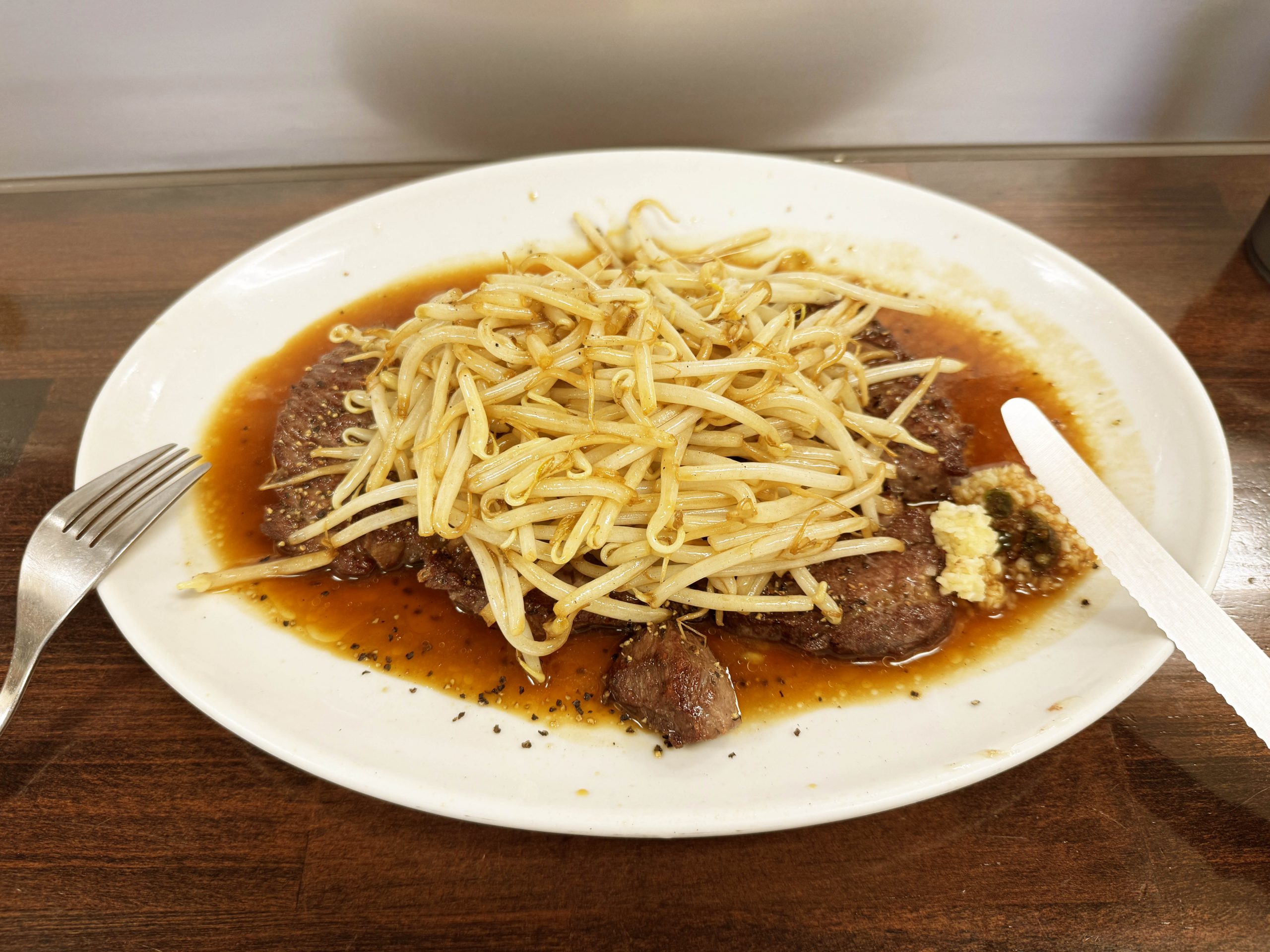 目の前にやってきたアメリカ産リブアイステーキは、ビジュアル的に、通常のステーキと同じ。モヤシが盛られていてステーキが見えないから! モヤシをのけてみると、通常のステーキよりも薄めに切られている気がしました(物足りないという意味ではありません。通常のステーキが極厚すぎるのです)。ナイフを入れると、硬めではありますが、切っていて疲れないレベルの硬さでした。